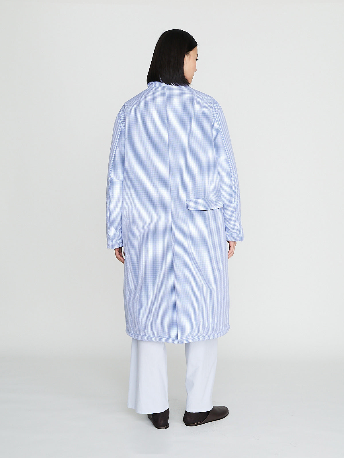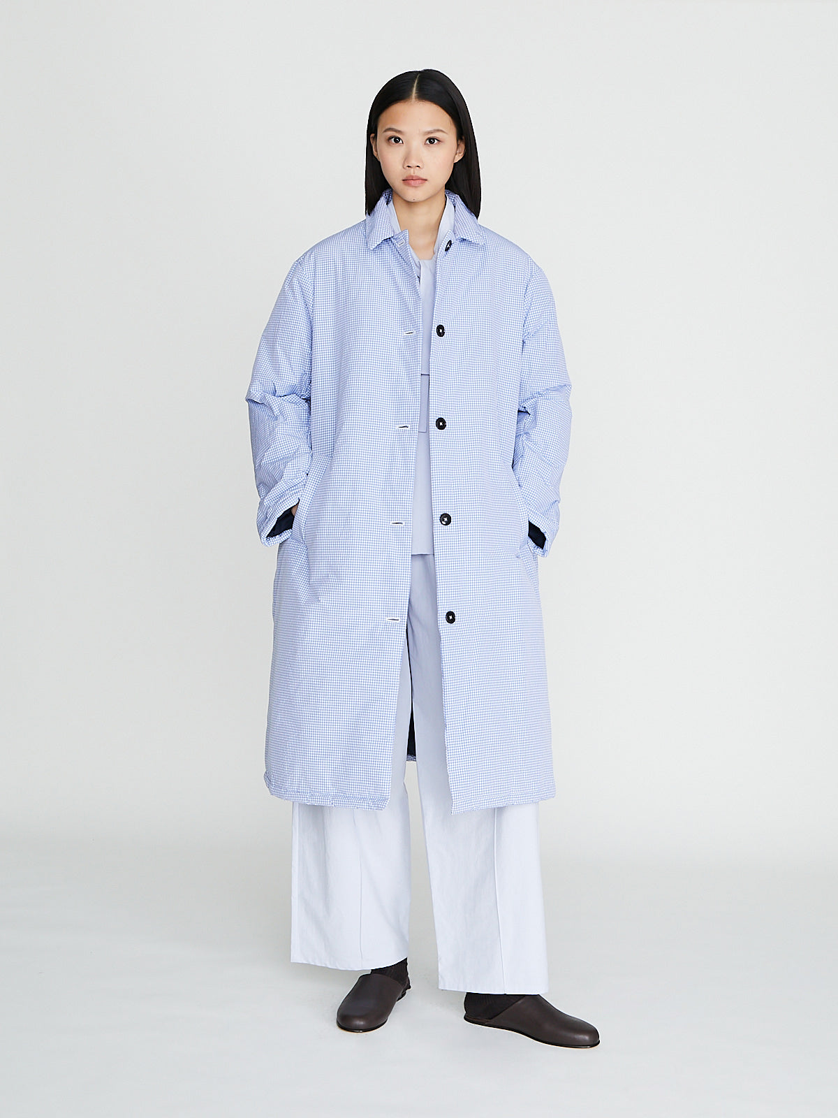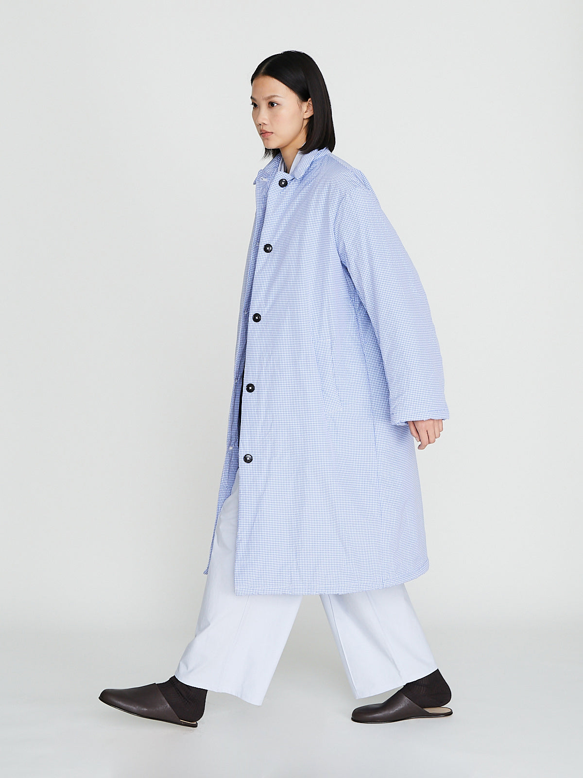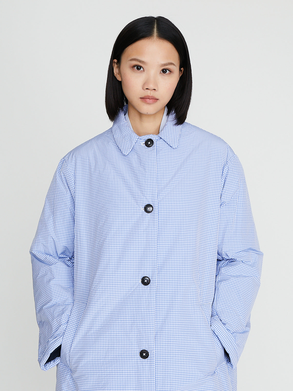 Oversized puff coat crafted from a padded technical light blue fabric with an all-over blue check. Short collar, front button fastening and long sleeves with a dropped shoulder. Welted slip pockets on the front and a single flap pocket on the back. Features a back vent. Subtle cocoon silhouette. Lined in navy cotton.