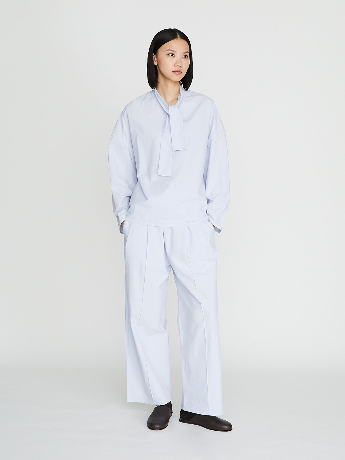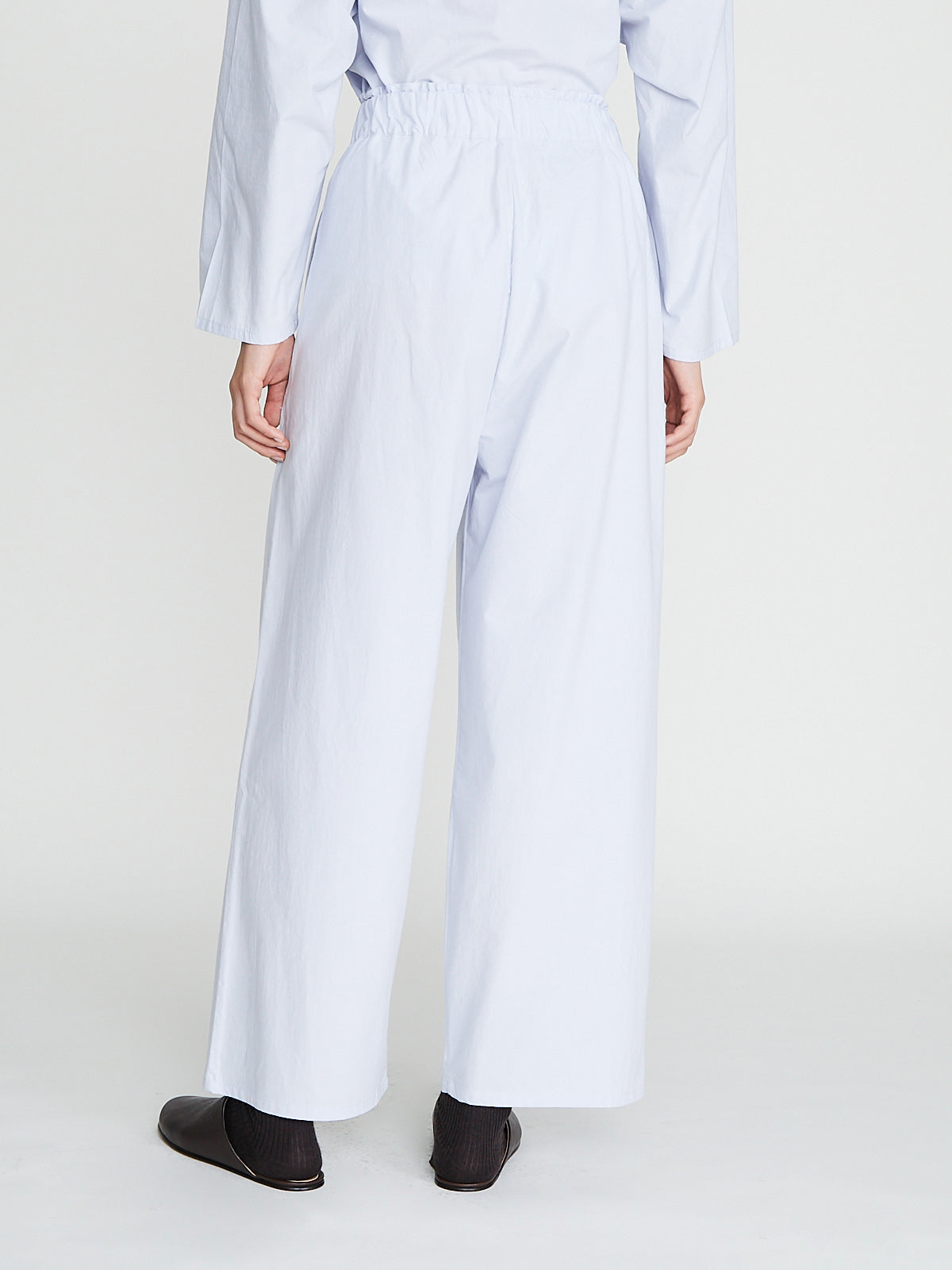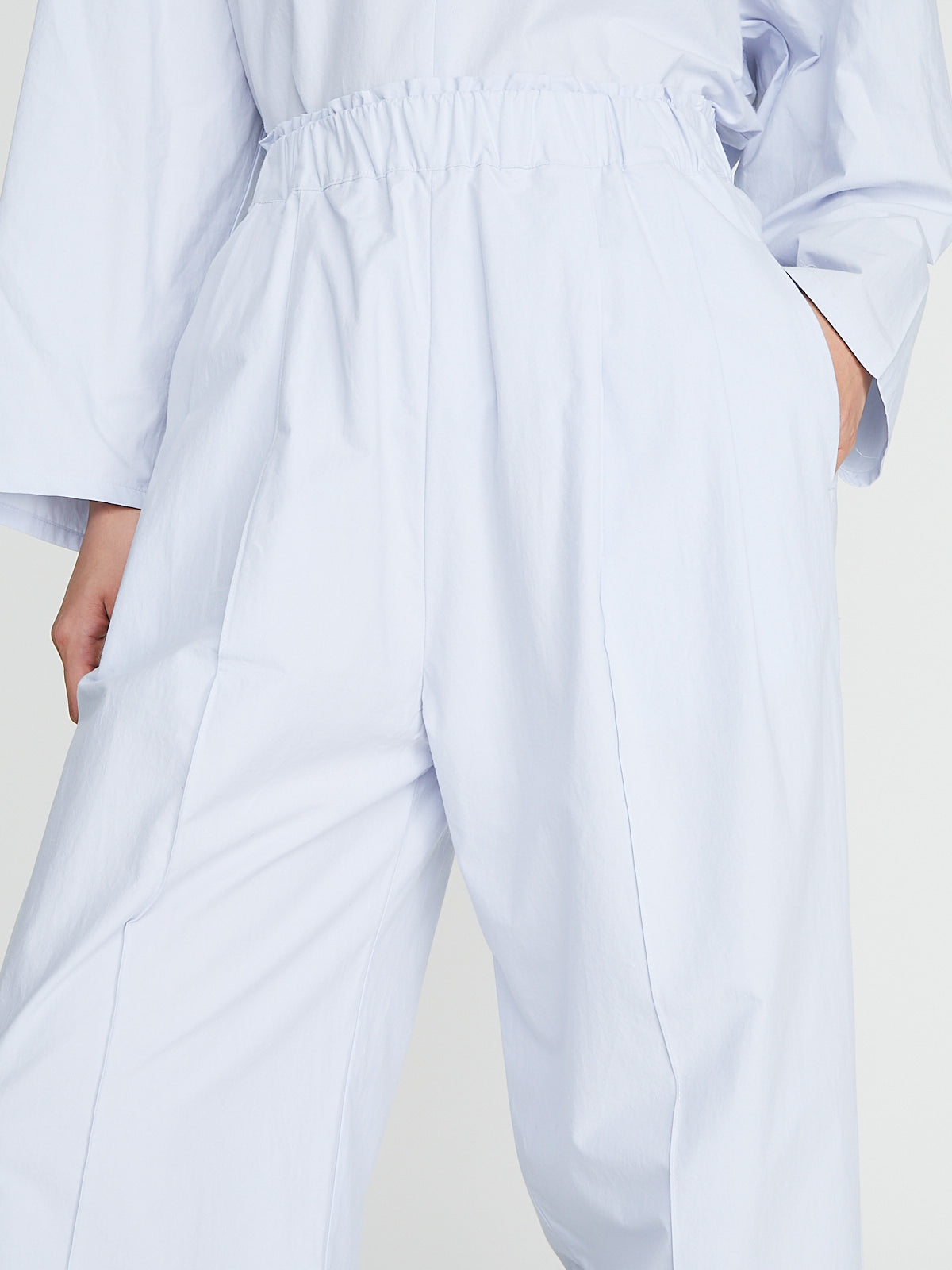 Wide leg trouser in light blue cotton. Pull-on style with an elasticated waistband and side seam pockets. Pintuck detailing at the front.