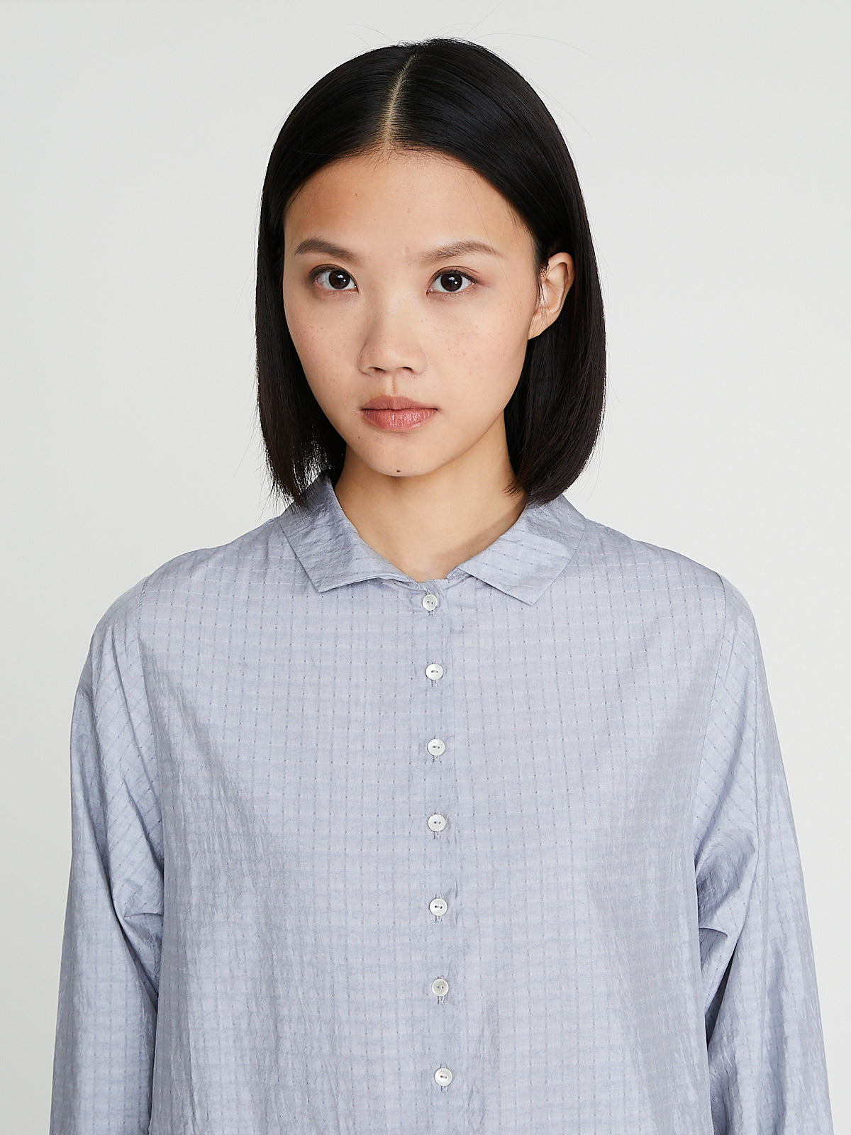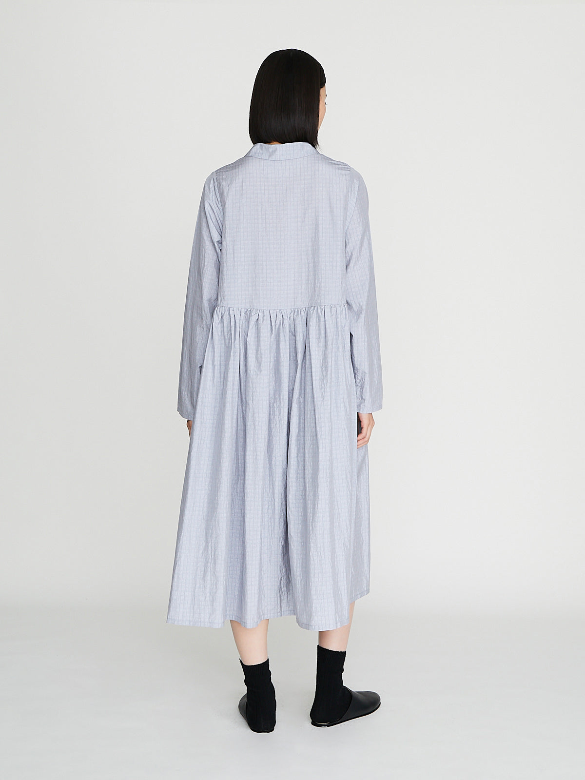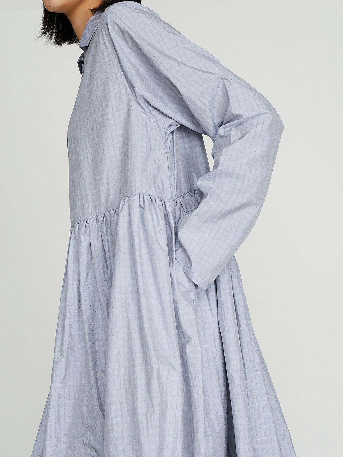Shirt dress in grey silk blend. Spread collar, front button fastening and long sleeves. Features a gathered skirt. Side seam pockets. Relaxed fit.