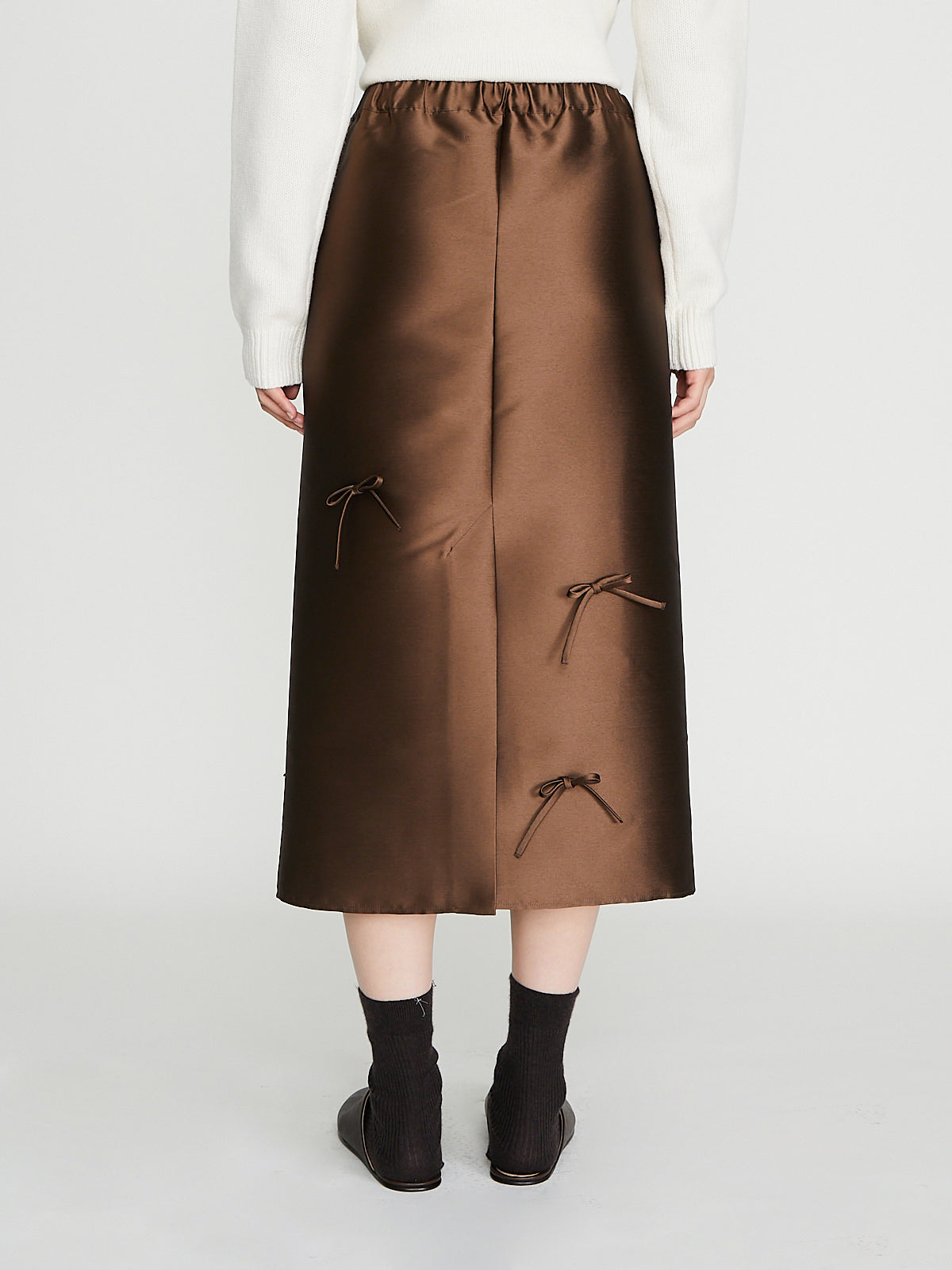 A-line skirt in shiny slightly stiff brown polyester. Pull-on style with an elasticated waistband and a back vent. Side seam pockets. Features a delicate bow details scattered across the skirt.