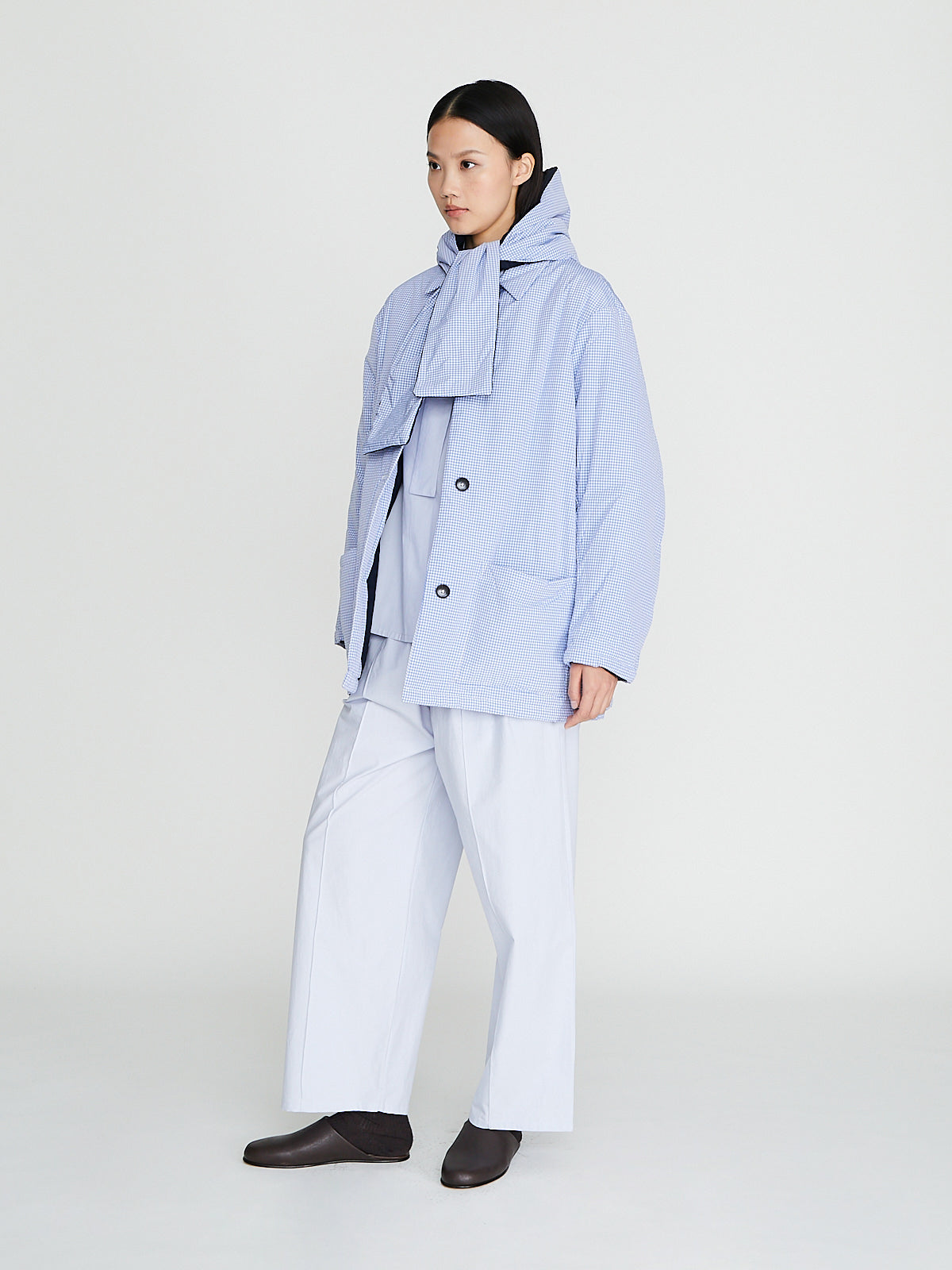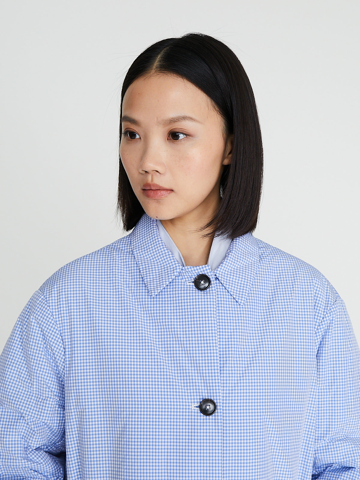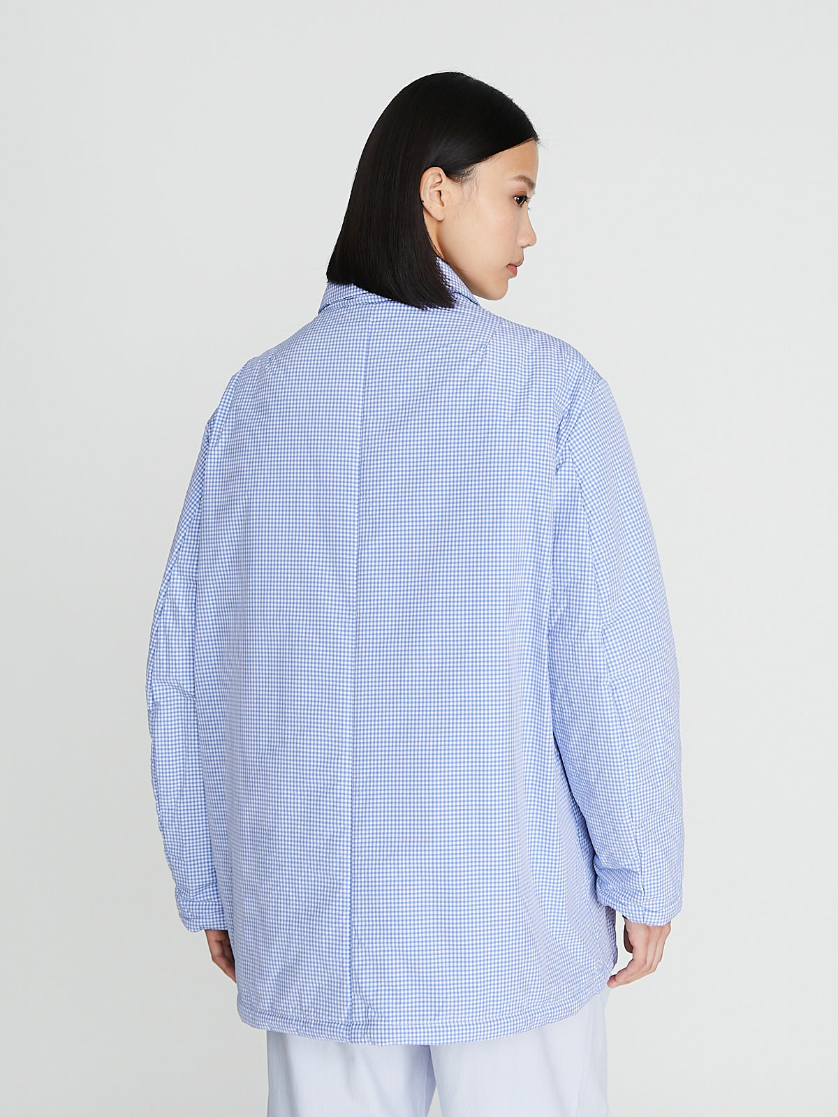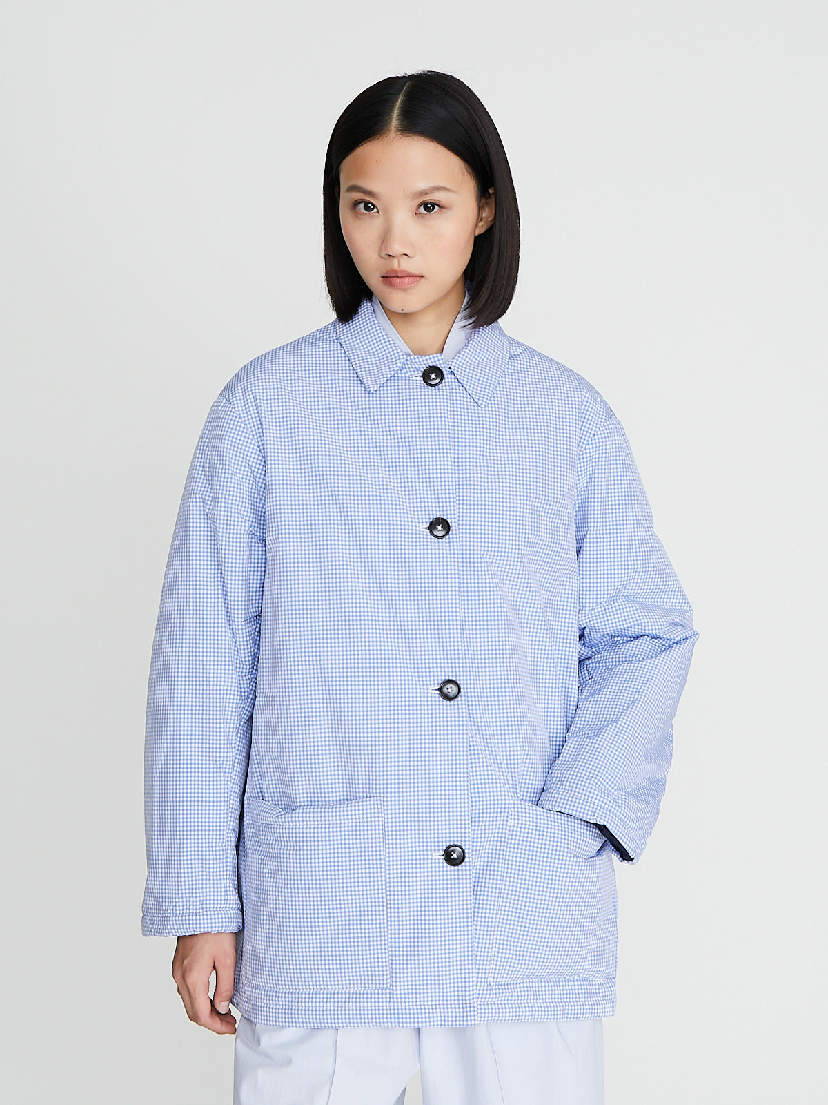 Oversized short puff coat crafted from a padded technical light blue fabric with an all-over blue check. Short collar, front button fastening and long sleeves with a dropped shoulder. Patch pockets on the front. Lined in navy cotton.