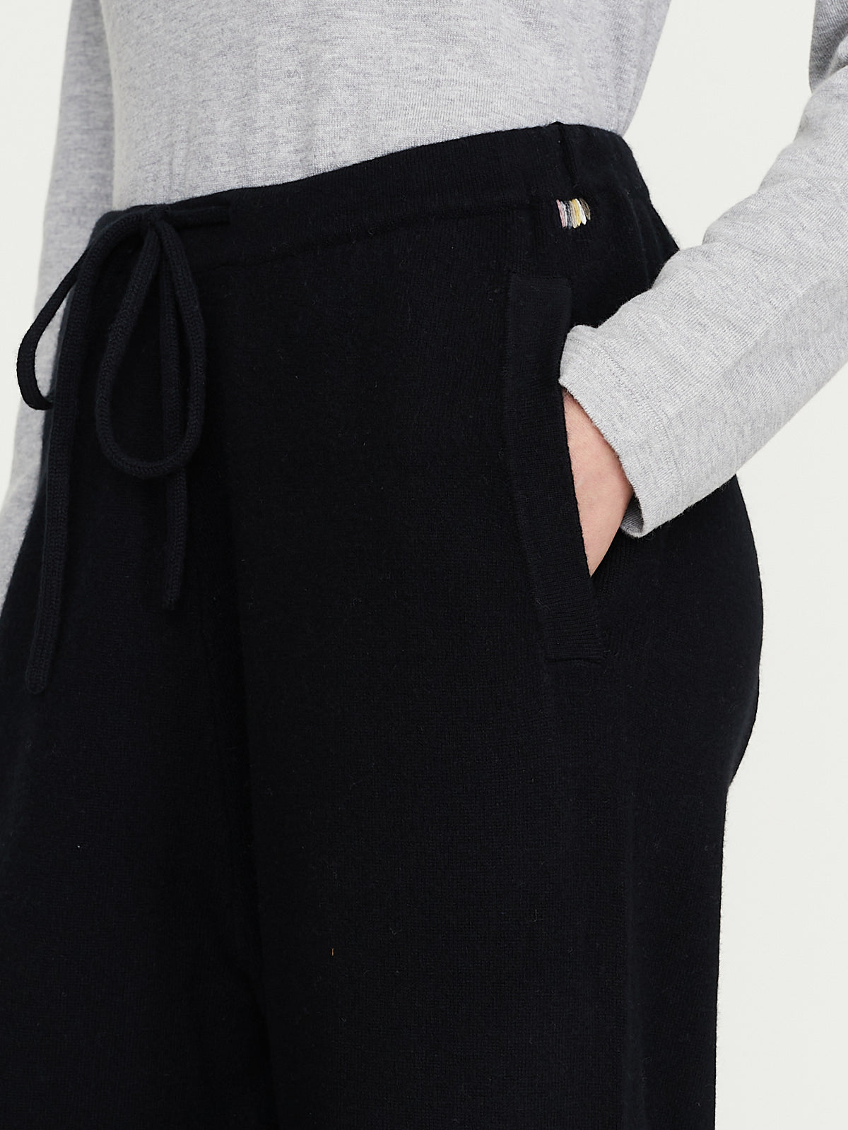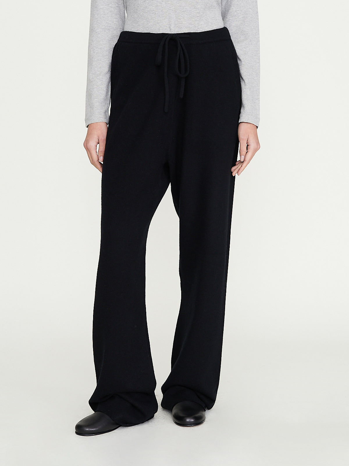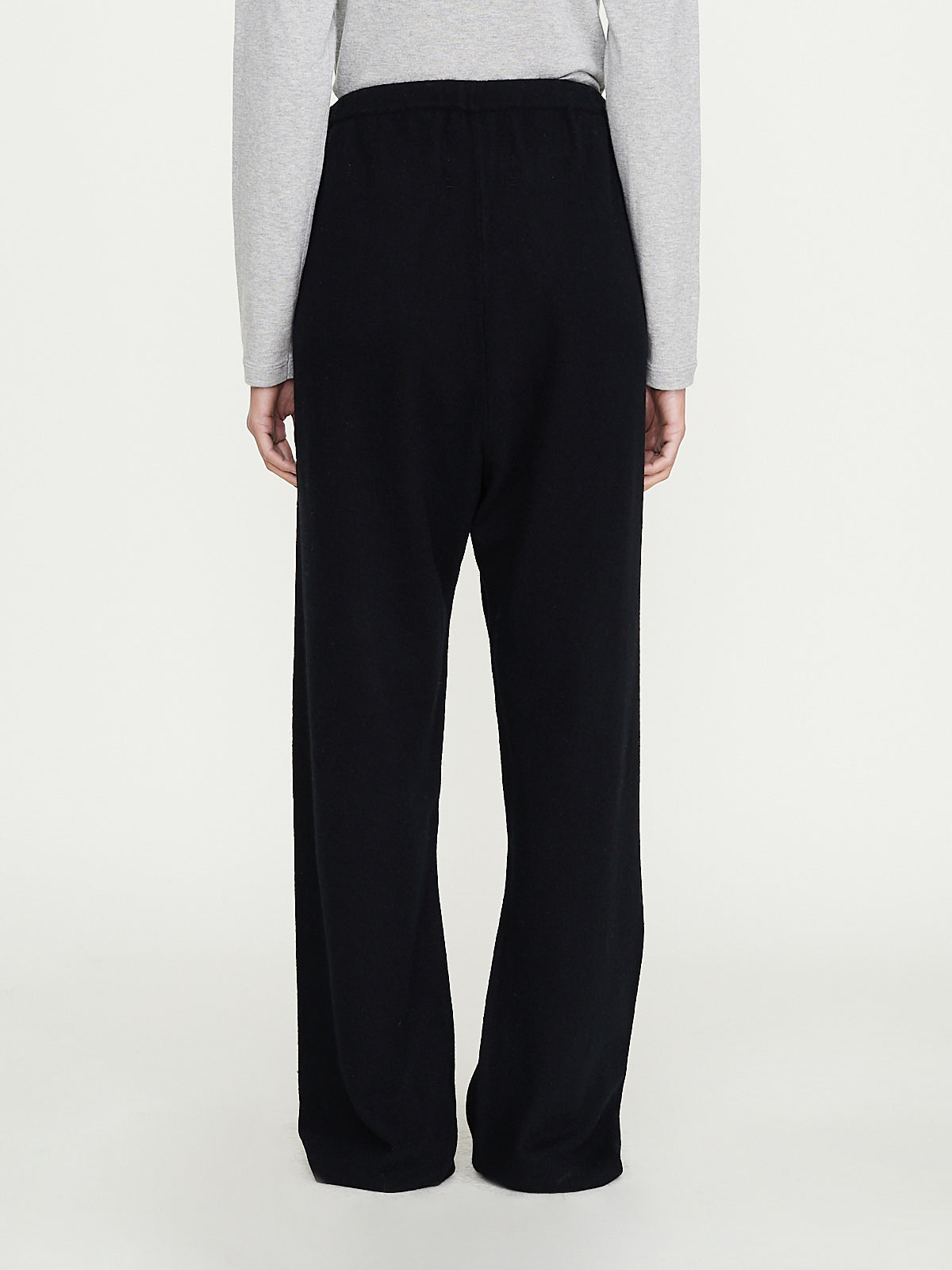 Relaxed wide-leg trouser in a black cashmere blend. Pull-on style with an elasticated waistband and a drawstring fastening. Features two slit pockets and raw bottom hem that can be cut to desirable length.