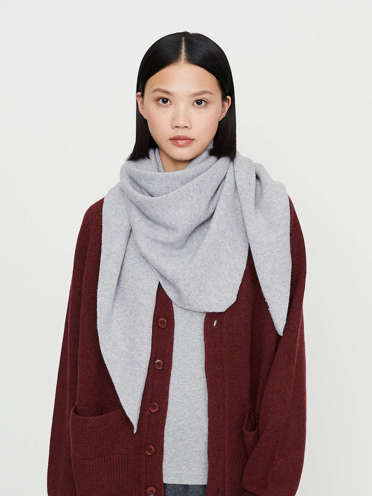 Knitted scarf in heavy-knit grey cashmere. Triangle-shaped and with rolled hems throughout. Features Extreme Cashmere’s signature multi-coloured stitching detail.