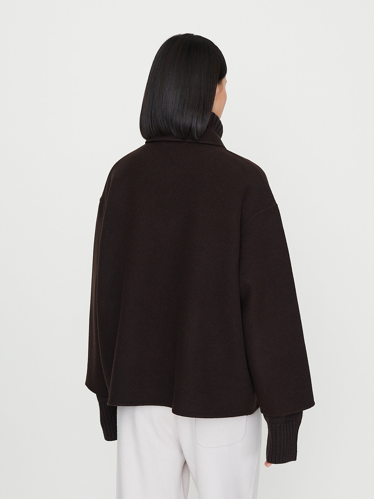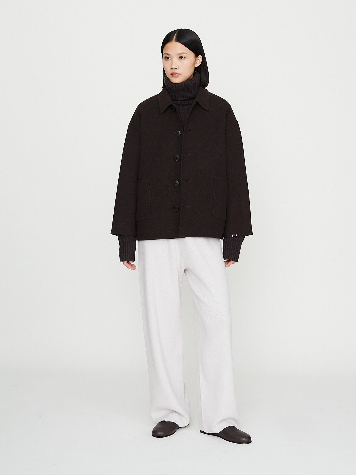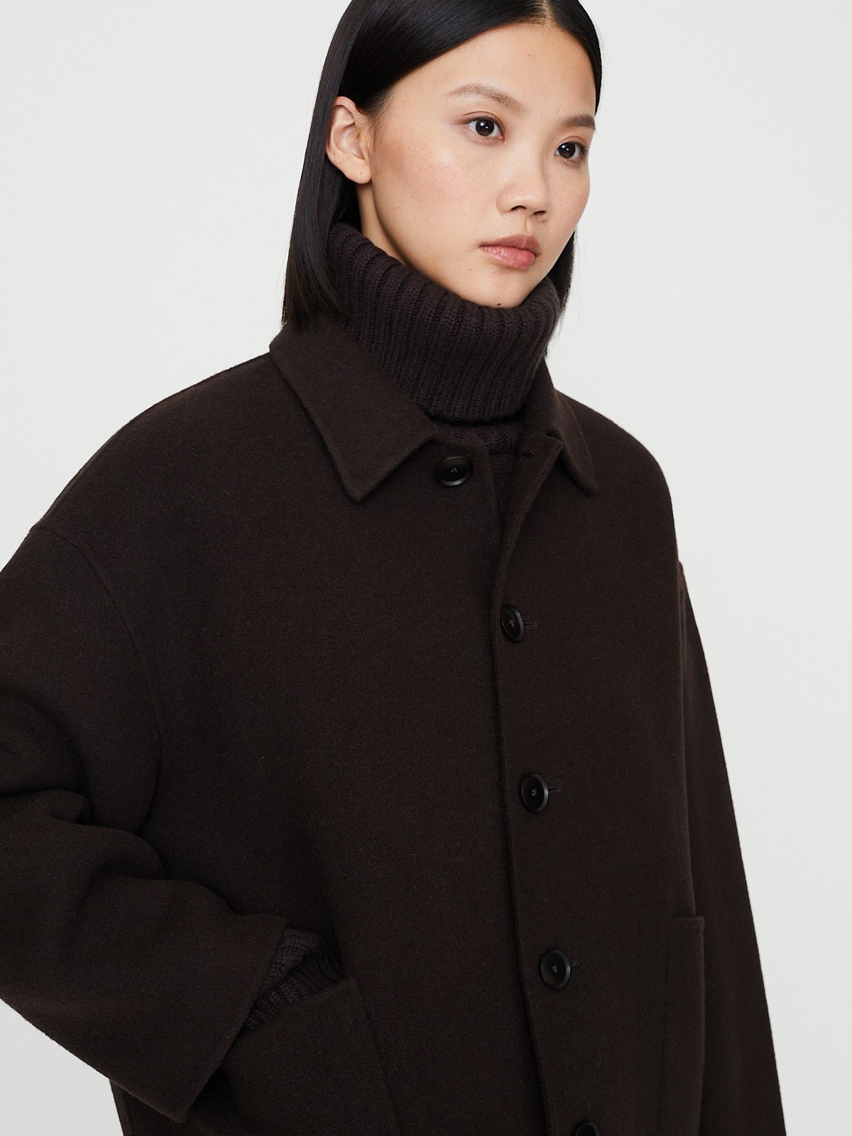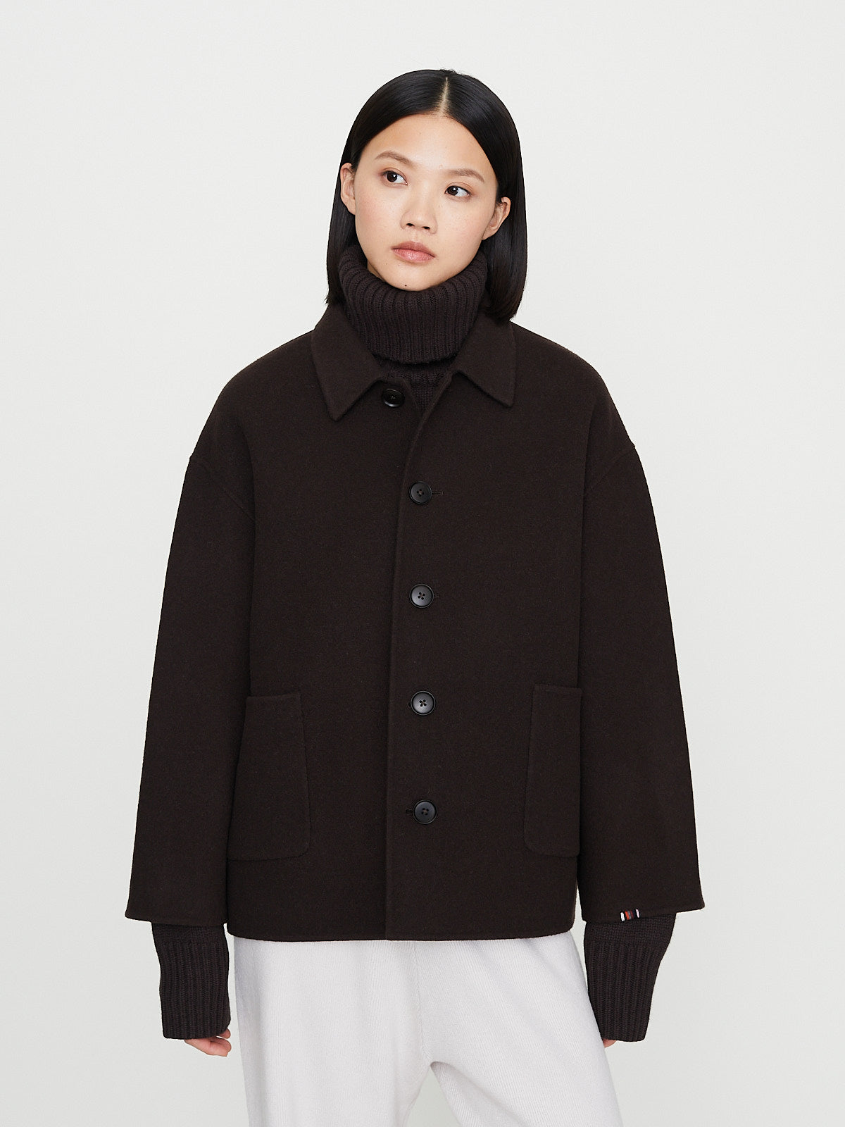 Boxy chore jacket in dark brown double-faced wool/cashmere. Pointed collar, front corozo button fastening and bracelet sleeves with a dropped shoulder. Patch pockets on the front. Unisex.