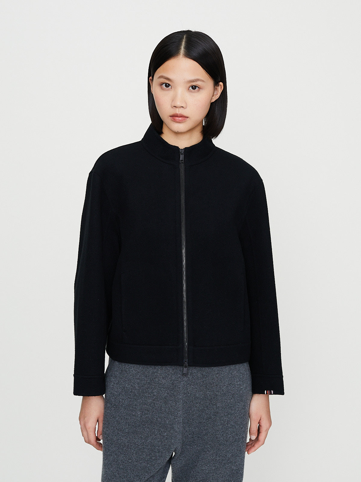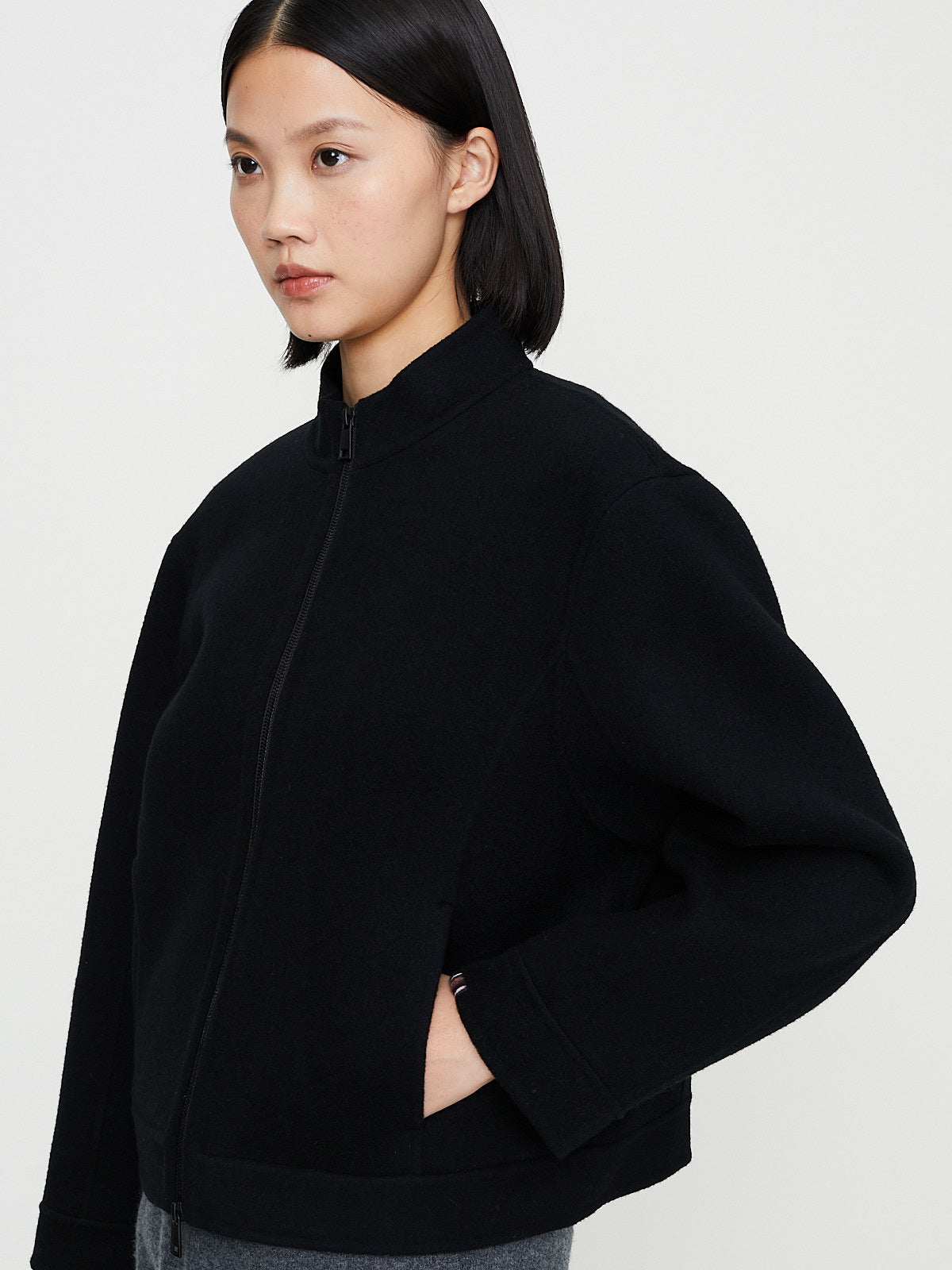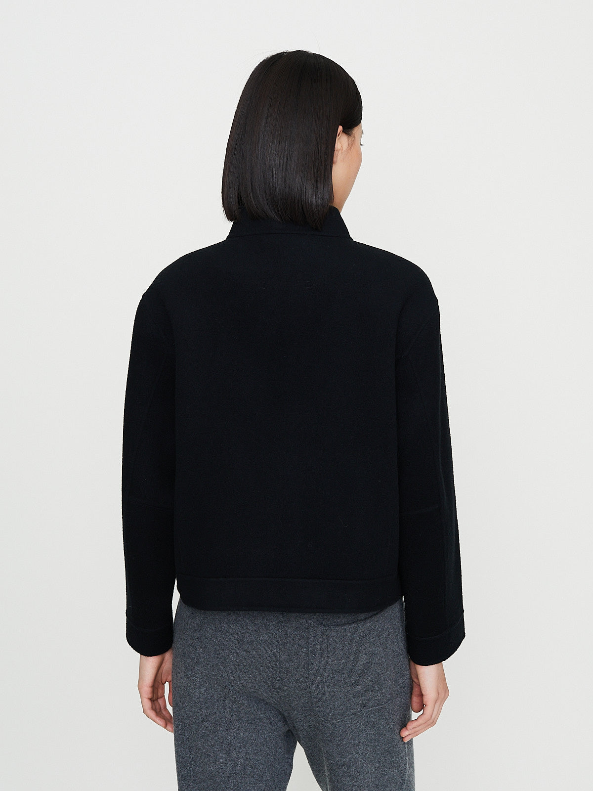 Cropped jacket in black double-faced wool/cashmere inspired by a classic motorcycle jacket. Stand collar, front two-way zipper fastening and cropped sleeves with a dropped shoulder. Slip pockets on the front. Unisex.