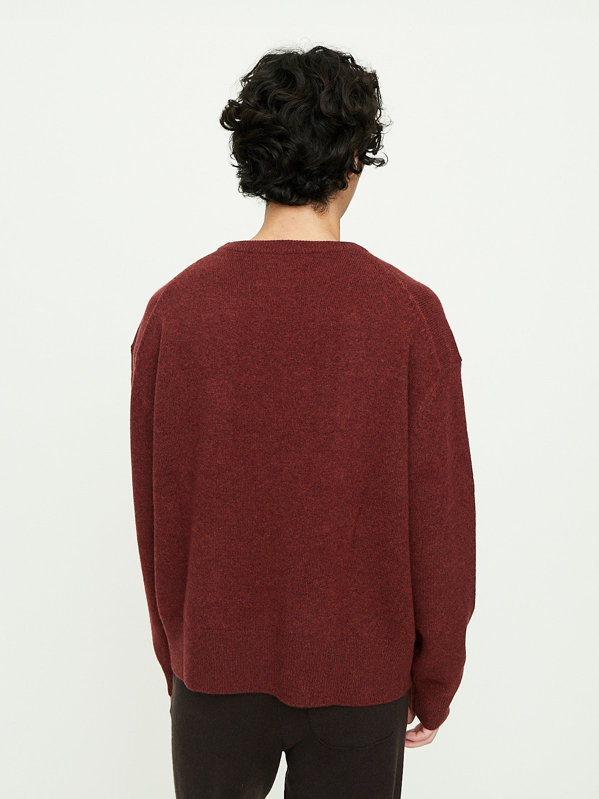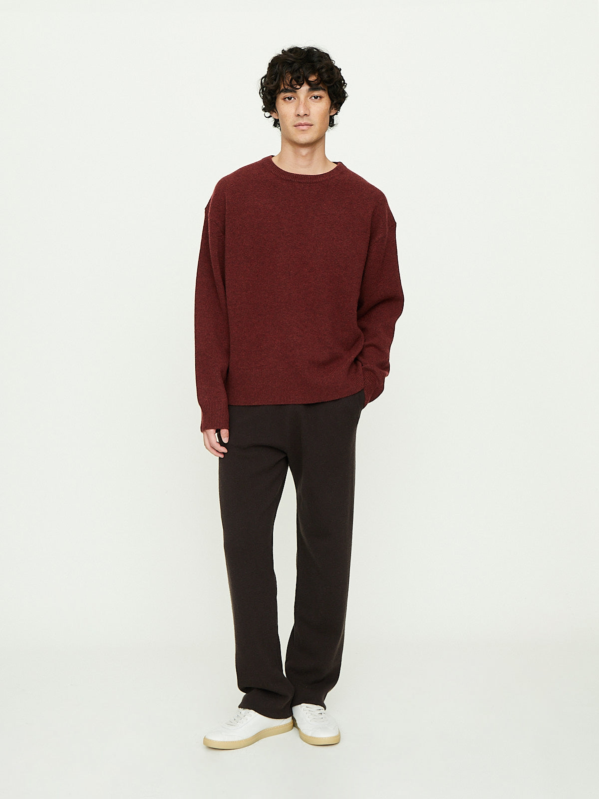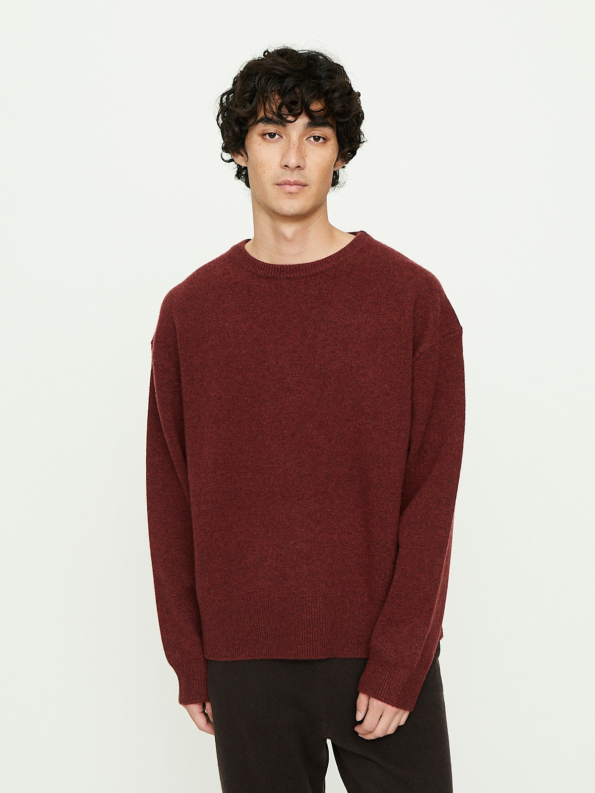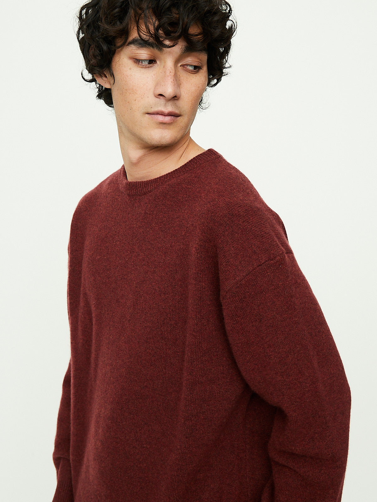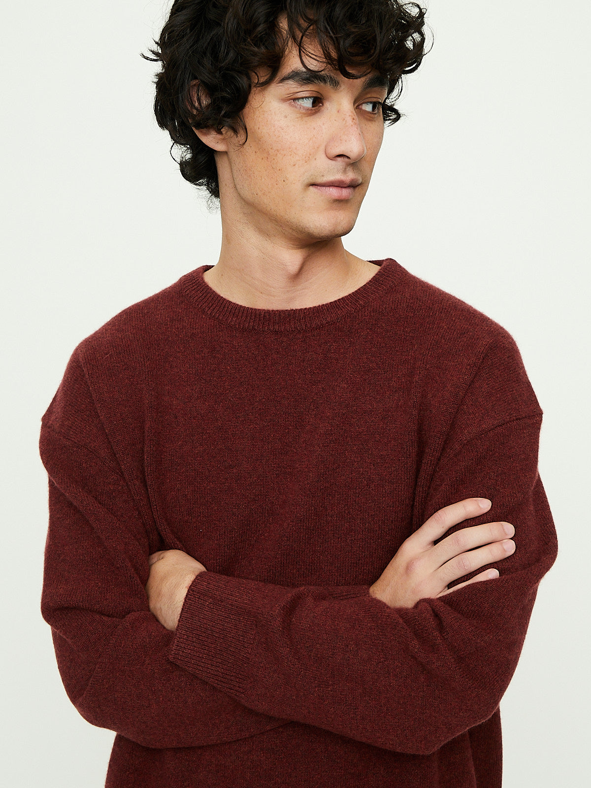 Unisex relaxed sweater in a burgundy medium-weight cashmere blend. Crewneck and long sleeves with a dropped shoulder. Rib detail around the neck, cuffs and bottom hem.