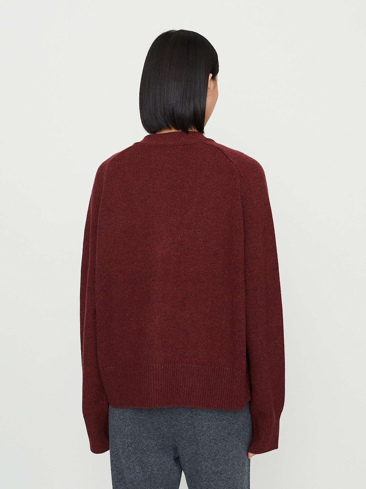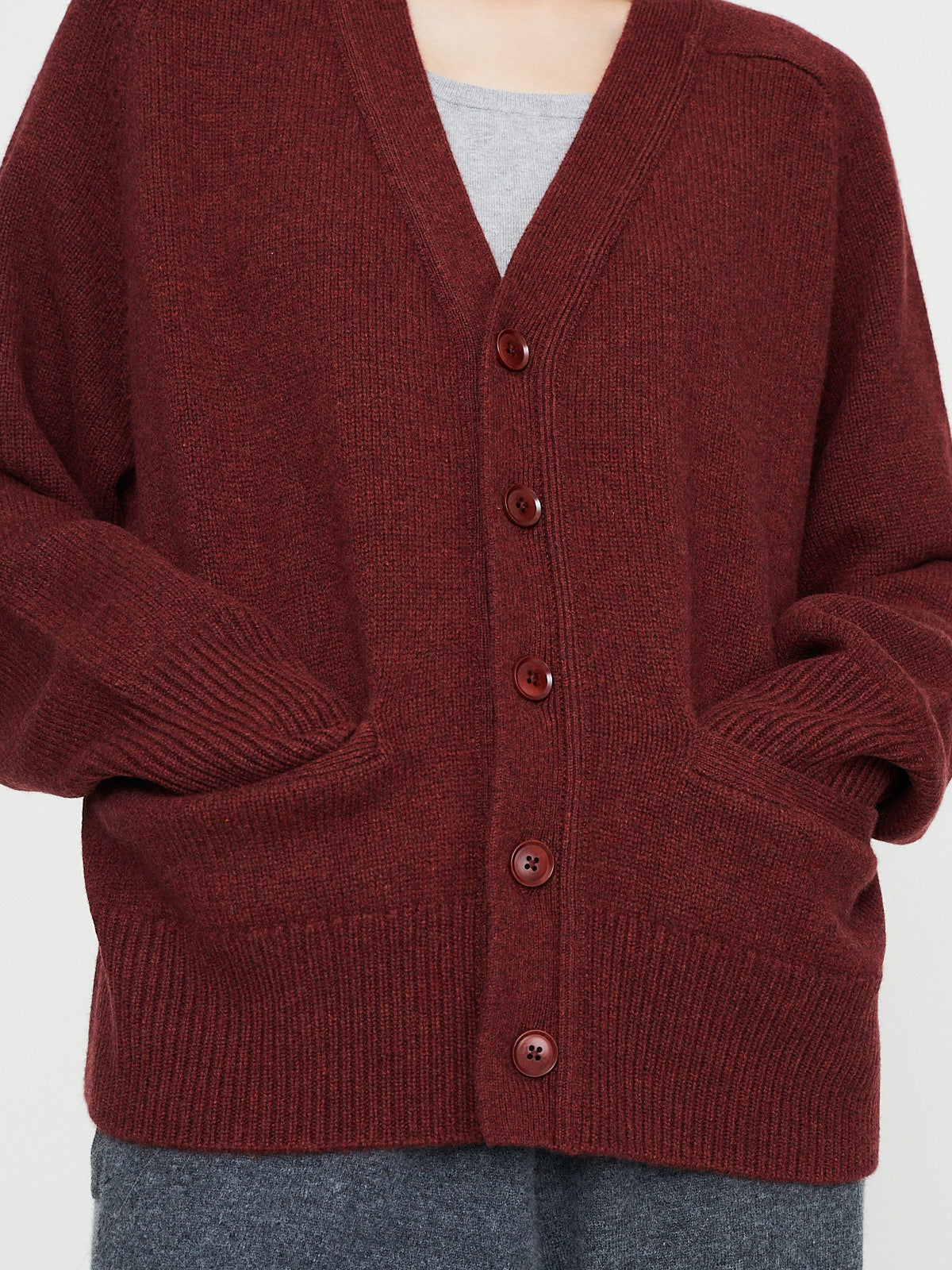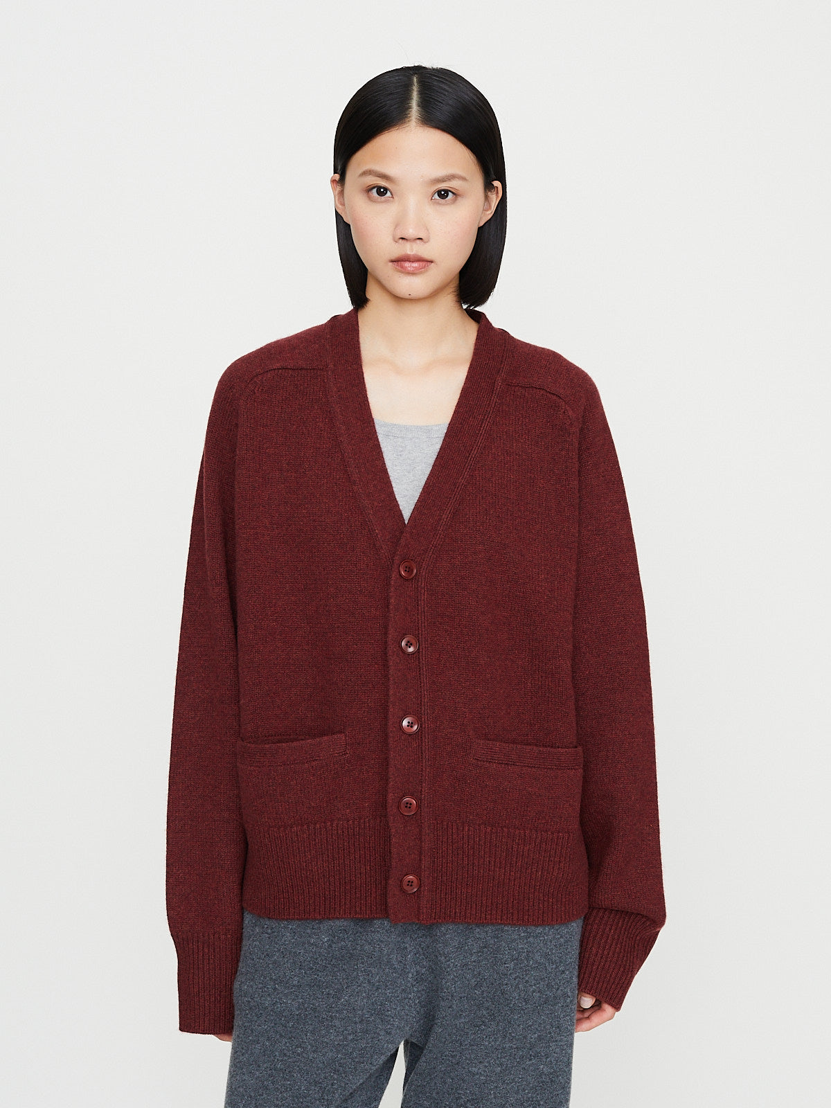 Classic unisex cardigan in heavy-weight maroon cashmere. V-neckline, front button fastening and long saddle sleeves. Features welted slip pockets on the front. Rib detail around the cuffs and bottom hem. Sits on the hips. Relaxed fit.