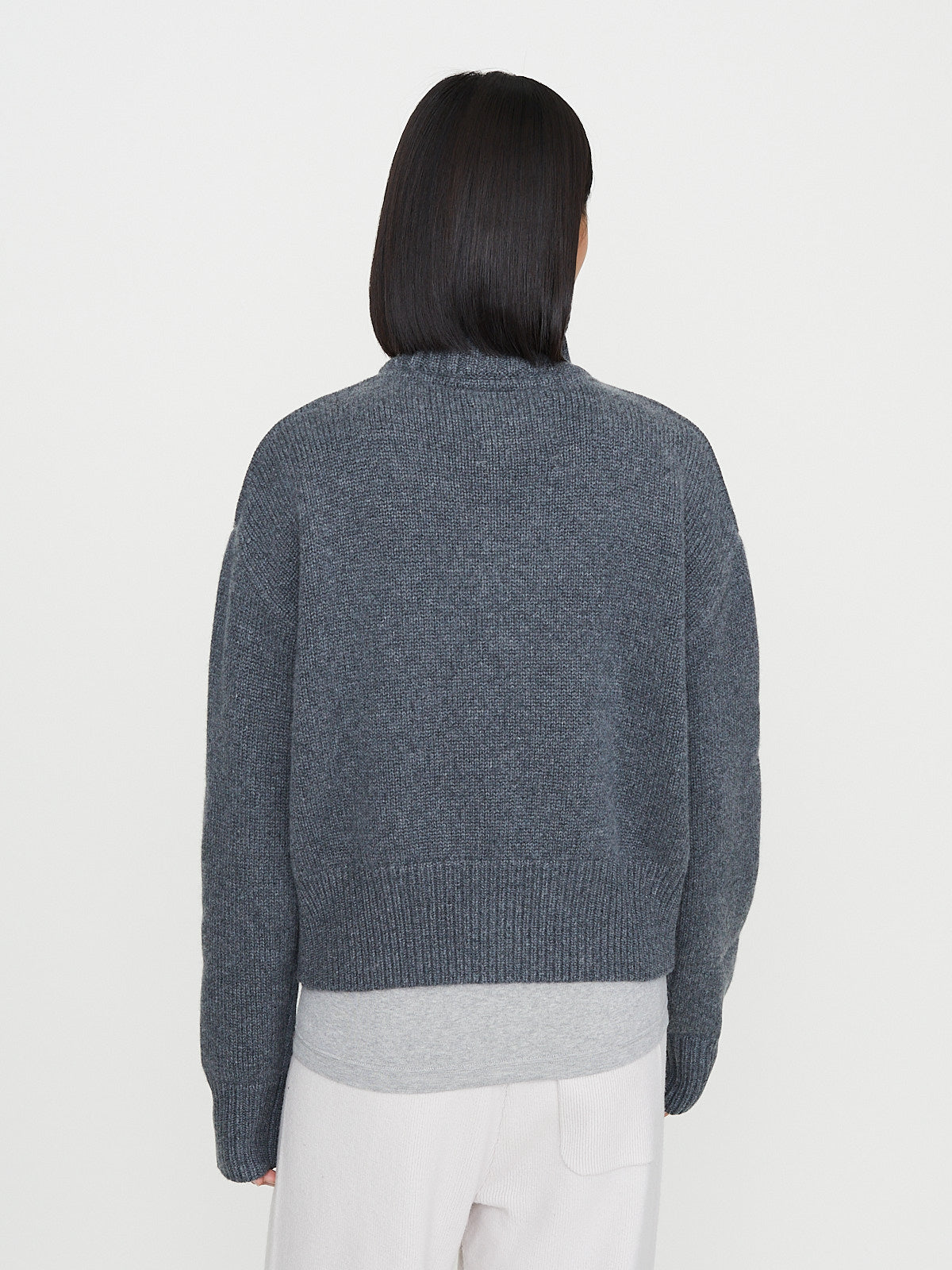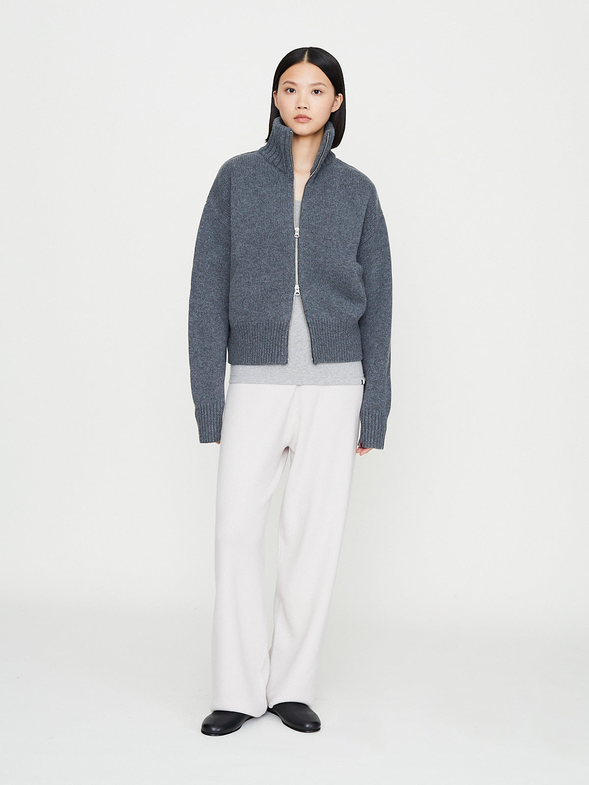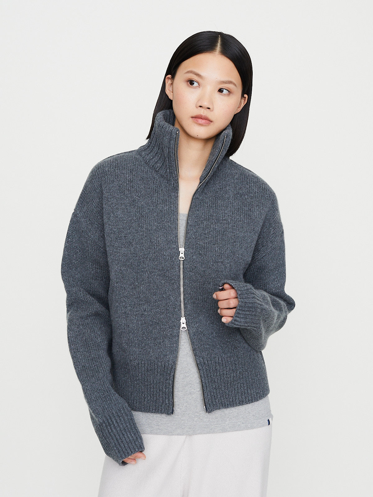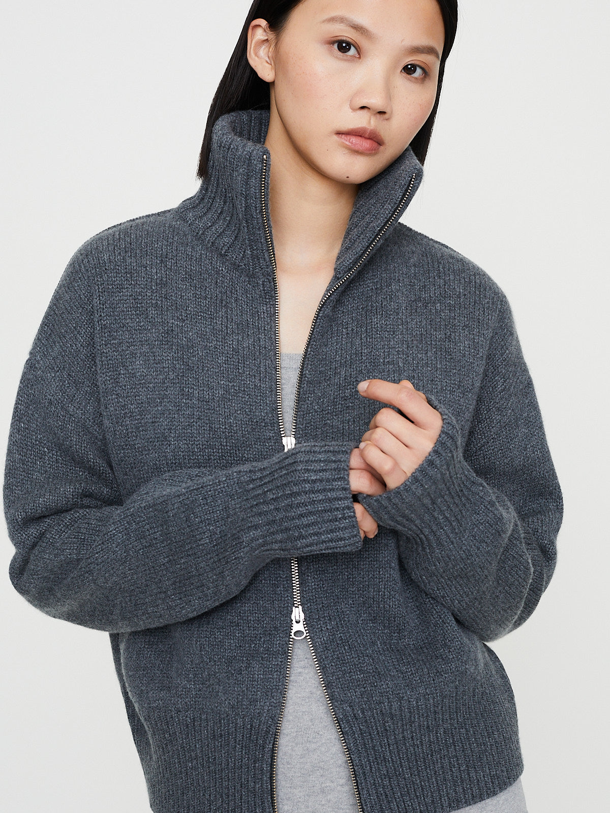 Unisex bomber-style cardigan in dark grey heavy-knit cashmere. Stand collar, front two-way zip fastening and long sleeves with a dropped shoulder. Welted slit pockets on the front. Rib detail at the collar, cuffs and bottom hem.