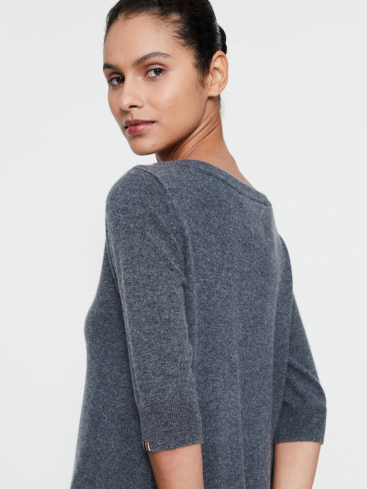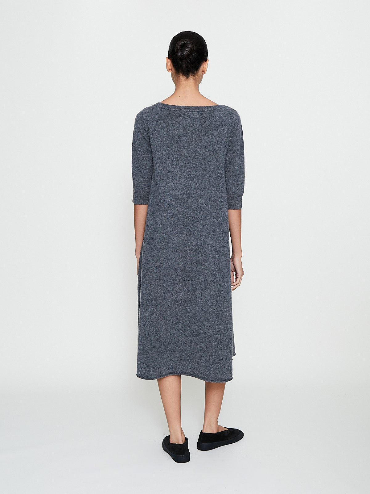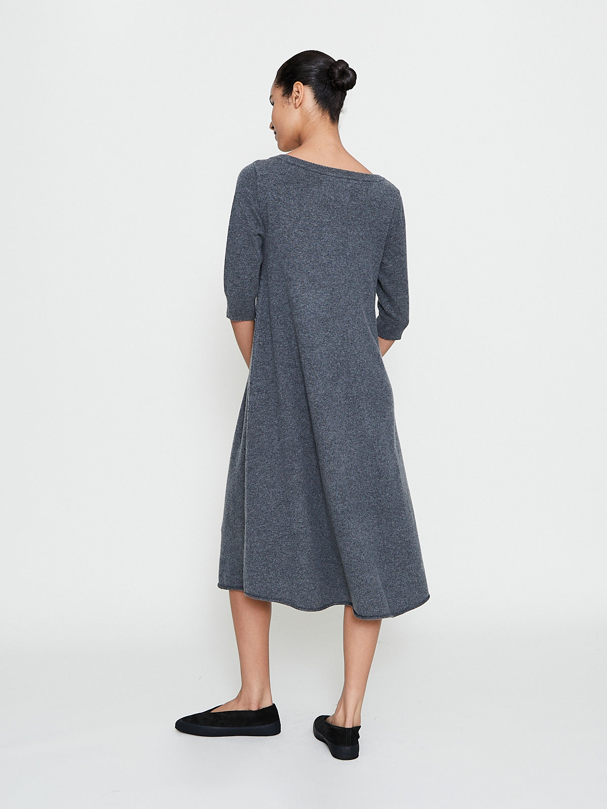 Classic a-line knitted dress in dark grey cashmere. Boatneck and elbow-length sleeves. Rib detail around the neck and cuffs. Features a rolled hemline.