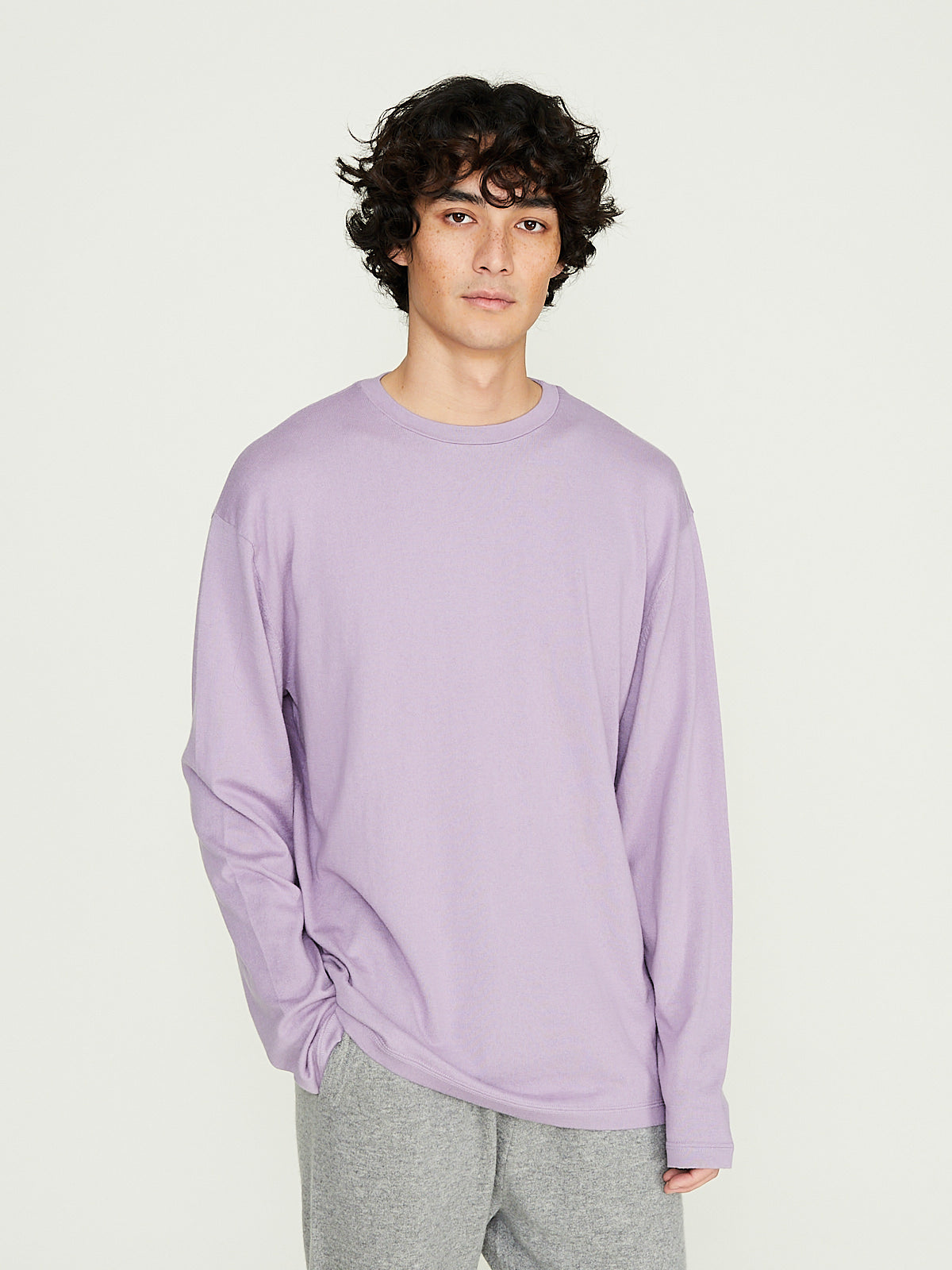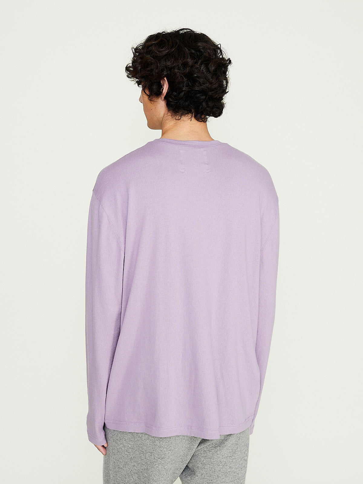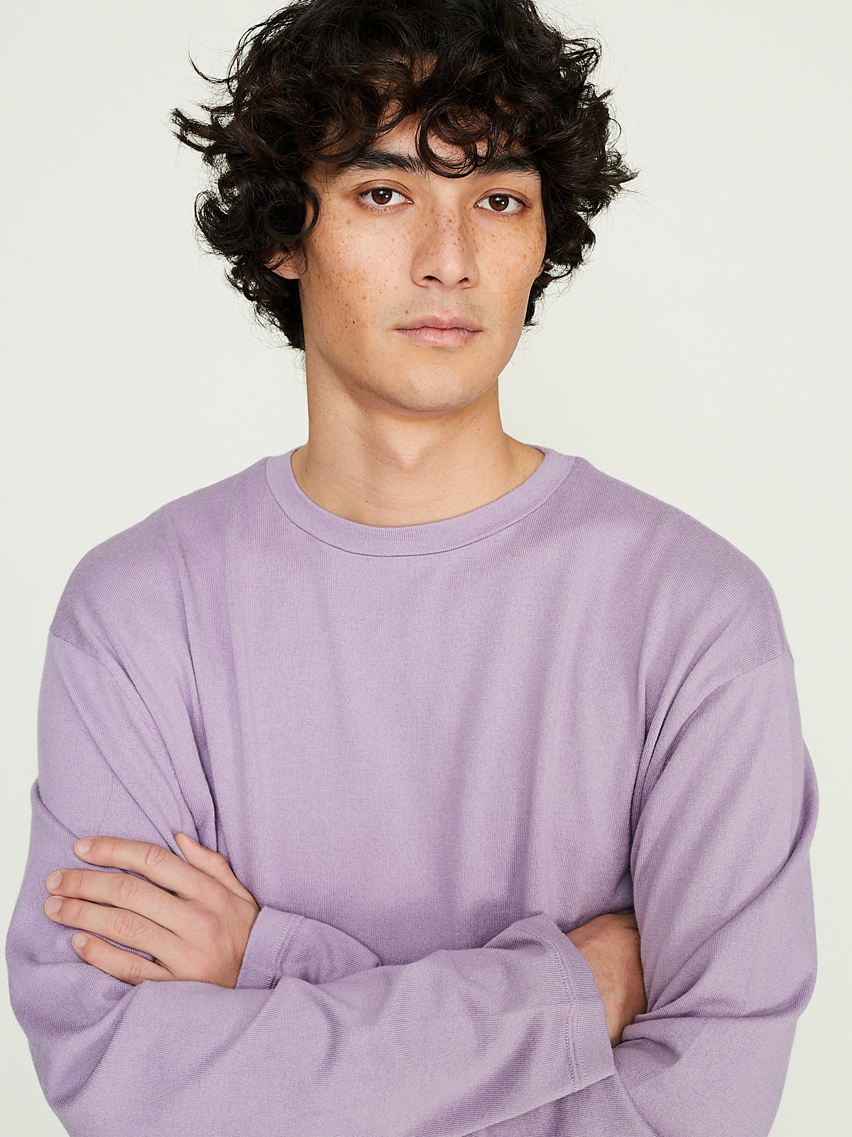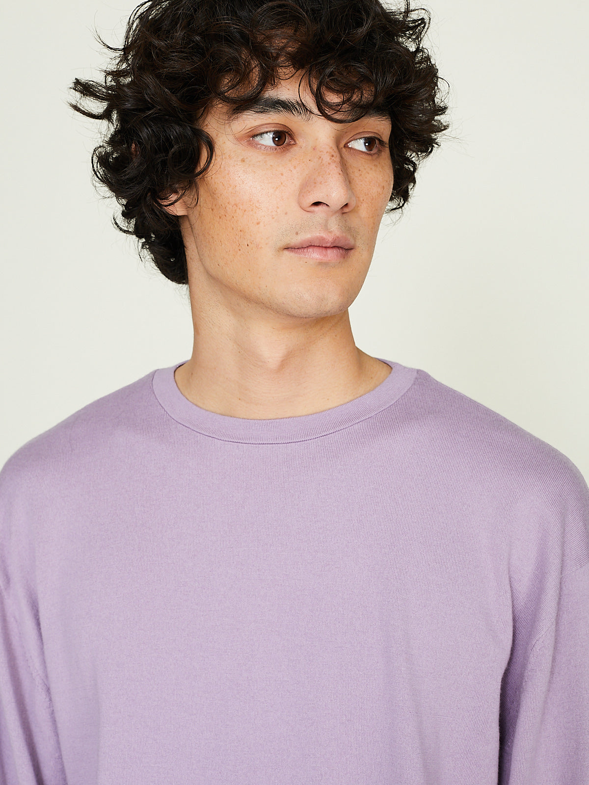 Loose-fit long sleeves t-shirt in lilac breathable cotton/cashmere. Crewneck and long sleeves with a dropped shoulder. Unisex.