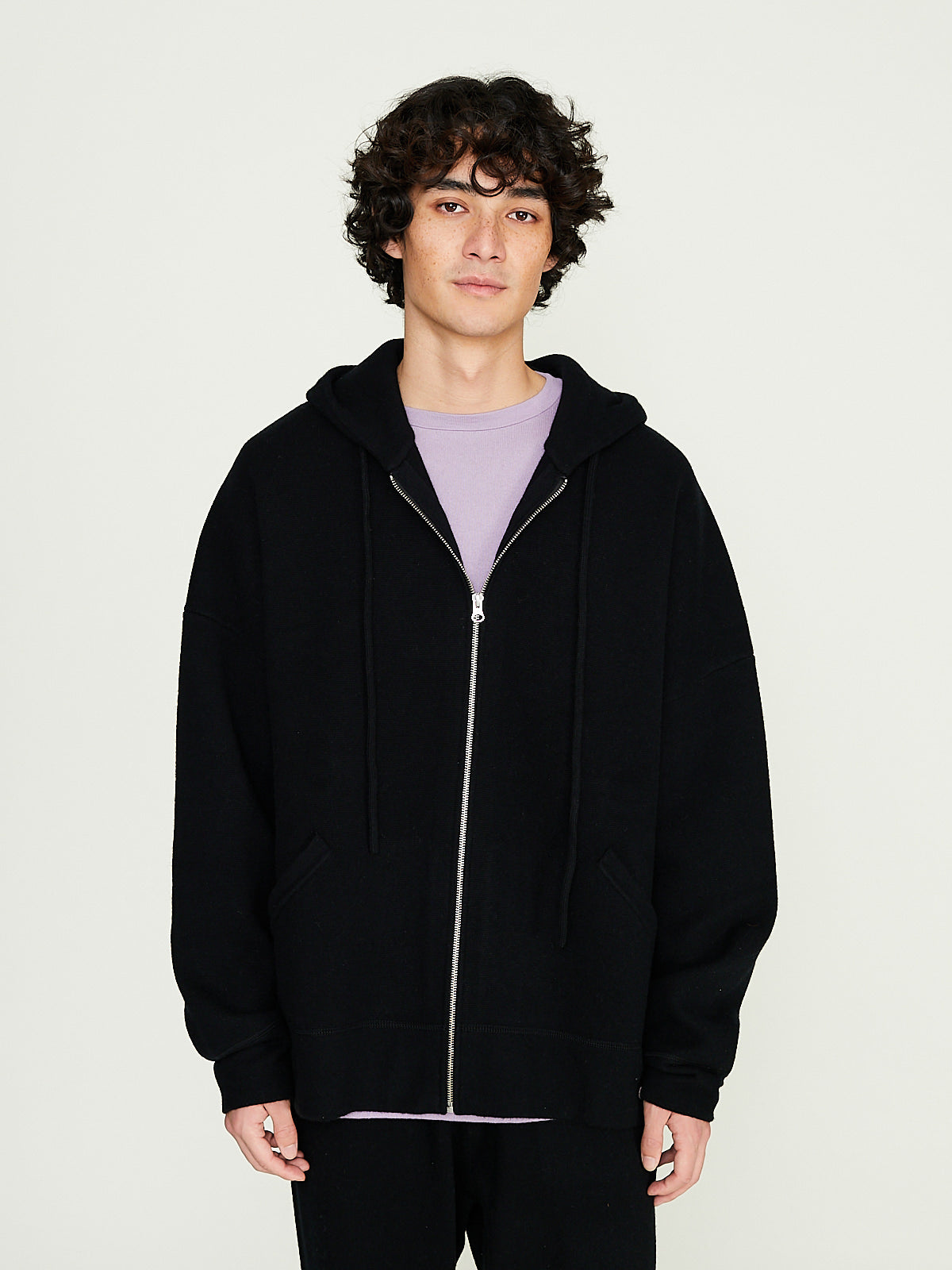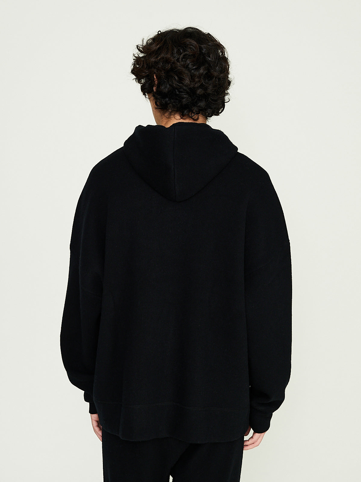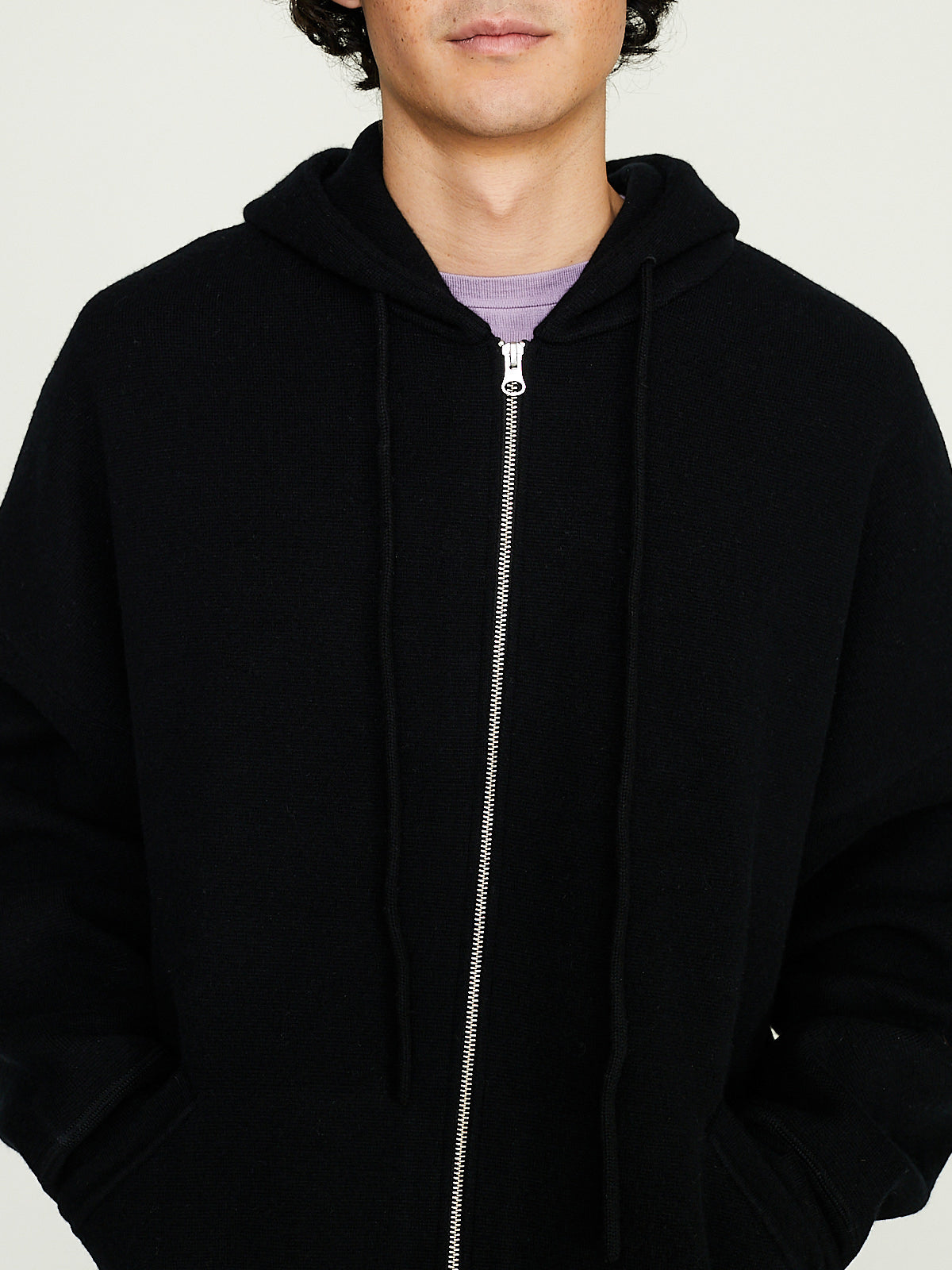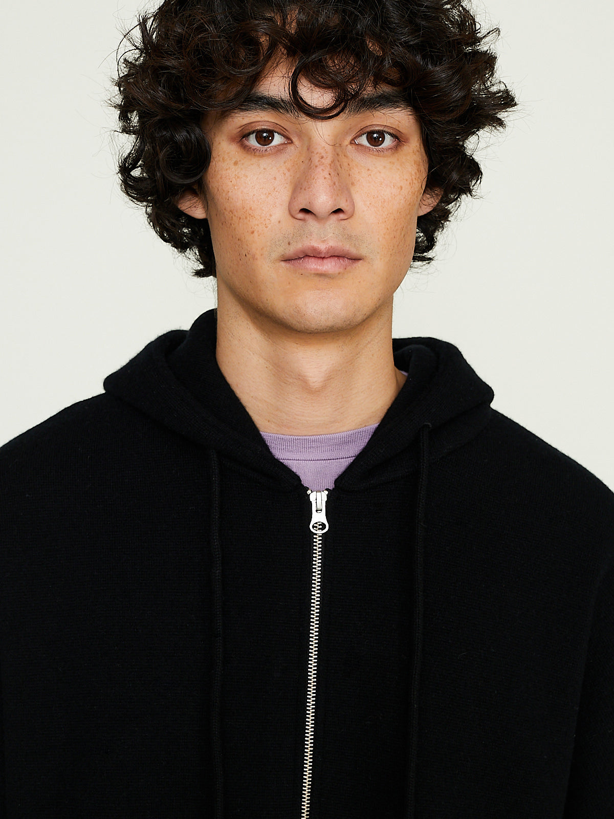 Oversized cardigan in a black cashmere blend with a luxurious jacquard knit. Hooded with an adjustable drawstring and a front two-way zip fastening. Long sleeves with a dropped shoulder and welted slip pockets. Unisex.