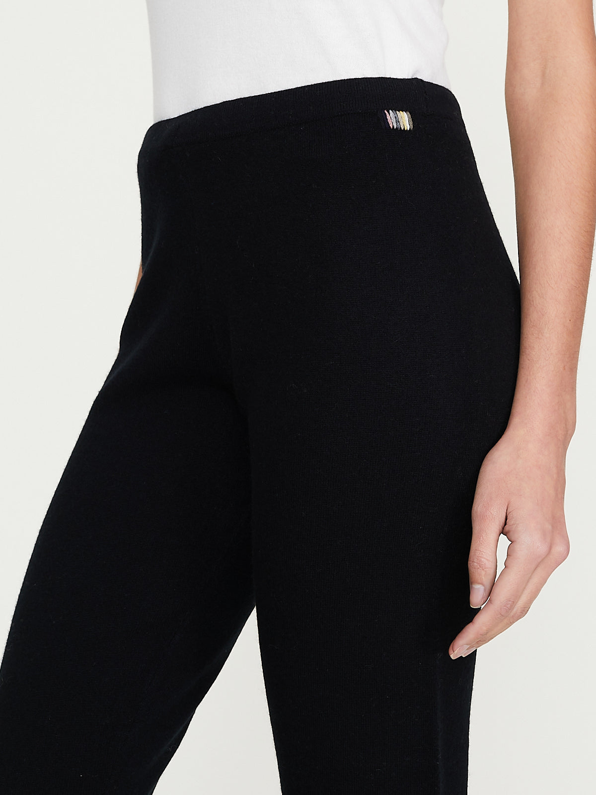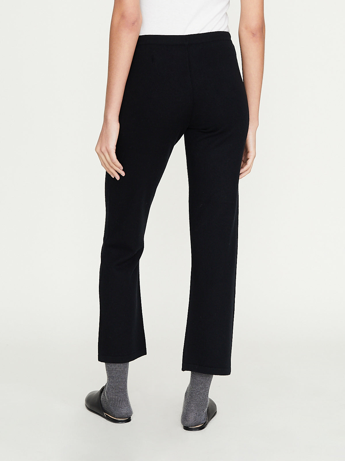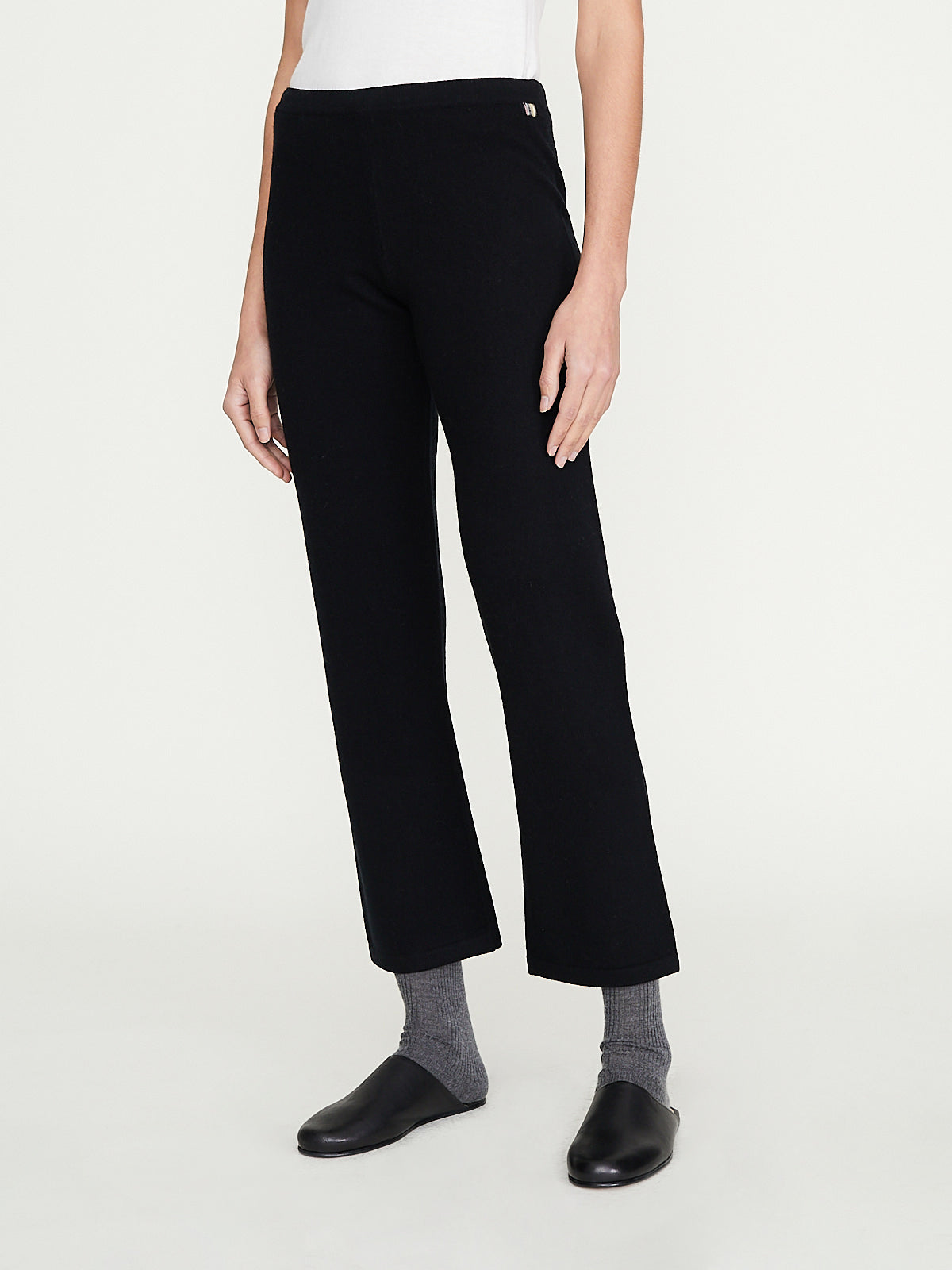 Fitted trouser in a black cashmere blend. Pull-on style with an elasticated waistband and an adjustable drawstring and two discreet side pockets. Straight cropped legs.