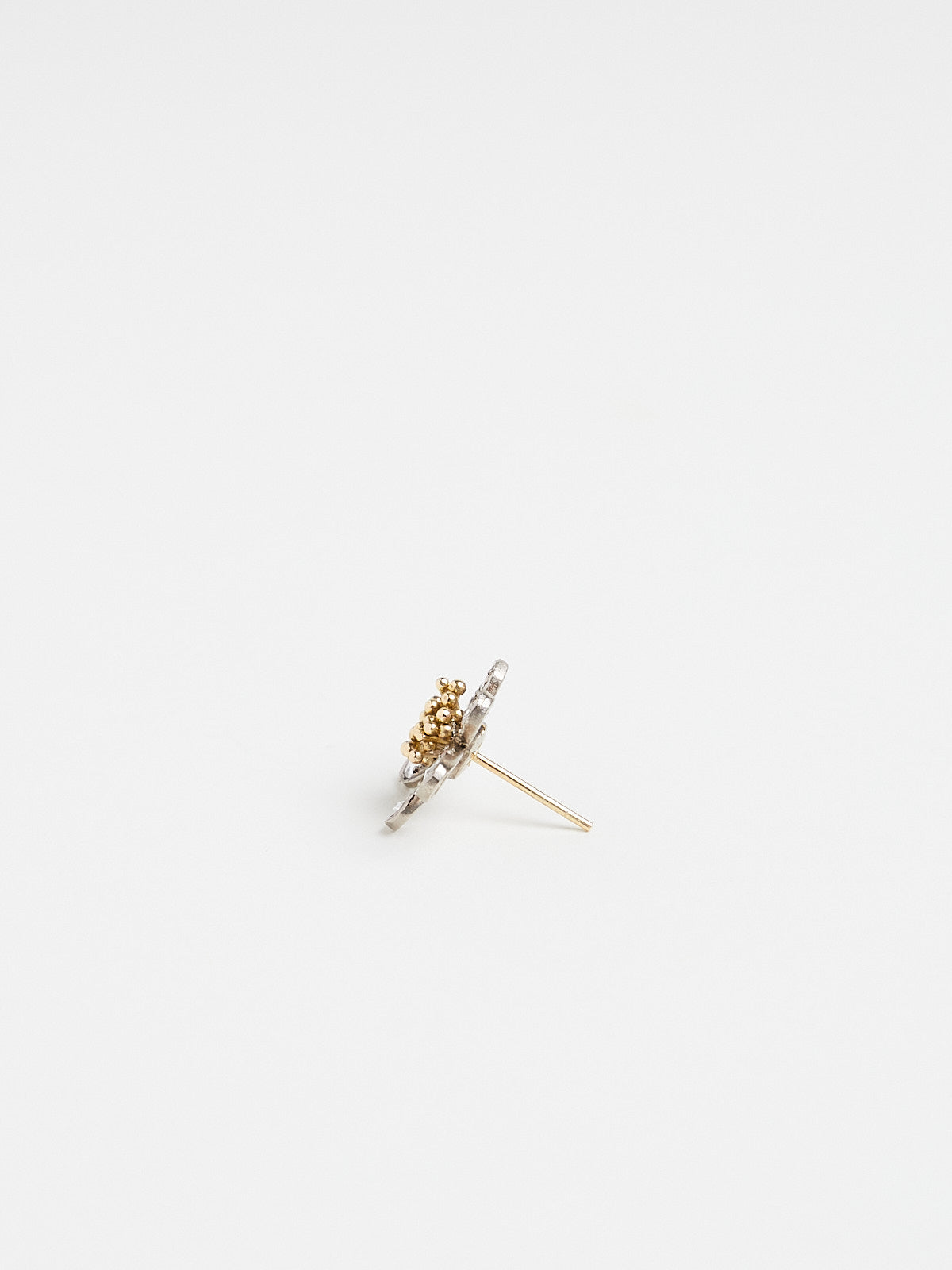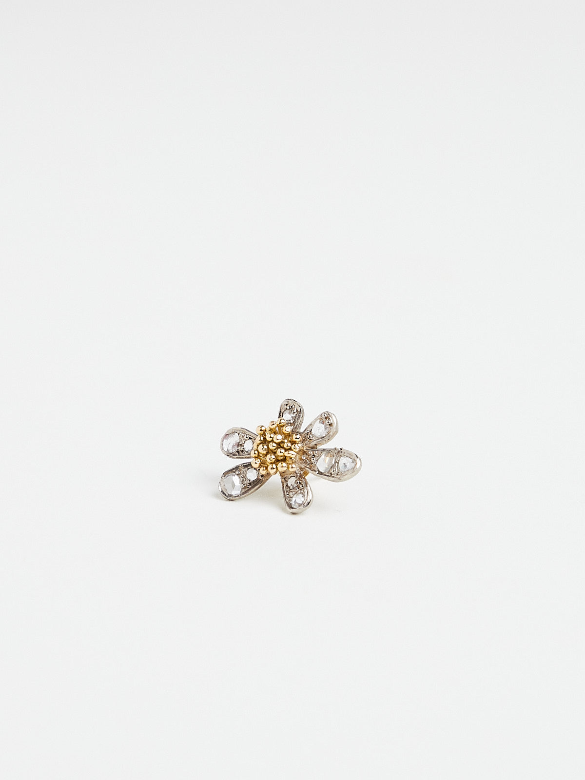 Chamomile flower earrings in 18k white and yellow gold with 0.8ct white rose-cut diamonds. Features an ear post backing.