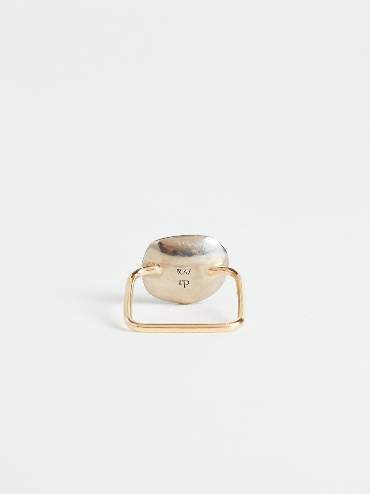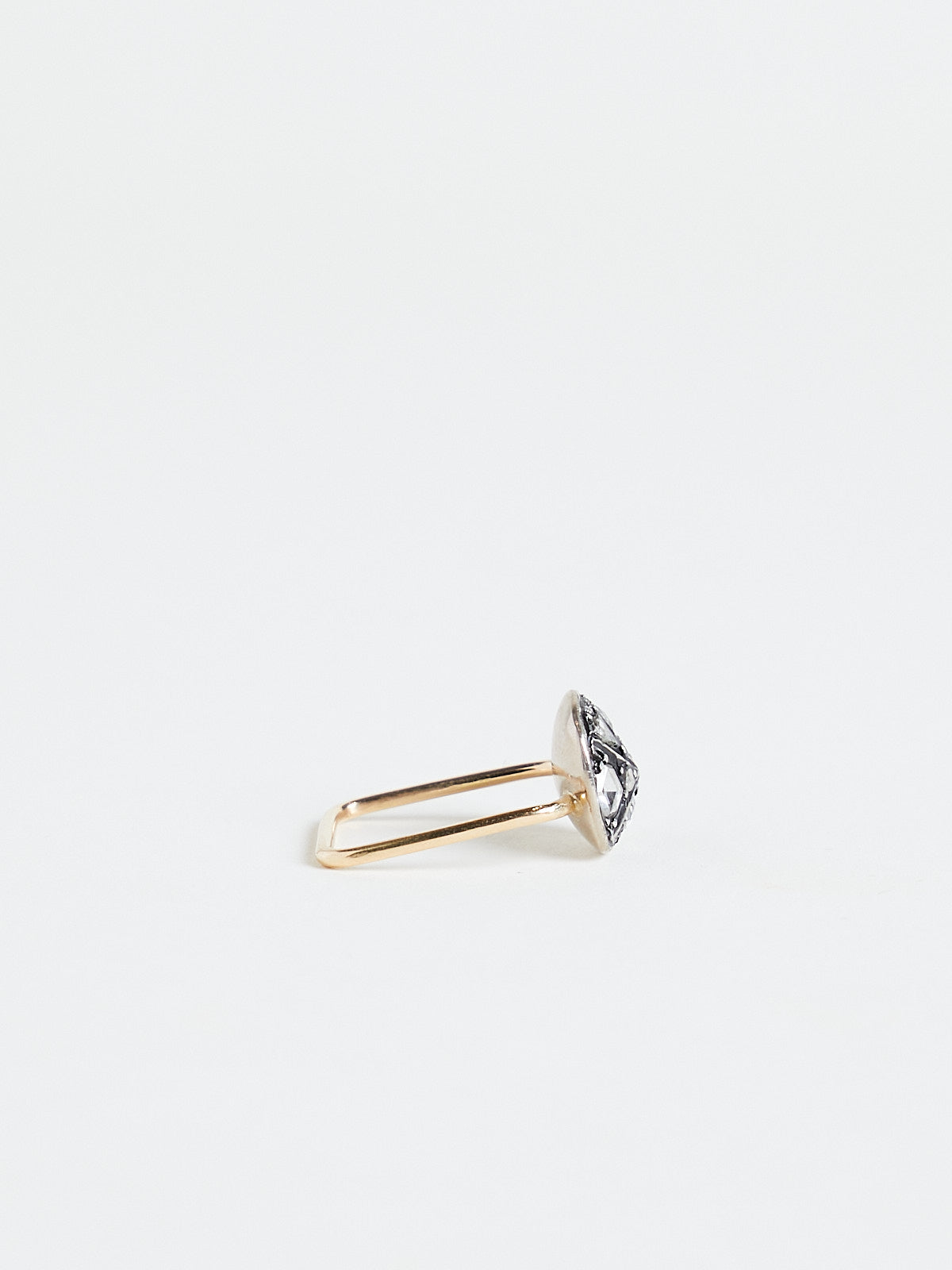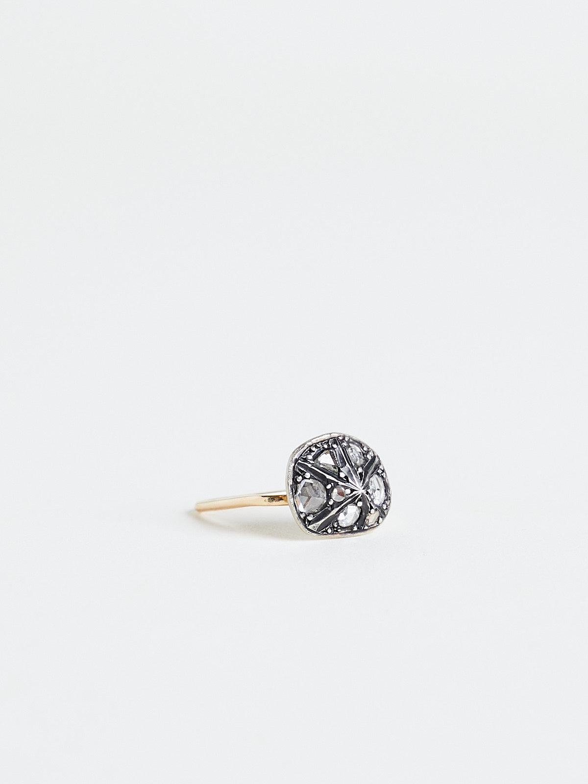 Ring in 18k yellow gold with a square band and a pebble-shaped disc made of sterling silver encrusted with 0.57ct white diamonds. Features oxidised details on the disc.