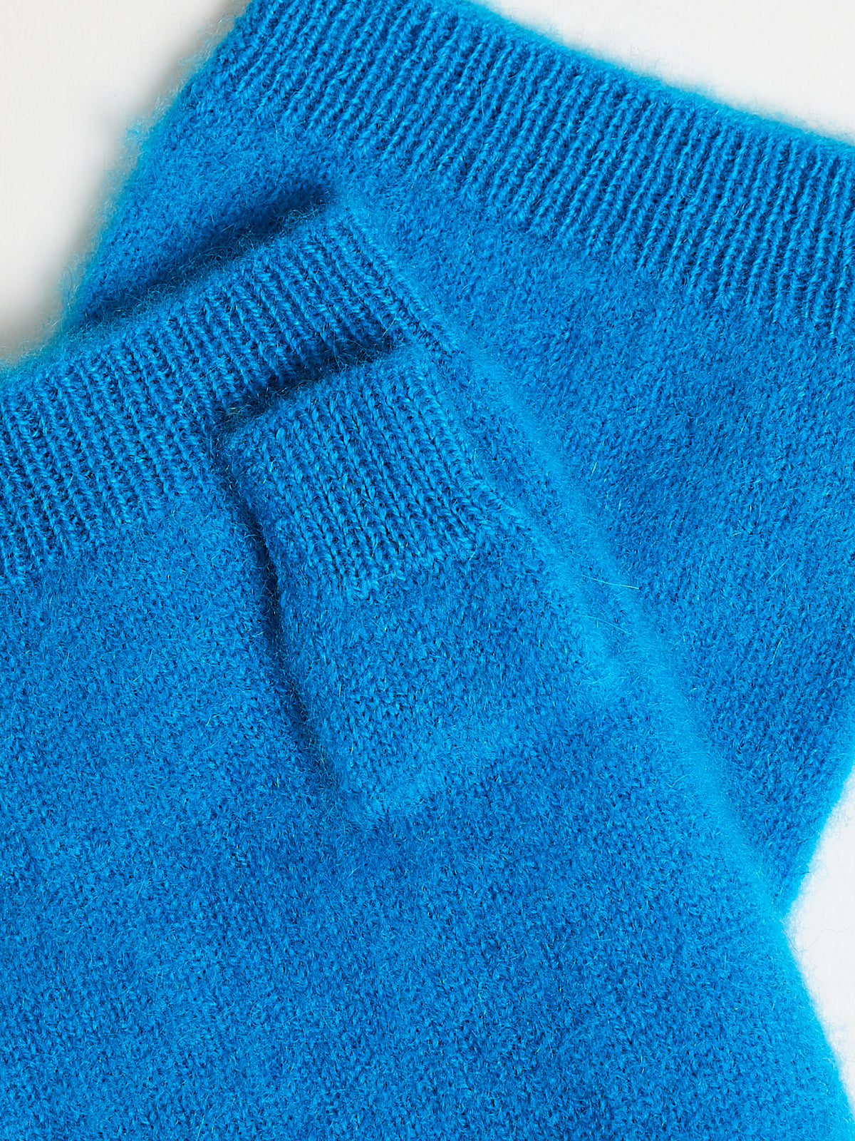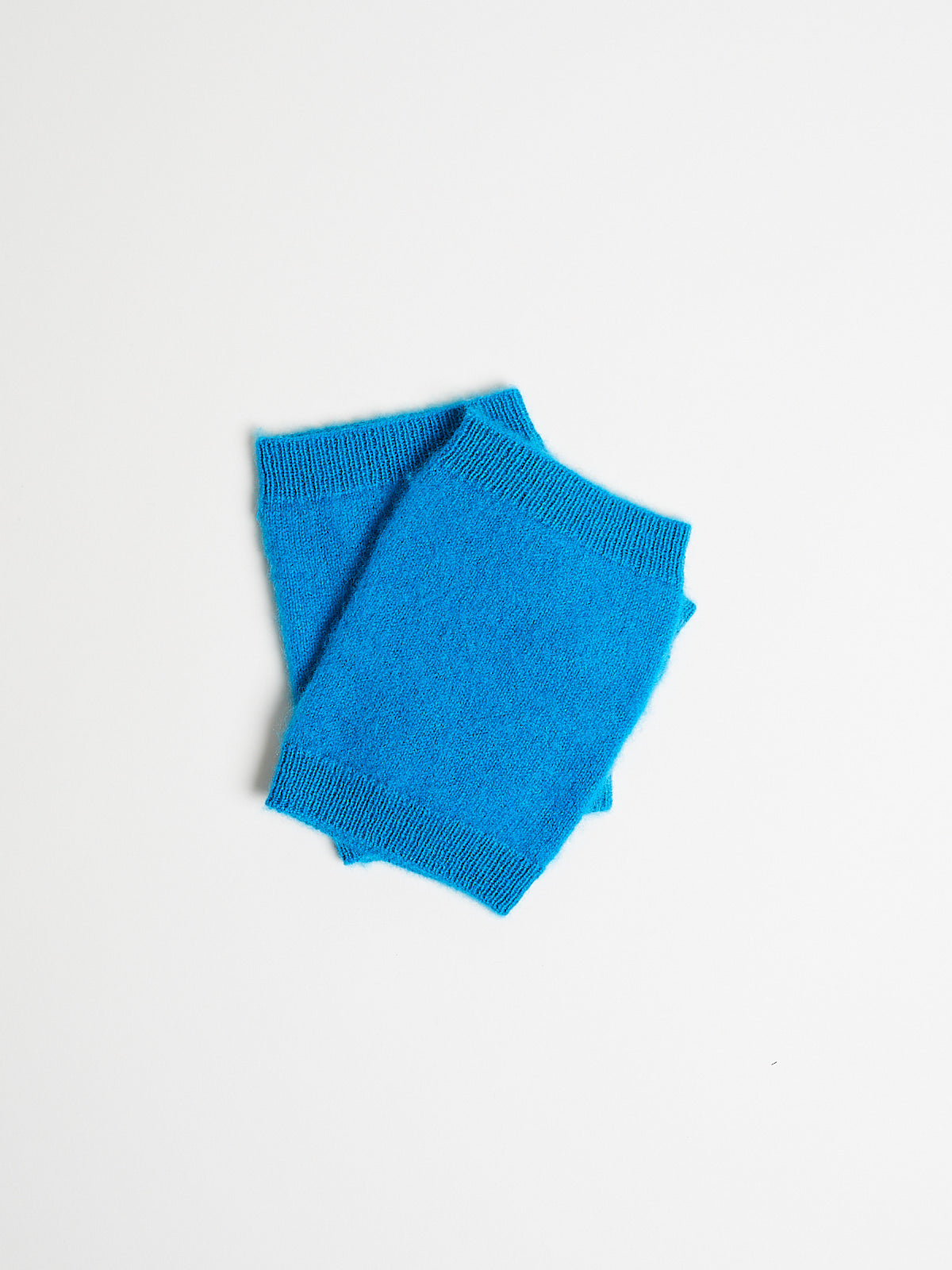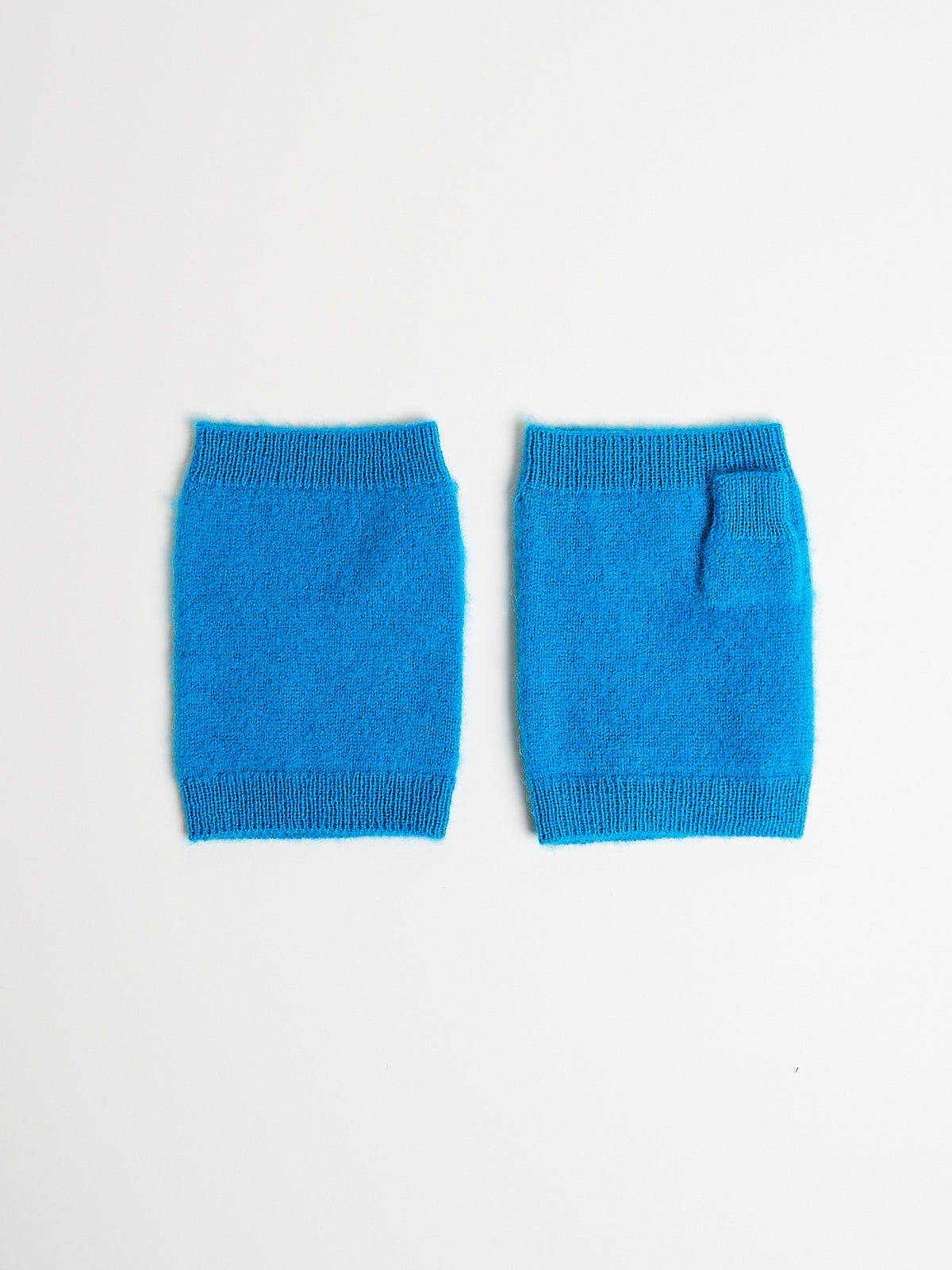 Fingerless gloves in electric blue cashmere. Thumb insert and a rib detail at the edges.