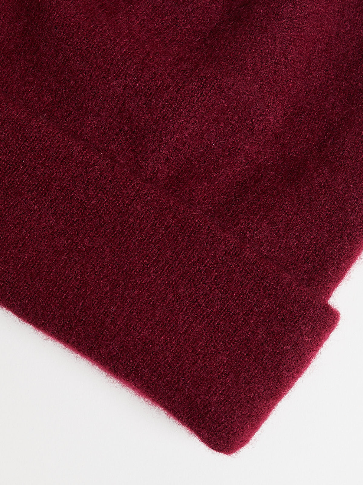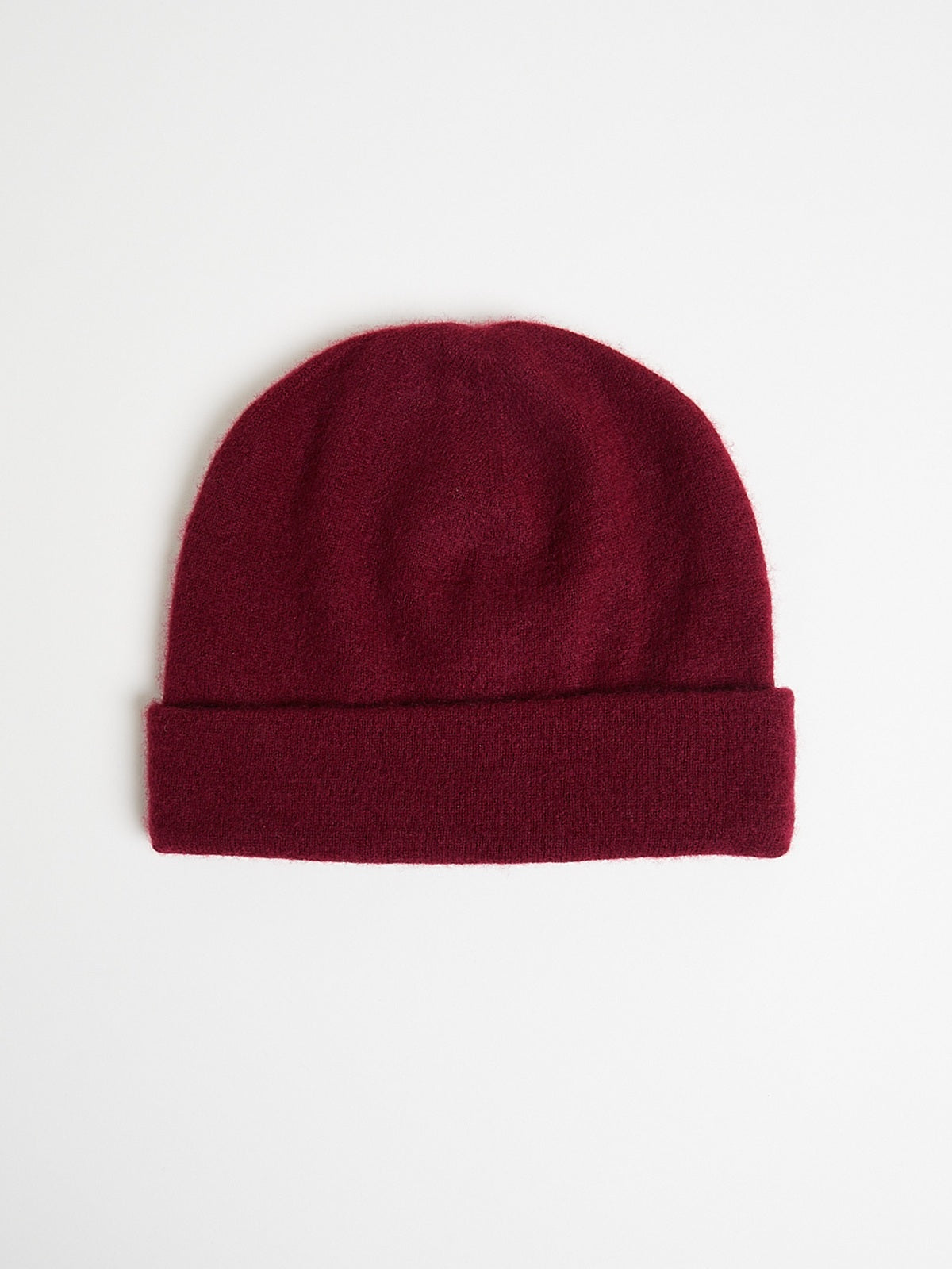 Beanie in burgundy Mongolian cashmere. Features a turn-up cuff.