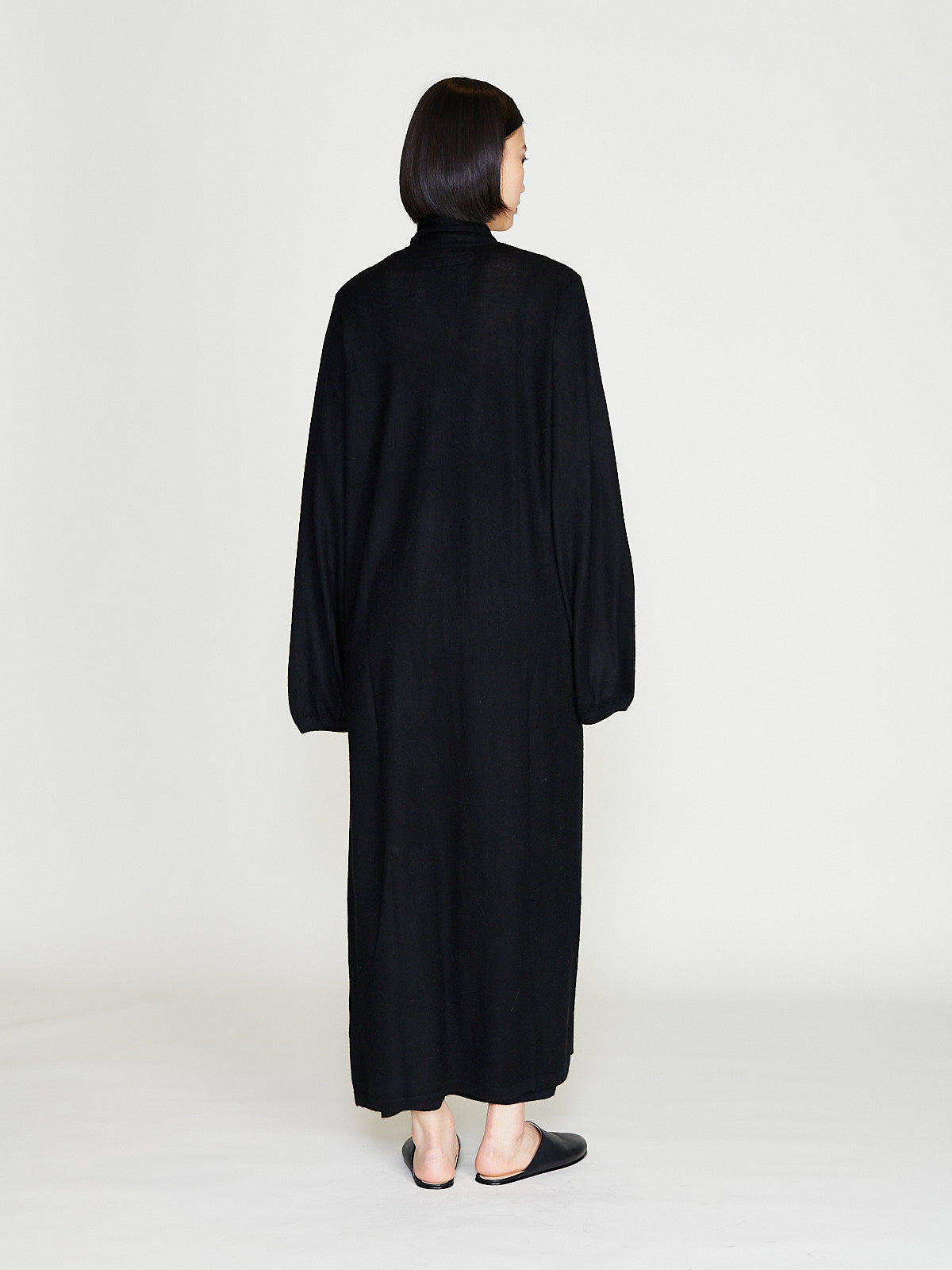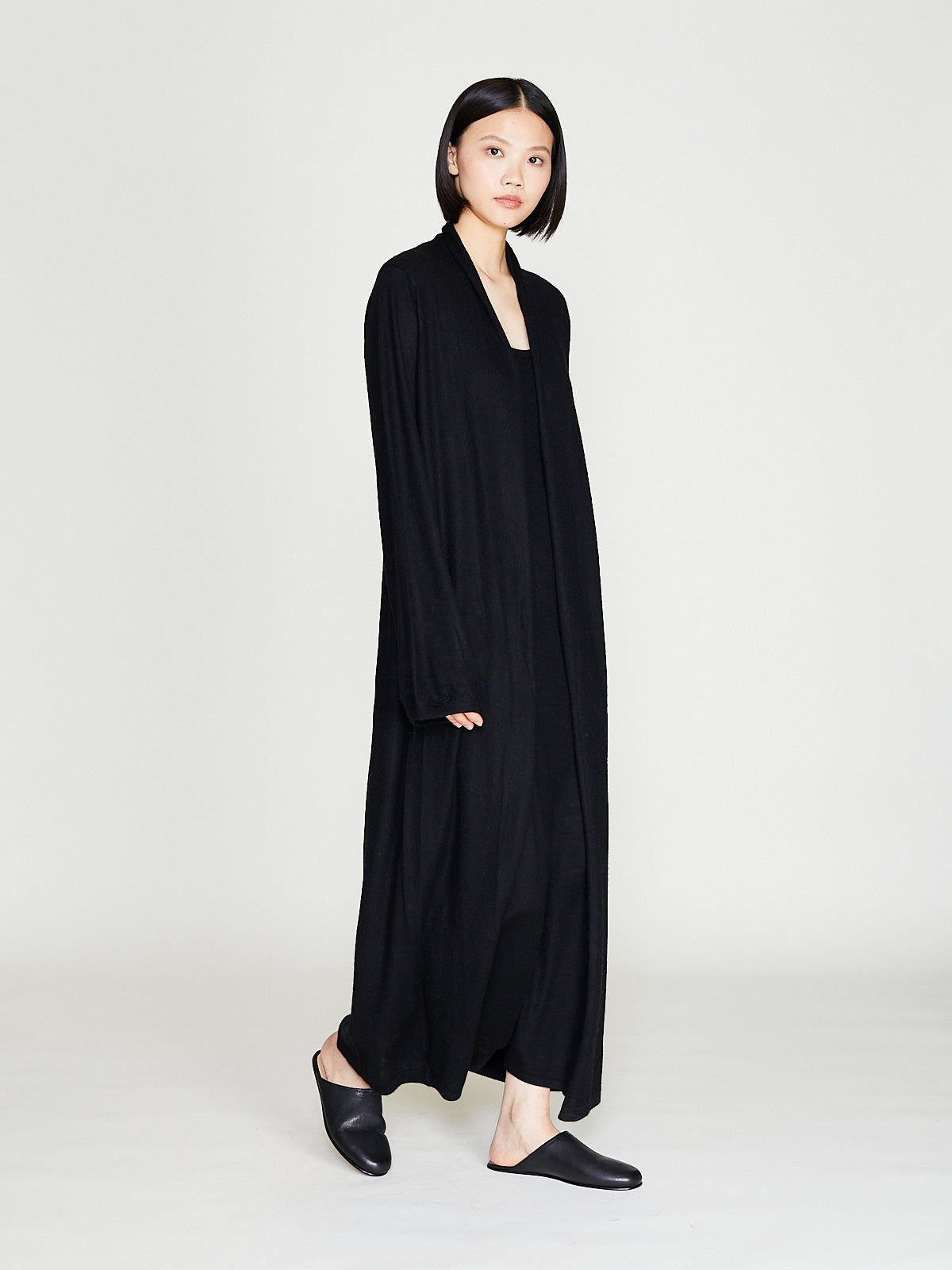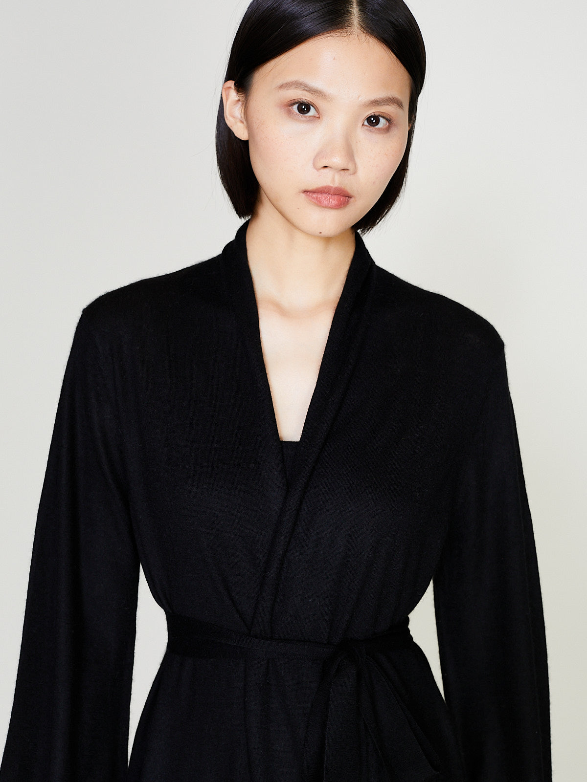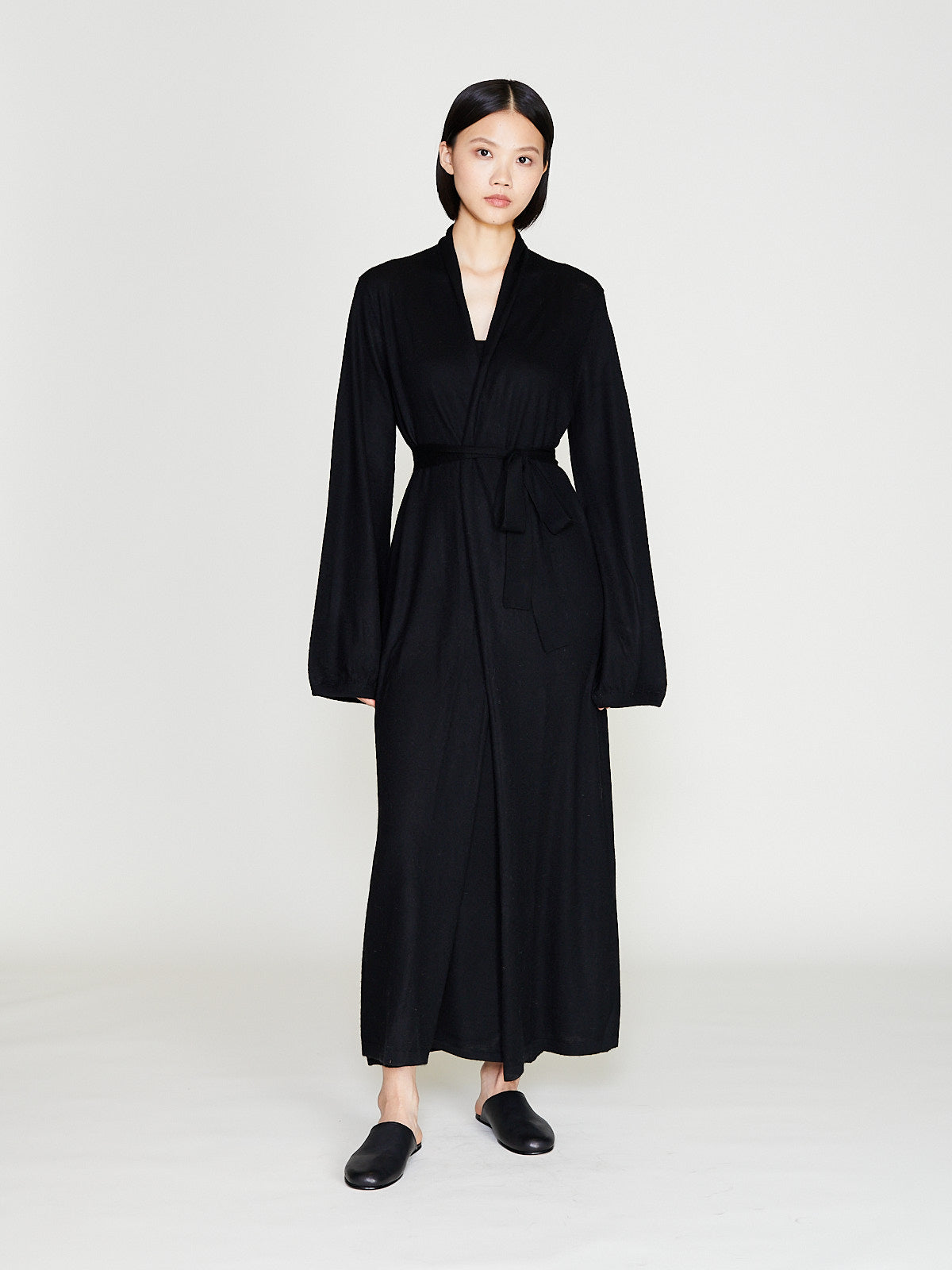 Long robe made from black cashmere. Open front and long blouson sleeves. Cinch the silhouette with the removable fabric belt.
