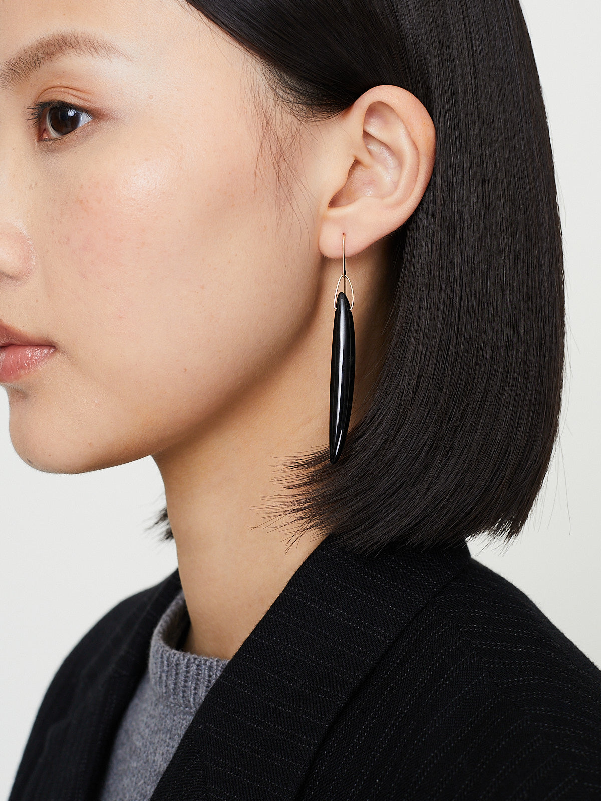 Earrings with bean-shaped black jade drops in two different sizes set in 14k yellow gold. Features an ear wire backing.