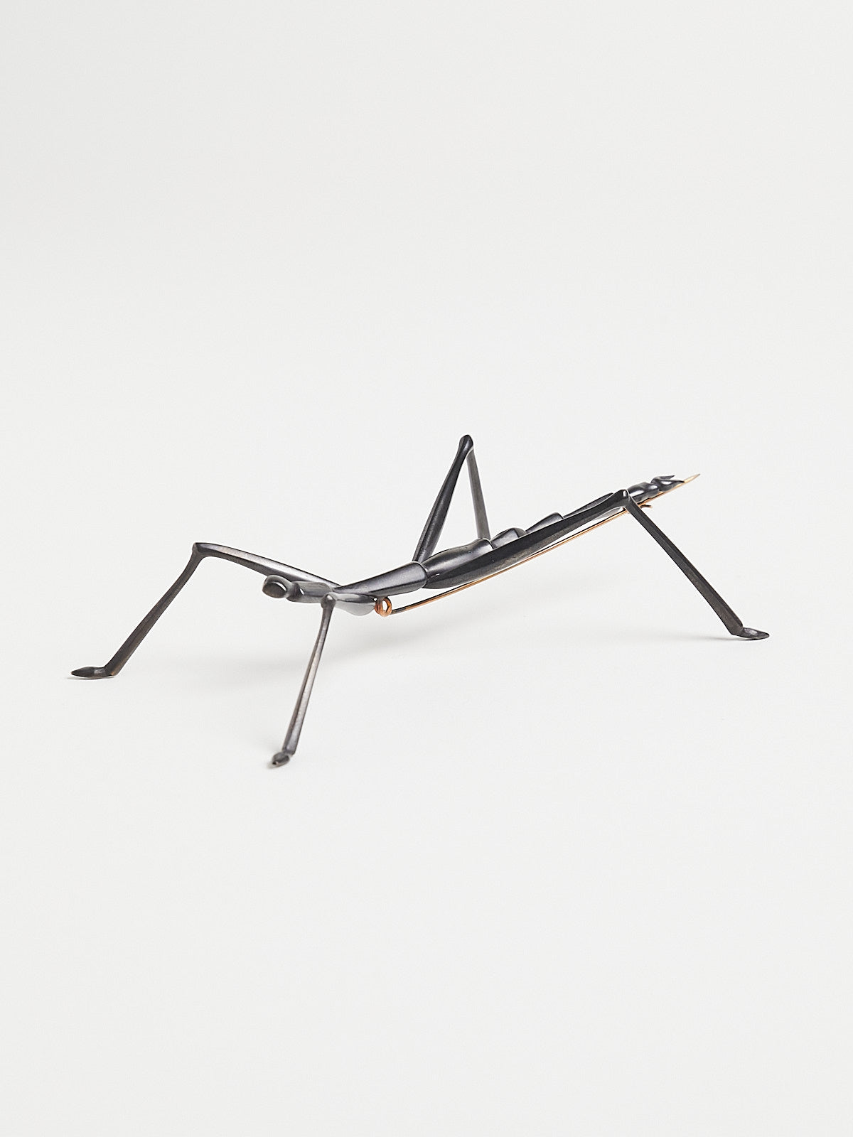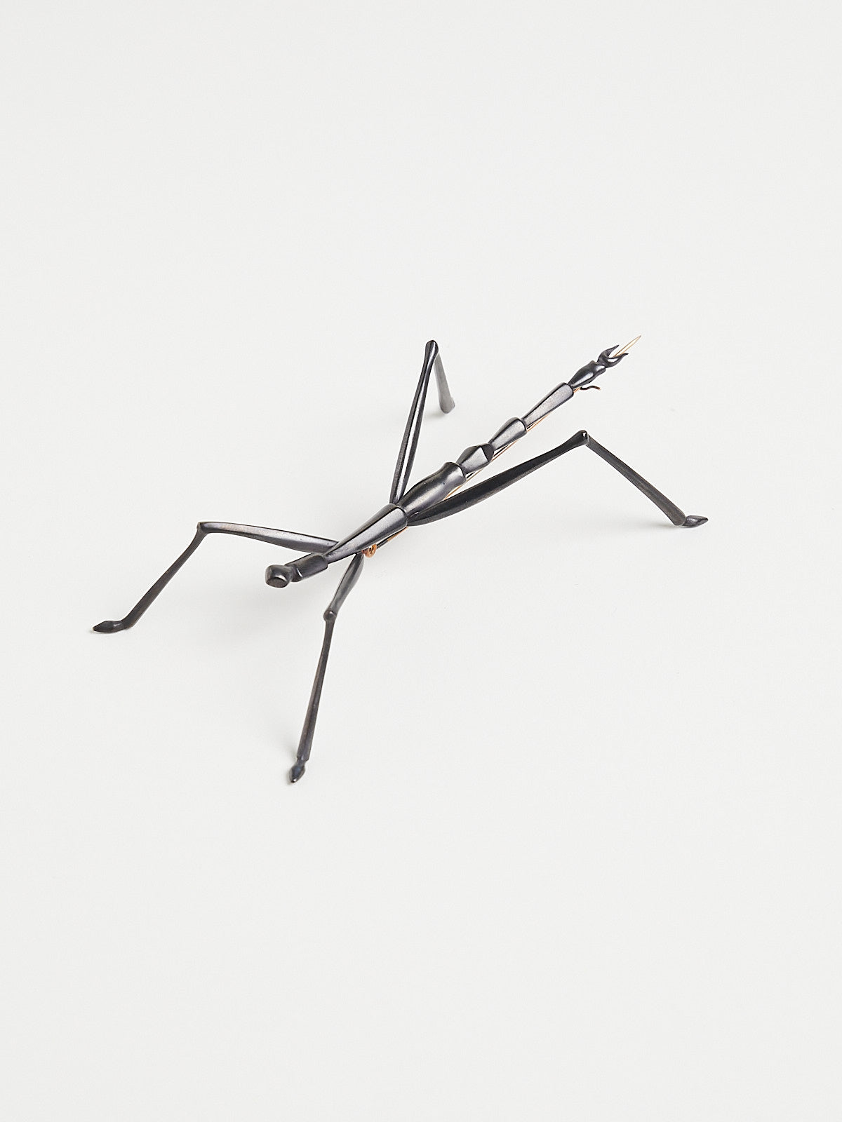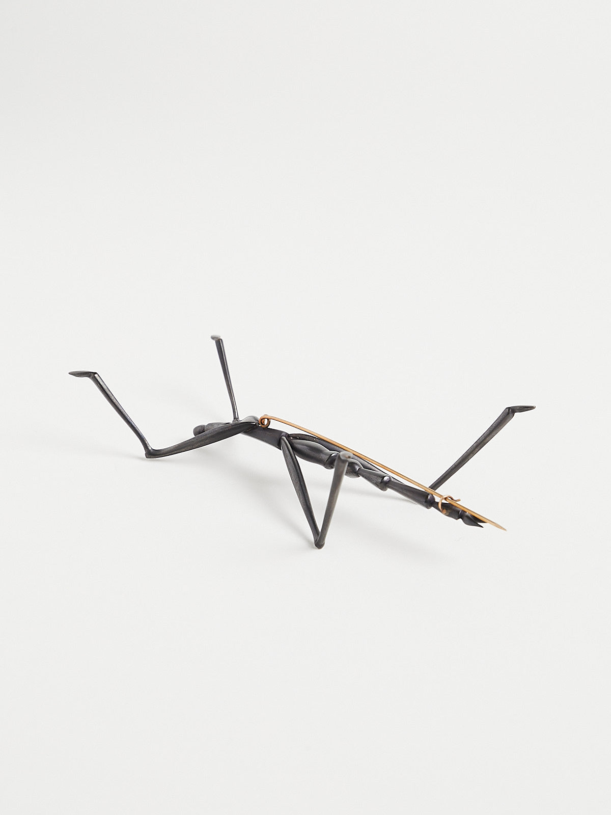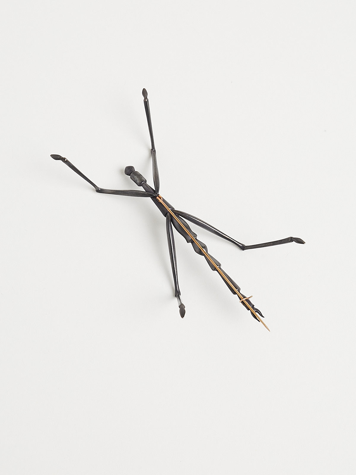 Carved walking stick bug brooch in oxidised bronze with a pin made from 14k yellow gold.