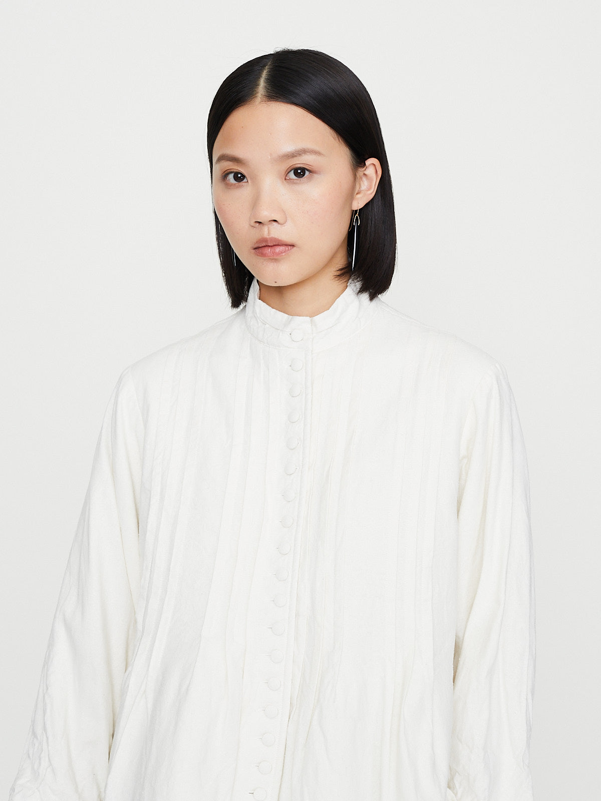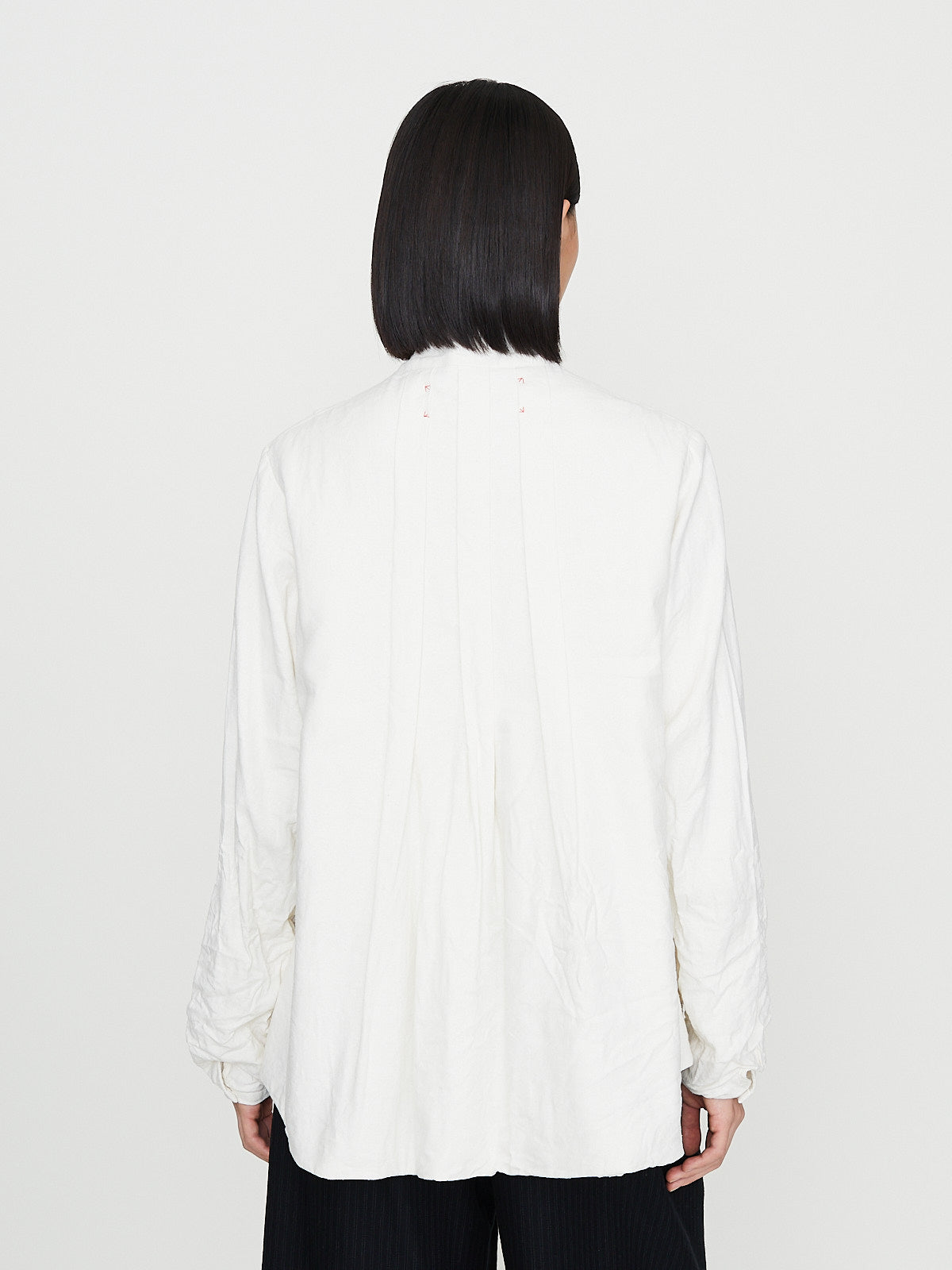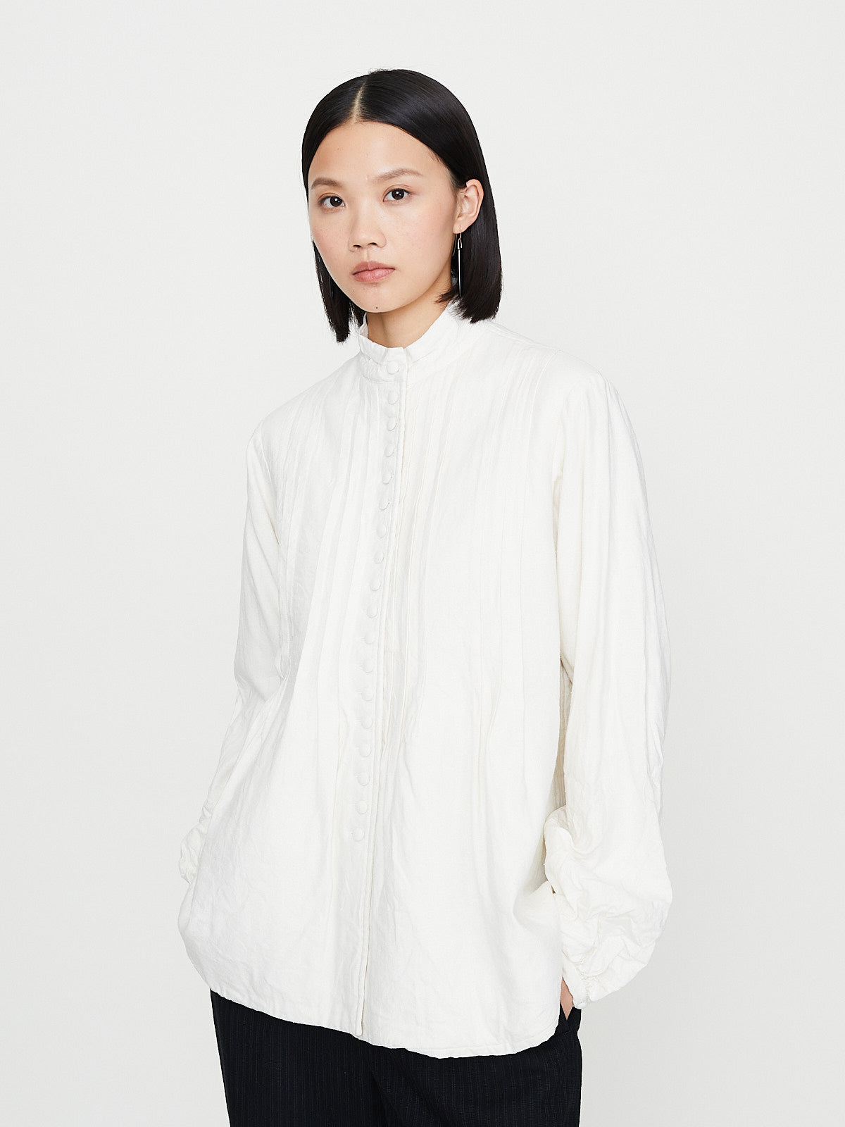 Voluminous shirt in off white napped silk/linen inspired by a baptismal gown from the 1920s. Stand  collar, front button fastening and long blouson sleeves with buttoned cuffs. Features a 3-pleat detail at the back of the neck and pin-tucks detailing on the front. A-line silhouette.