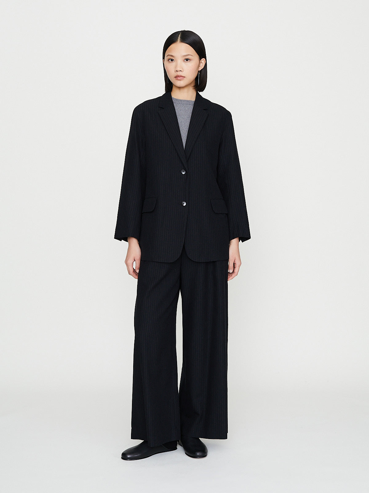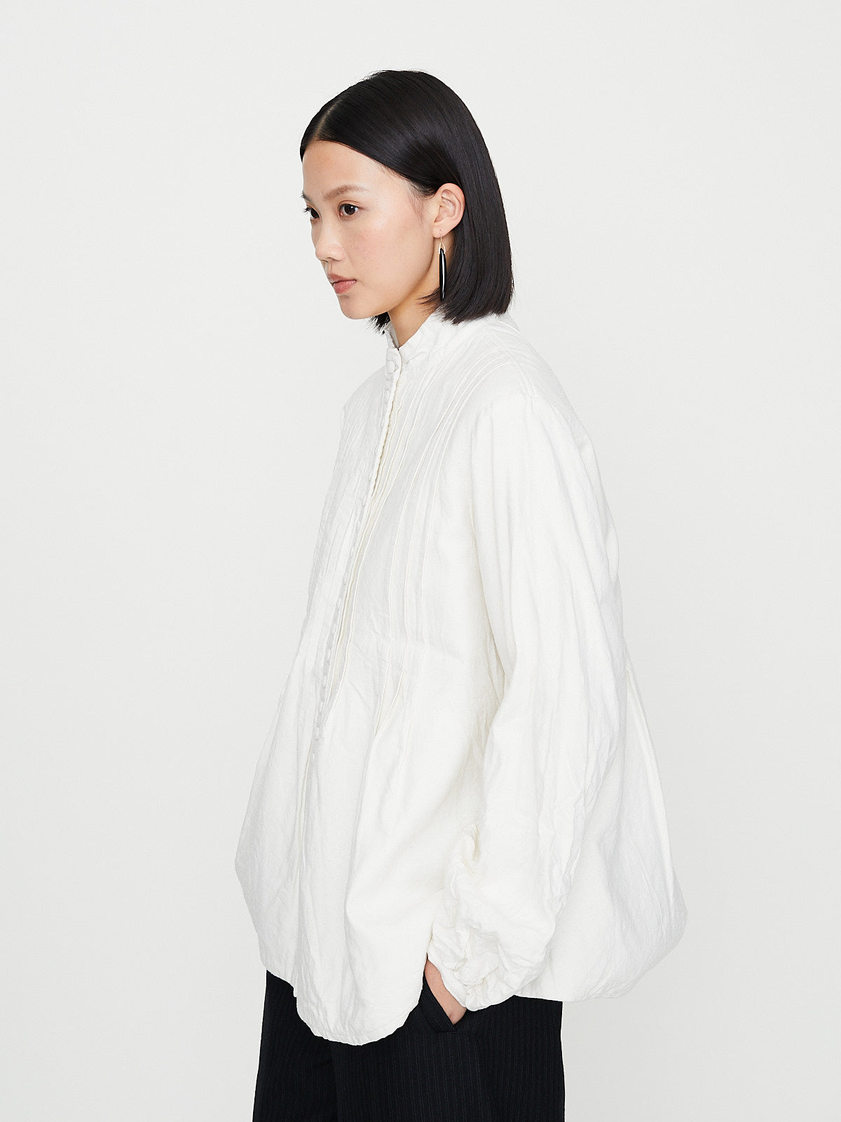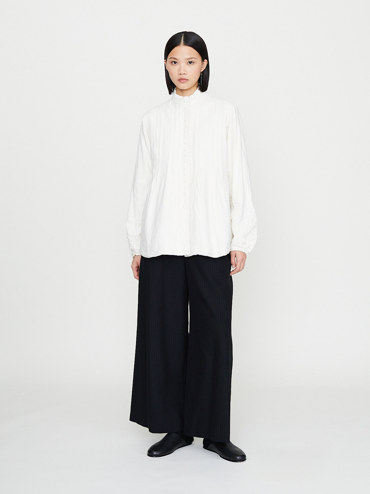 Voluminous shirt in off white napped silk/linen inspired by a baptismal gown from the 1920s. Stand  collar, front button fastening and long blouson sleeves with buttoned cuffs. Features a 3-pleat detail at the back of the neck and pin-tucks detailing on the front. A-line silhouette.