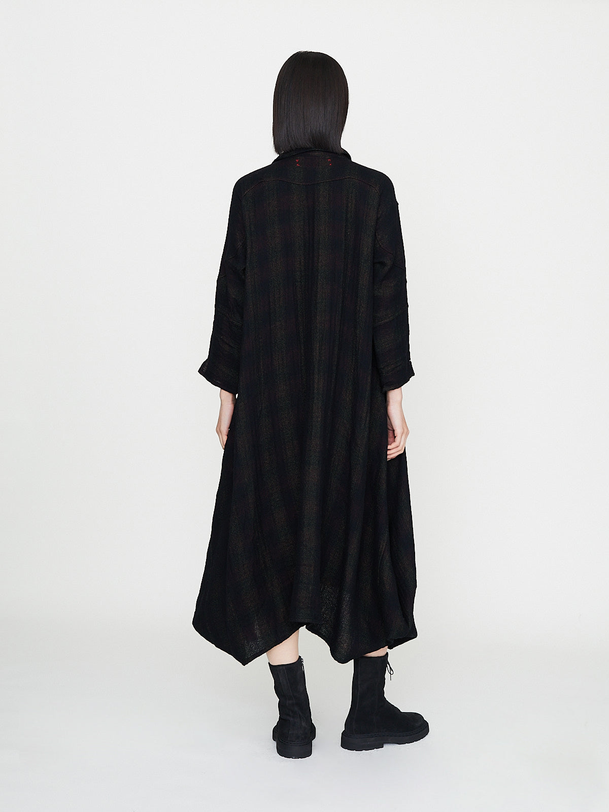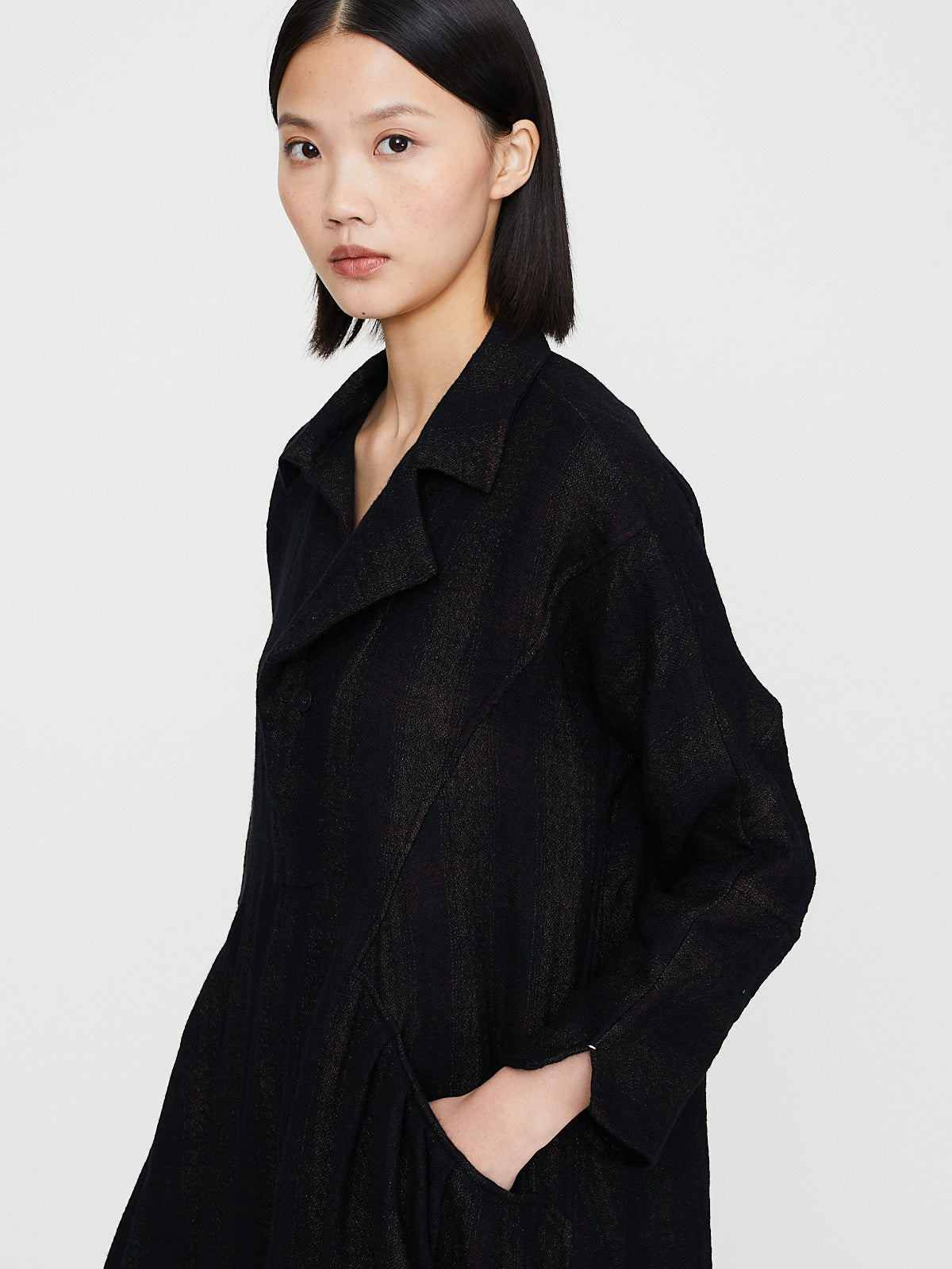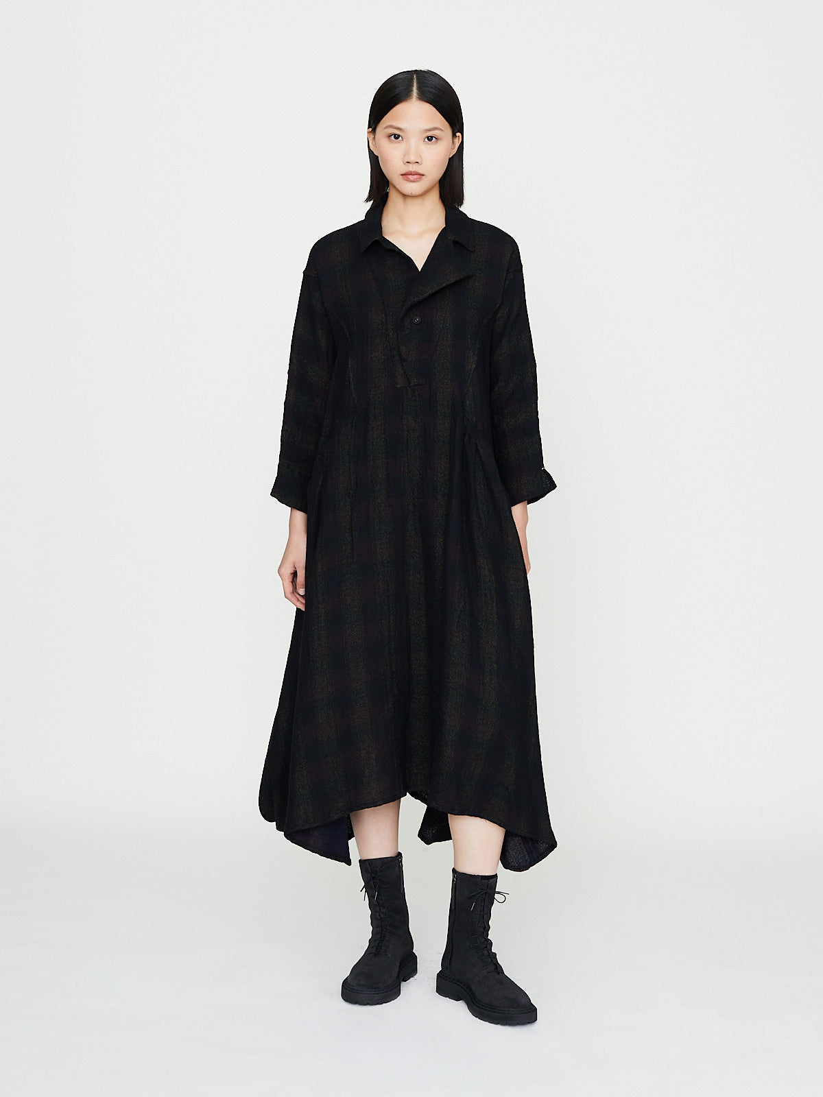Flowy dress in black checked wool blend. Notched collar, partial front button fastening and 3/4 sleeves with slits at the cuffs. Scoop pockets with a gathering detail on the front. Hemline is longer at the sides. A-line silhouette.