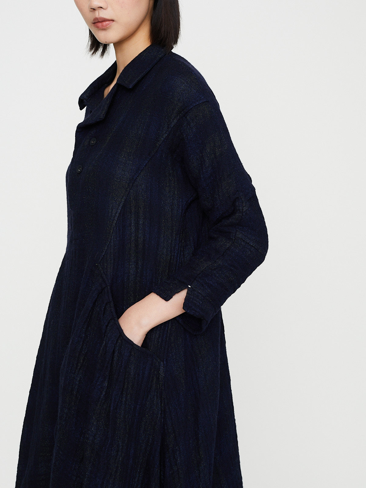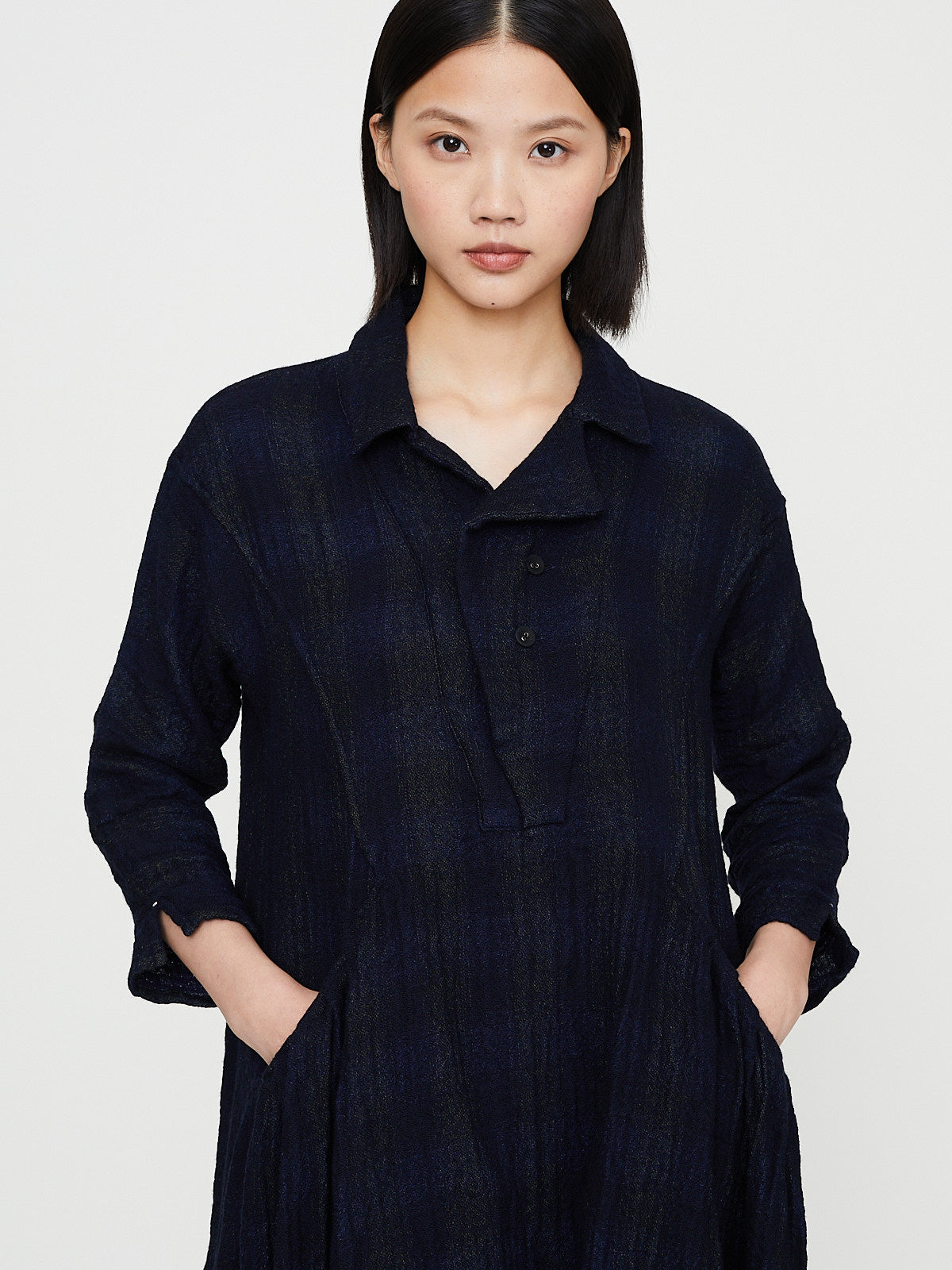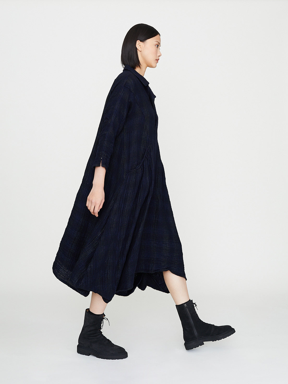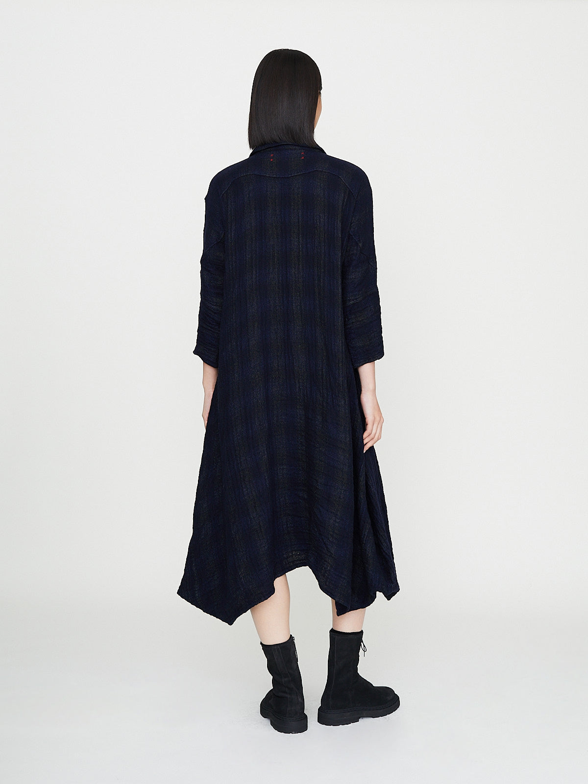Flowy dress in navy checked wool blend. Notched collar, partial front button fastening and 3/4 sleeves with slits at the cuffs. Scoop pockets with a gathering detail on the front. Hemline is longer on the sides. A-line silhouette.