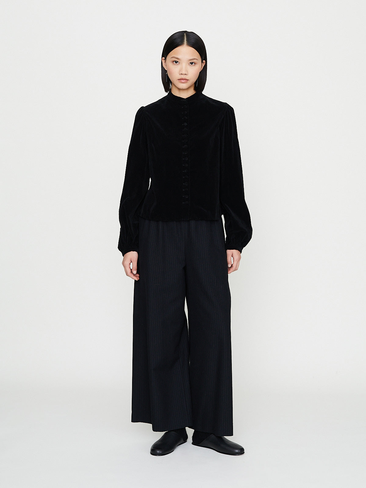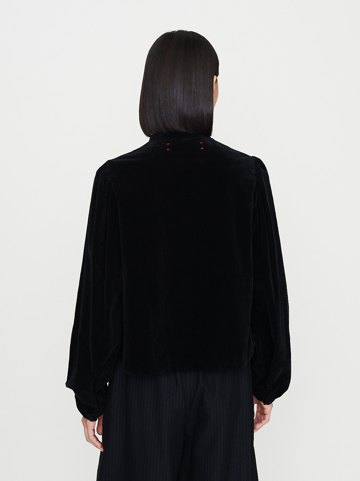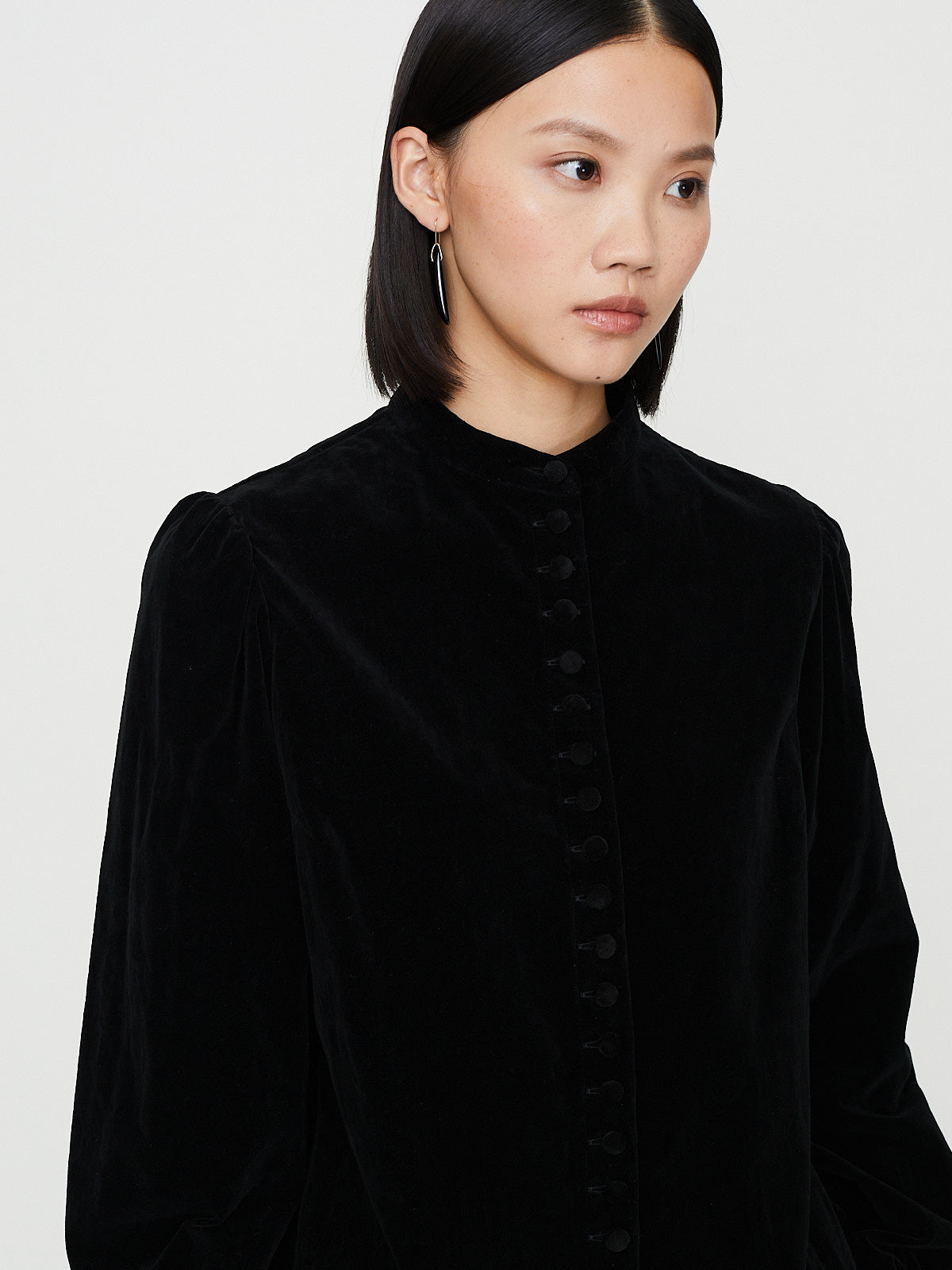 Victorian blouse in black cotton blend velveteen. Banded collar and a front fabric-covered button fastening. Long blouson sleeves with a puff shoulder and buttoned cuffs. Boxy fit.