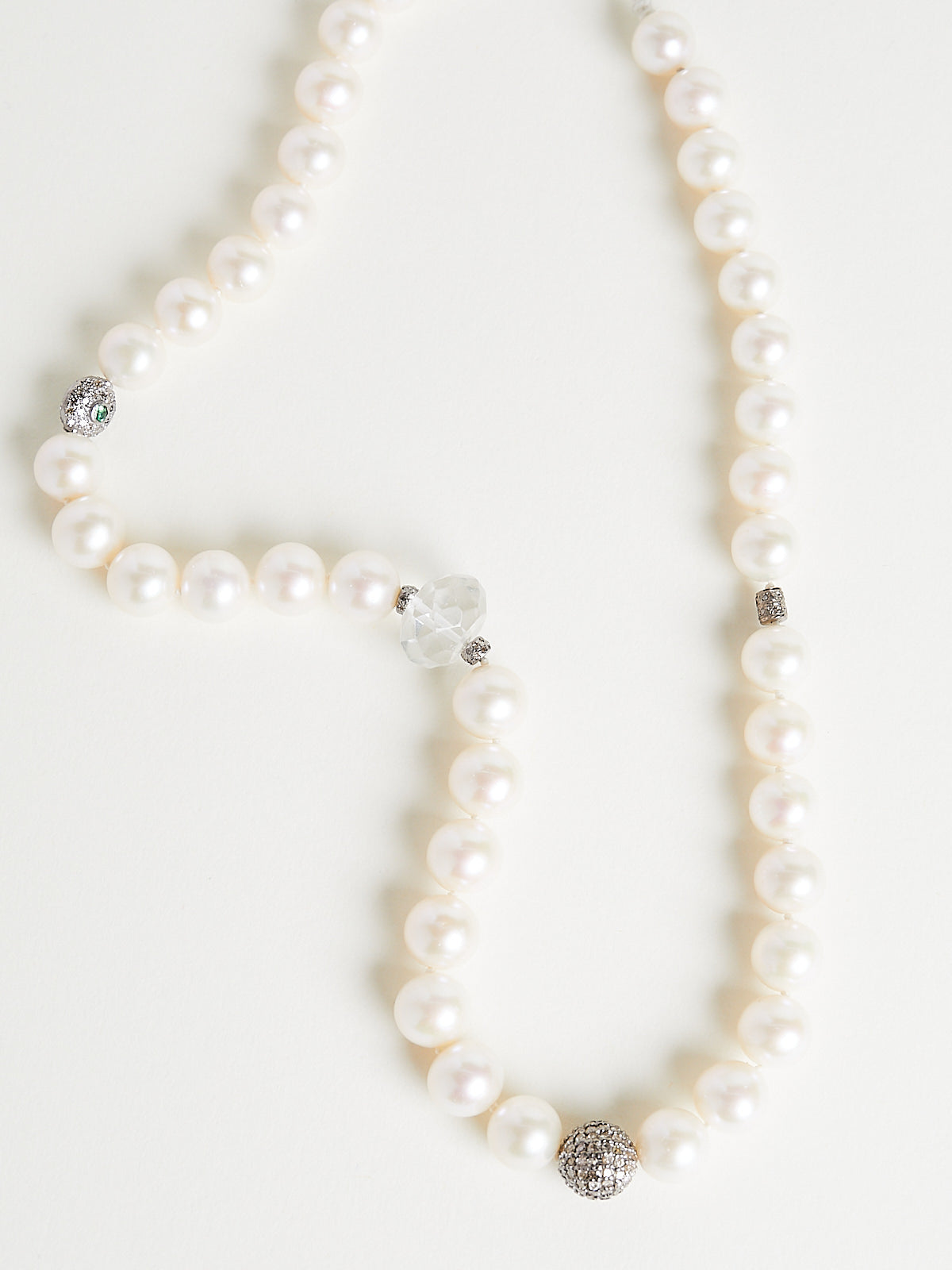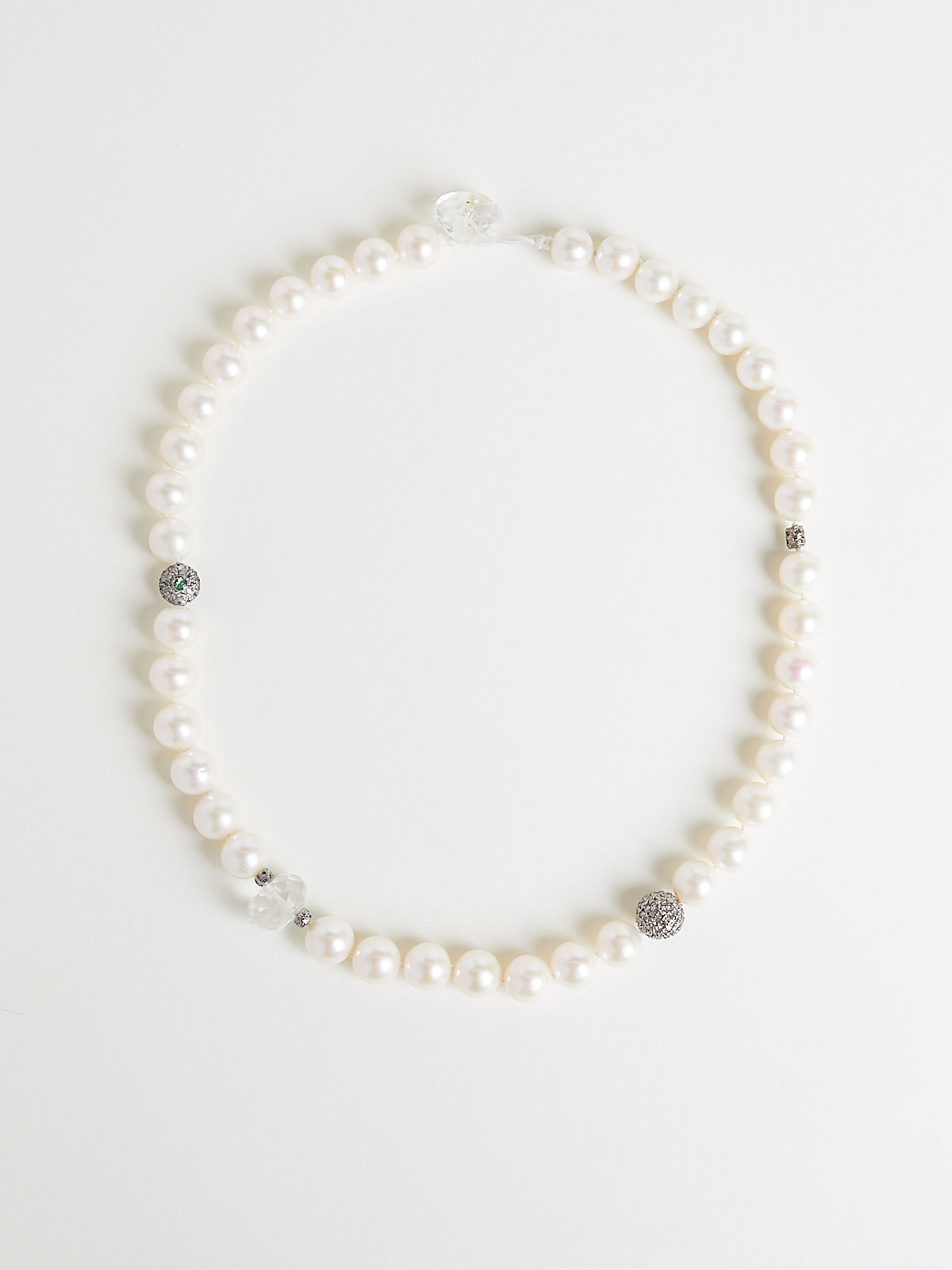Necklace with white pearls and an eclectic mix of semi-precious stones. Features sterling silver and enamel motifs set with grey diamonds. Features a toggle clasp.