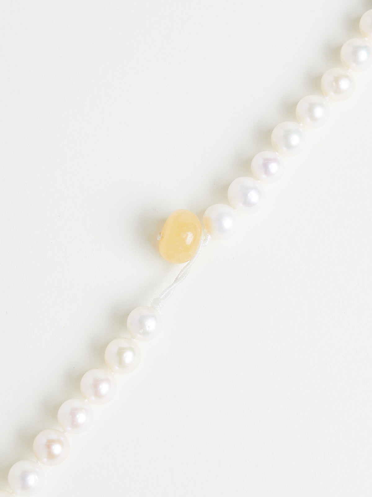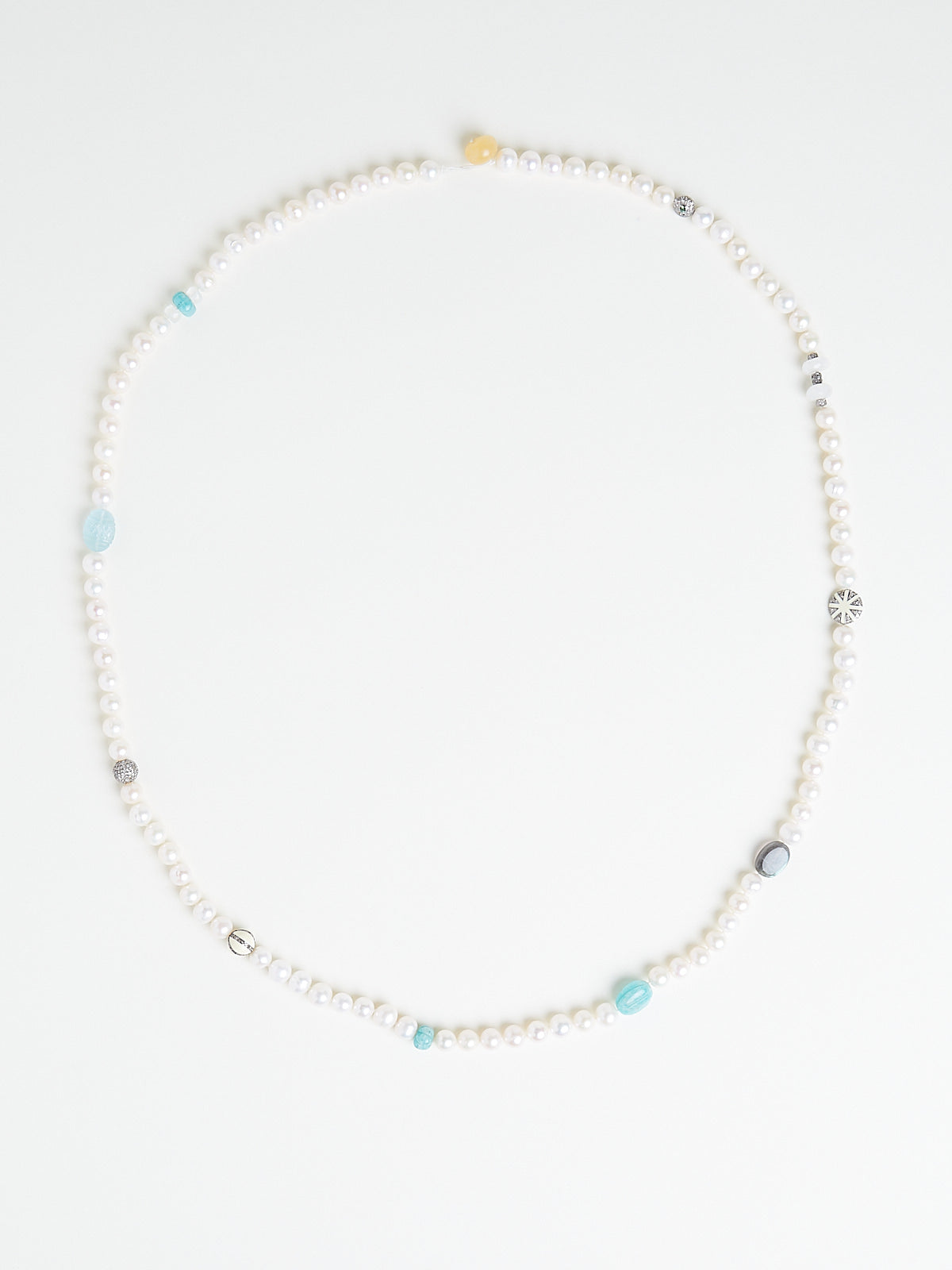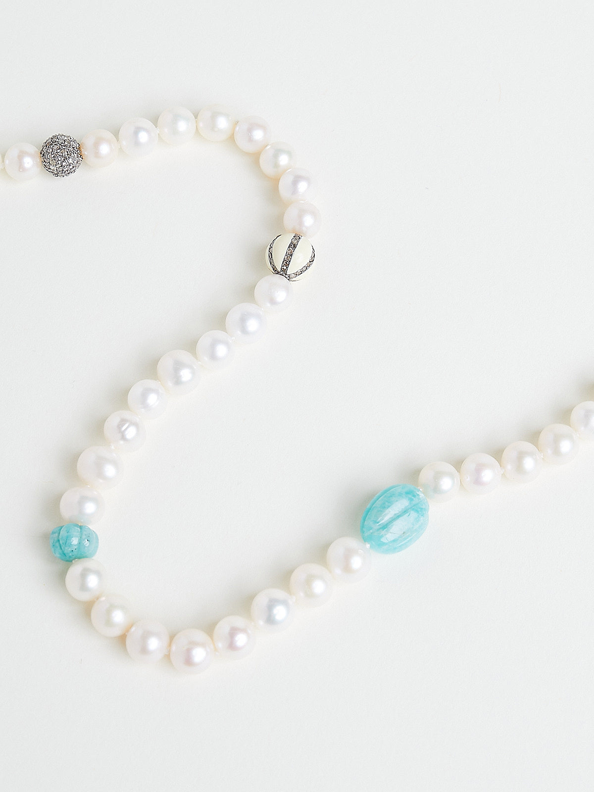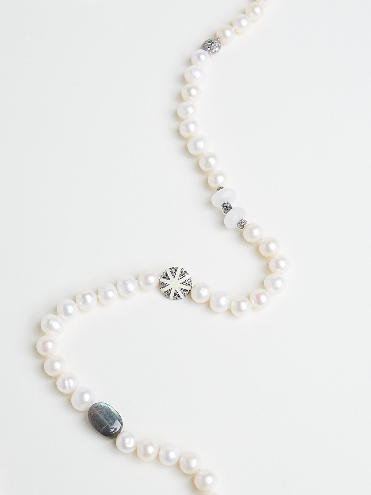 Necklace with white freshwater pearls and an eclectic mix of semi-precious stones. Features sterling silver and enamel motifs set with grey diamonds. Can be worn as a single strand or layered. Features a toggle clasp.