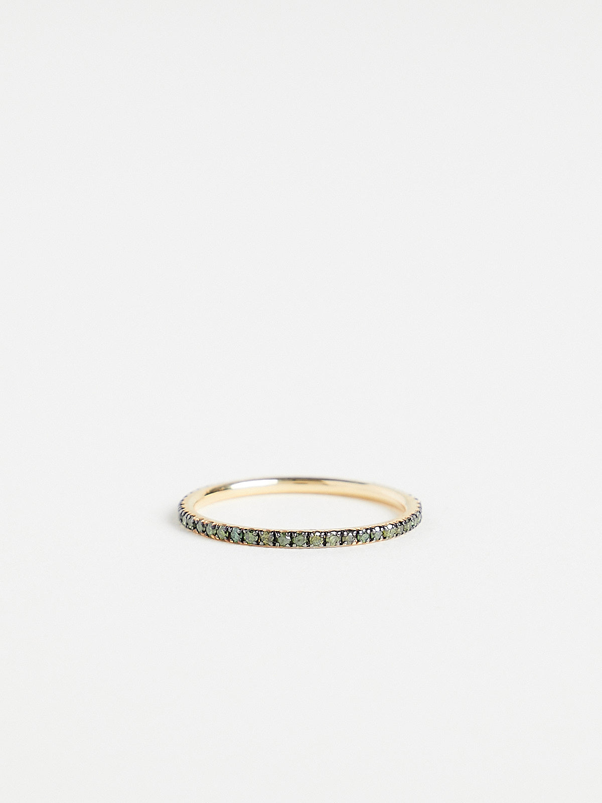 Thread band in polished 18k yellow gold encrusted with green 0.3ct pavé diamonds surrounded by oxidised detailing.