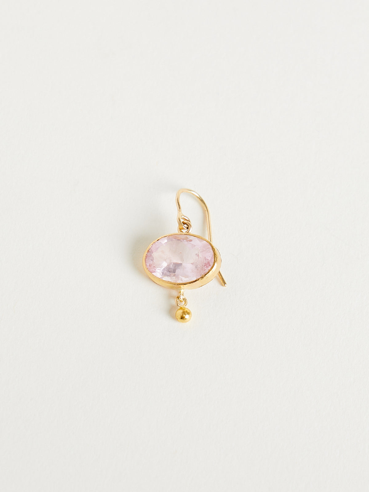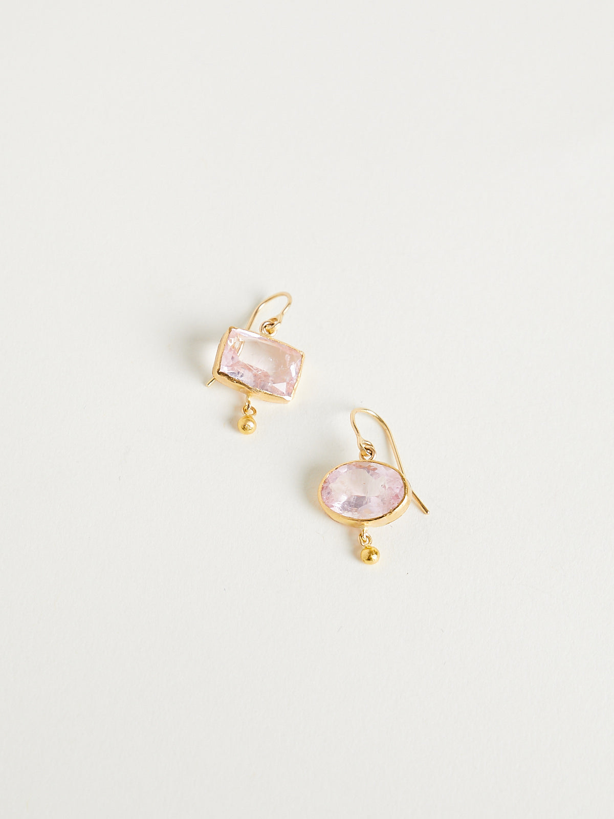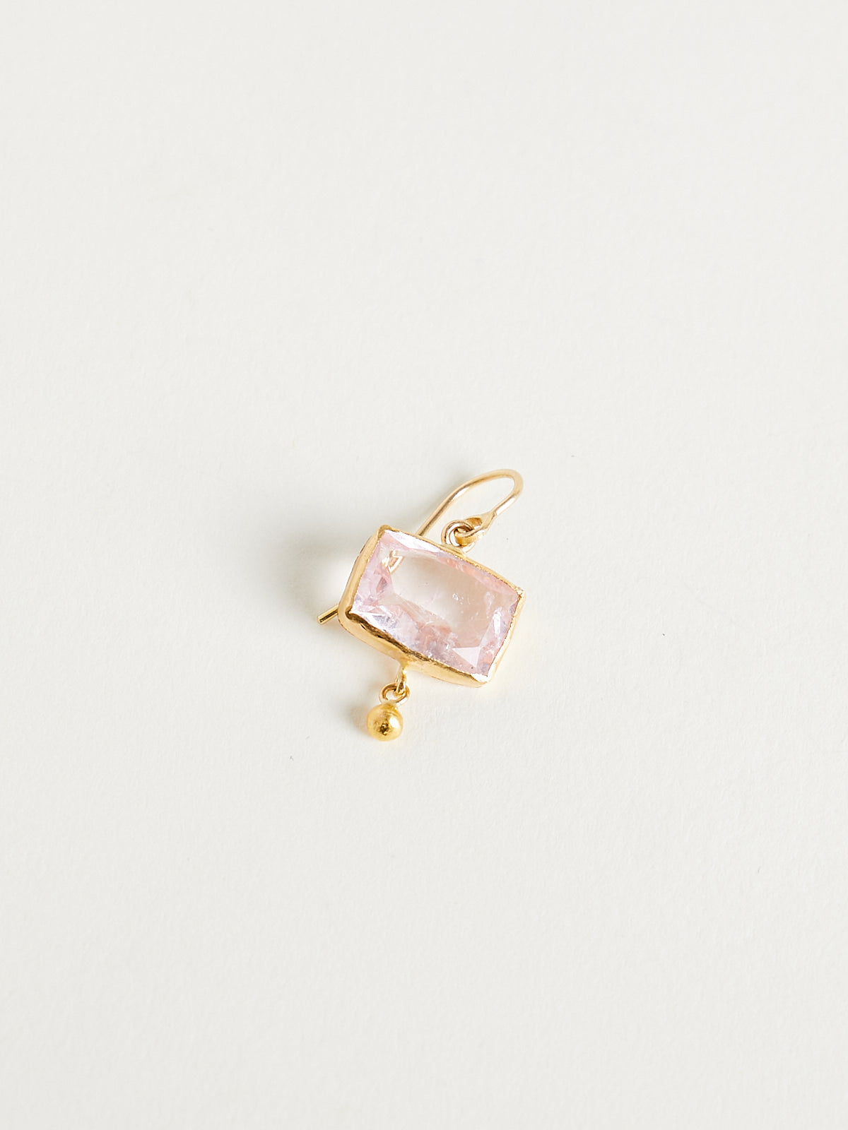 Handmade earring in 18k yellow gold with one rectangular and one oval morganite drop (10.16ct) and tiny dangling gold spheres. Features an ear wire backing.