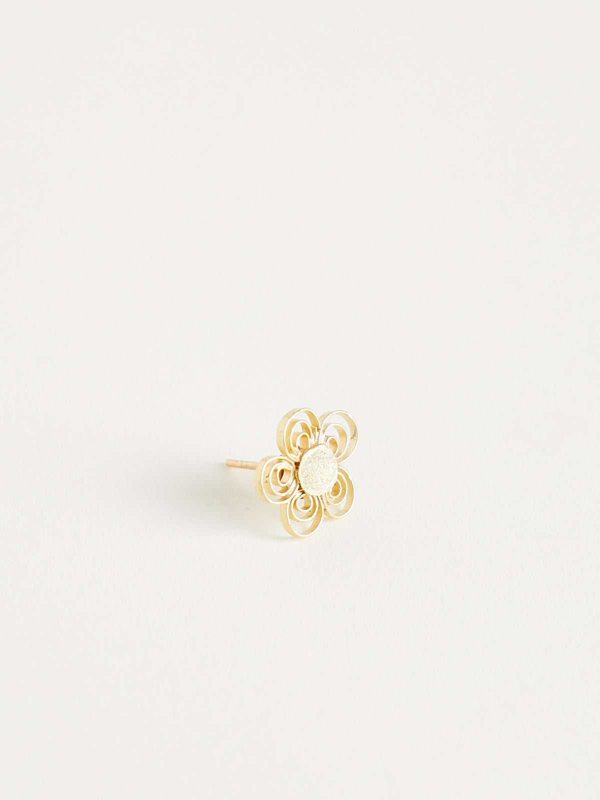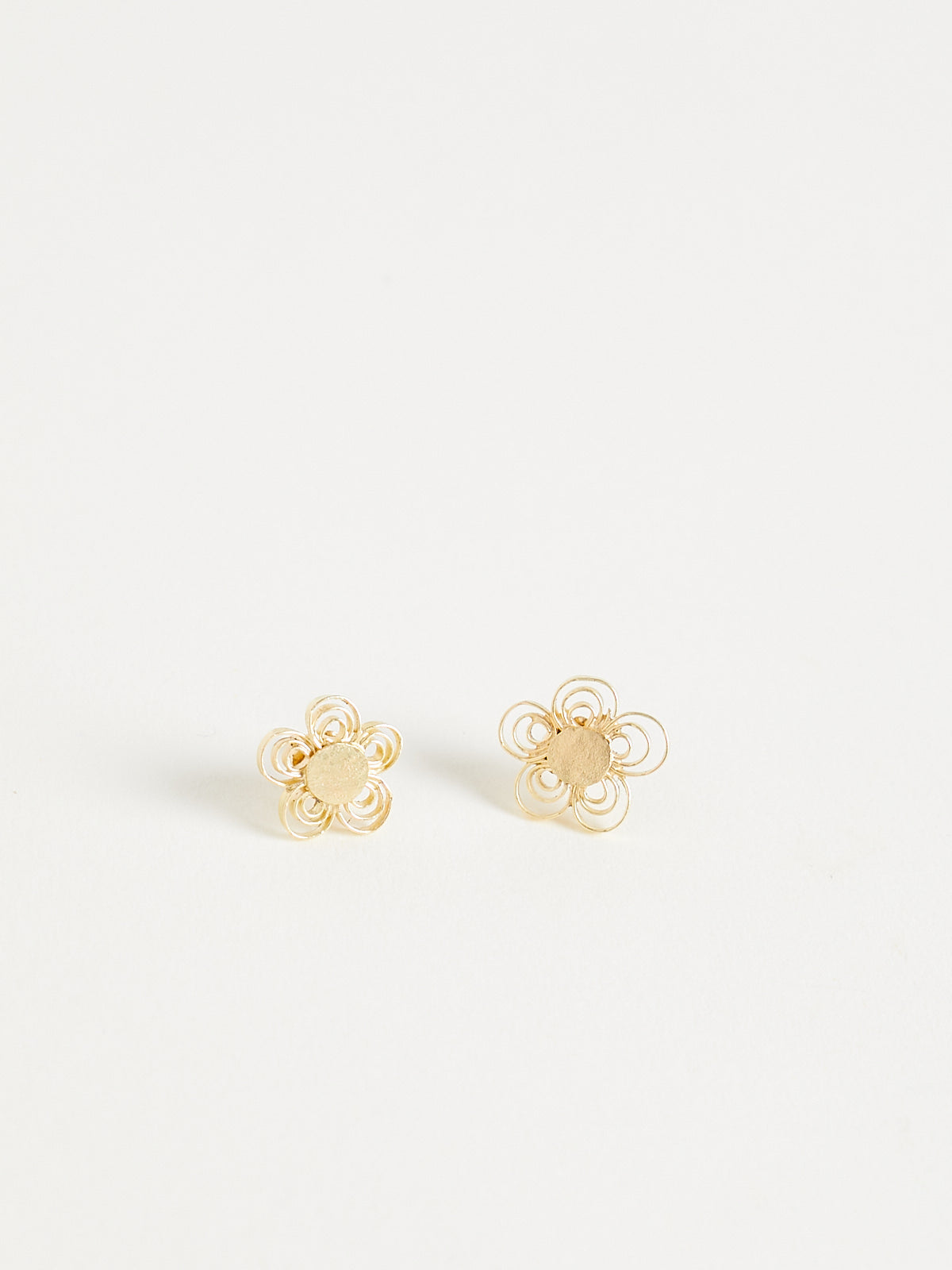 Handmade intricate flower ear studs in 18k yellow gold. Features an ear post backing.