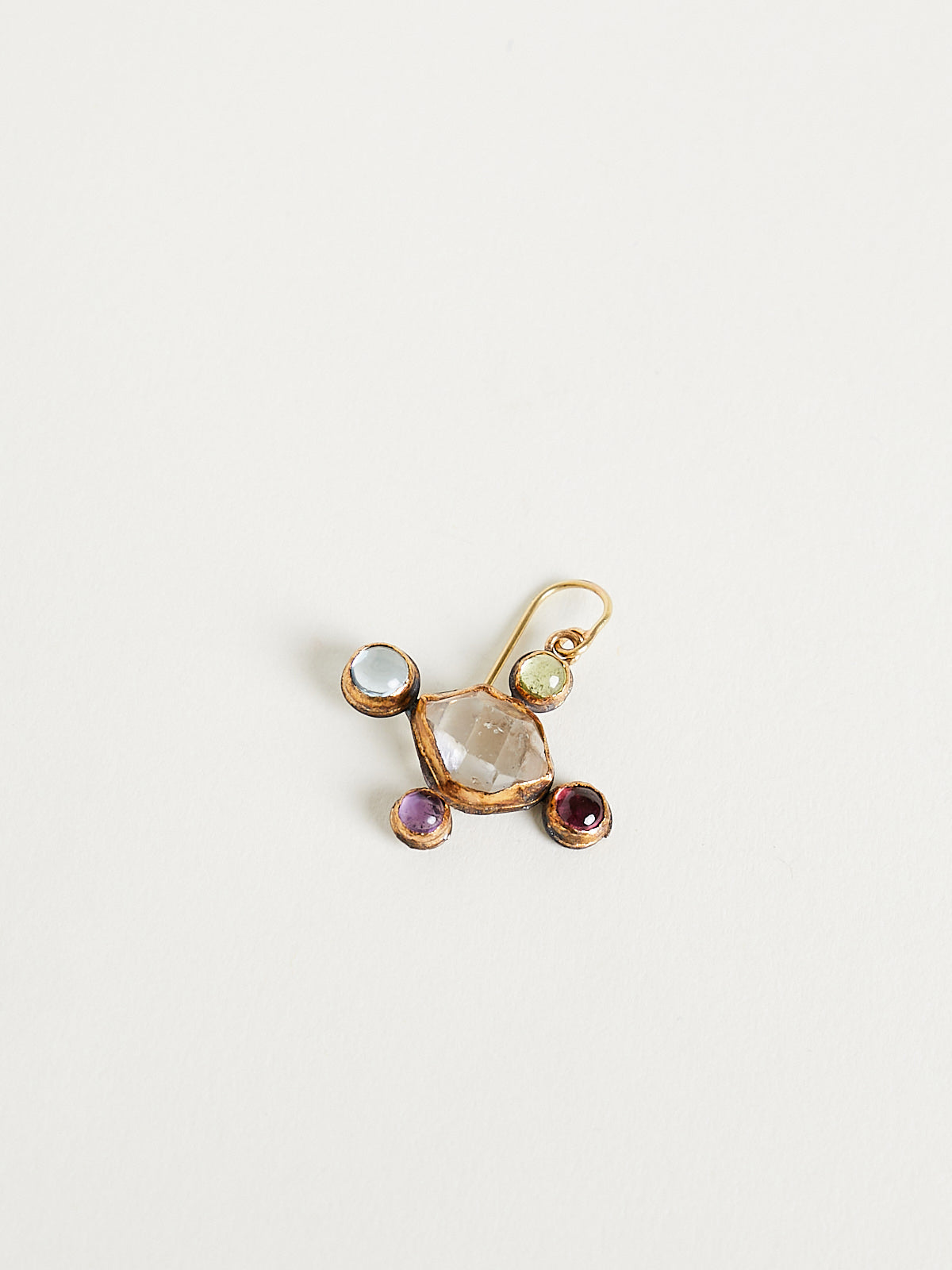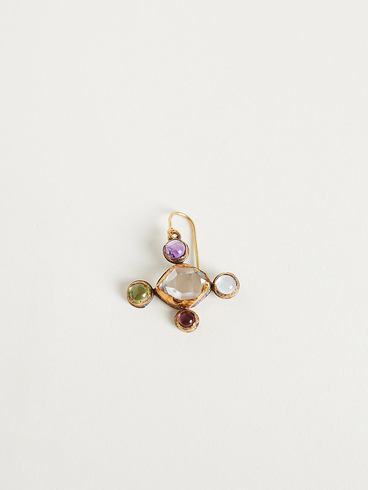 Handmade cross-shaped earrings in 18k yellow gold and sterling silver with Herkimer diamonds surrounded by multi-coloured gemstones. Features an ear wire backing.