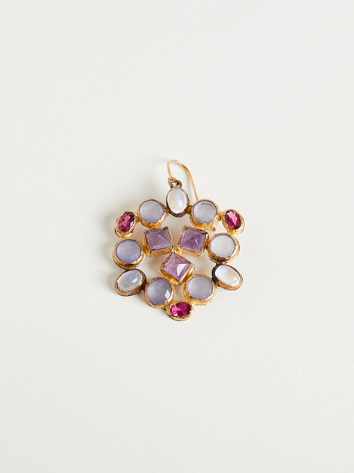 Handmade intricate mismatched kaleidoscope earrings in 18k yellow gold with 2.48ct pink tourmalines, 12.9ct amethysts, 5.33ct moonstones and 4.46ct chalcedony. Features an ear wire backing.