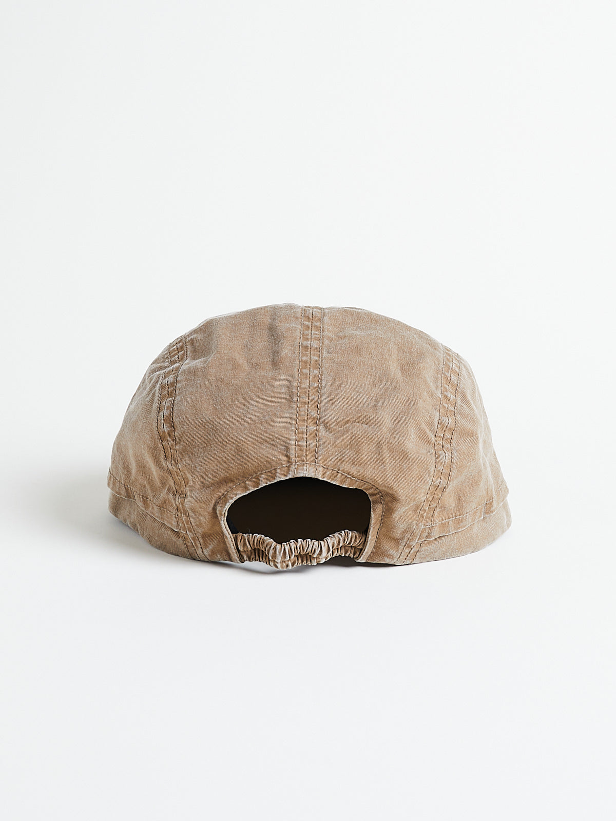 Jet cap made from pigment-coated camel cotton blend with a vintage finish. Features an  elasticated back strap and contrasting stitching.