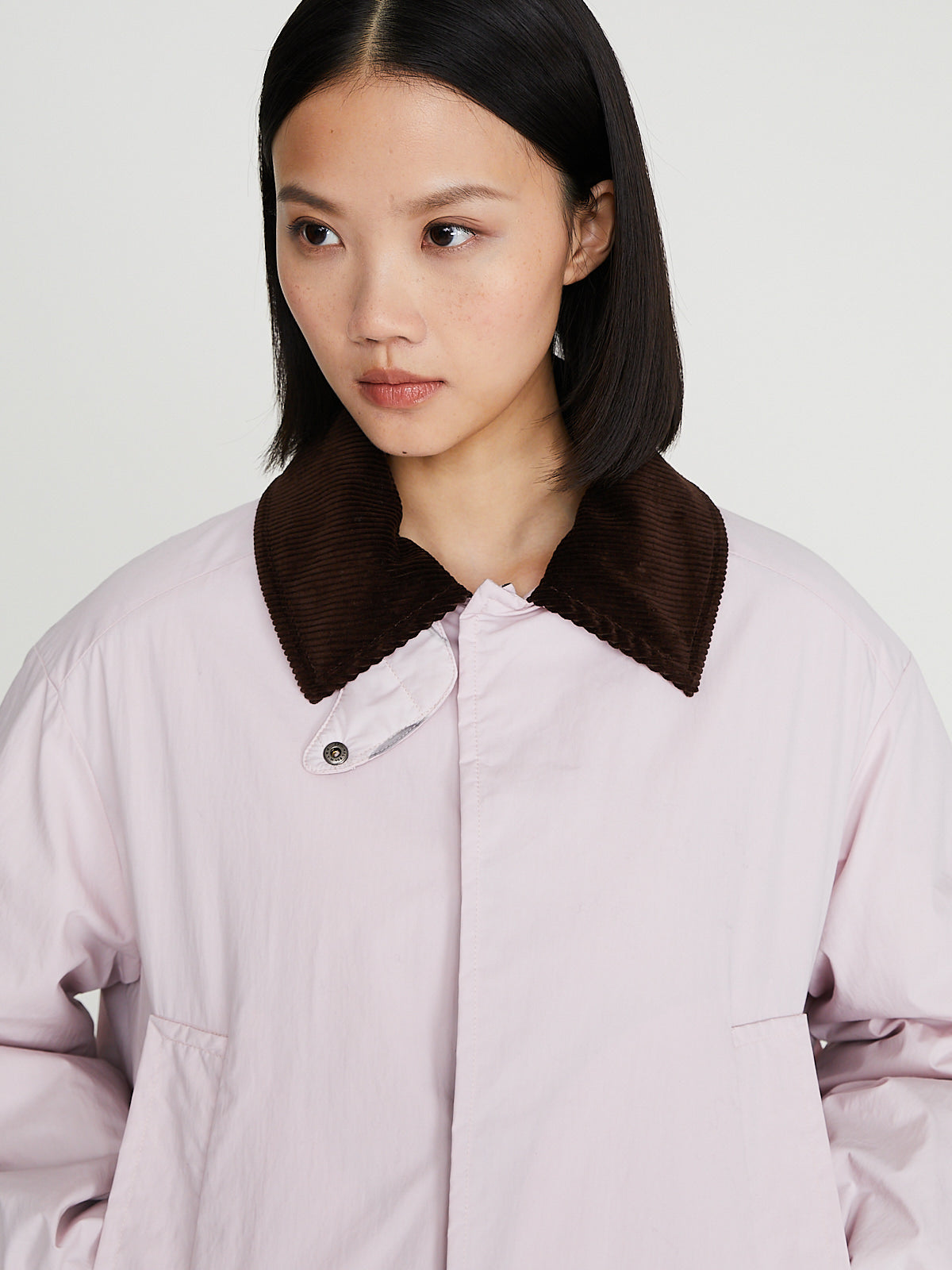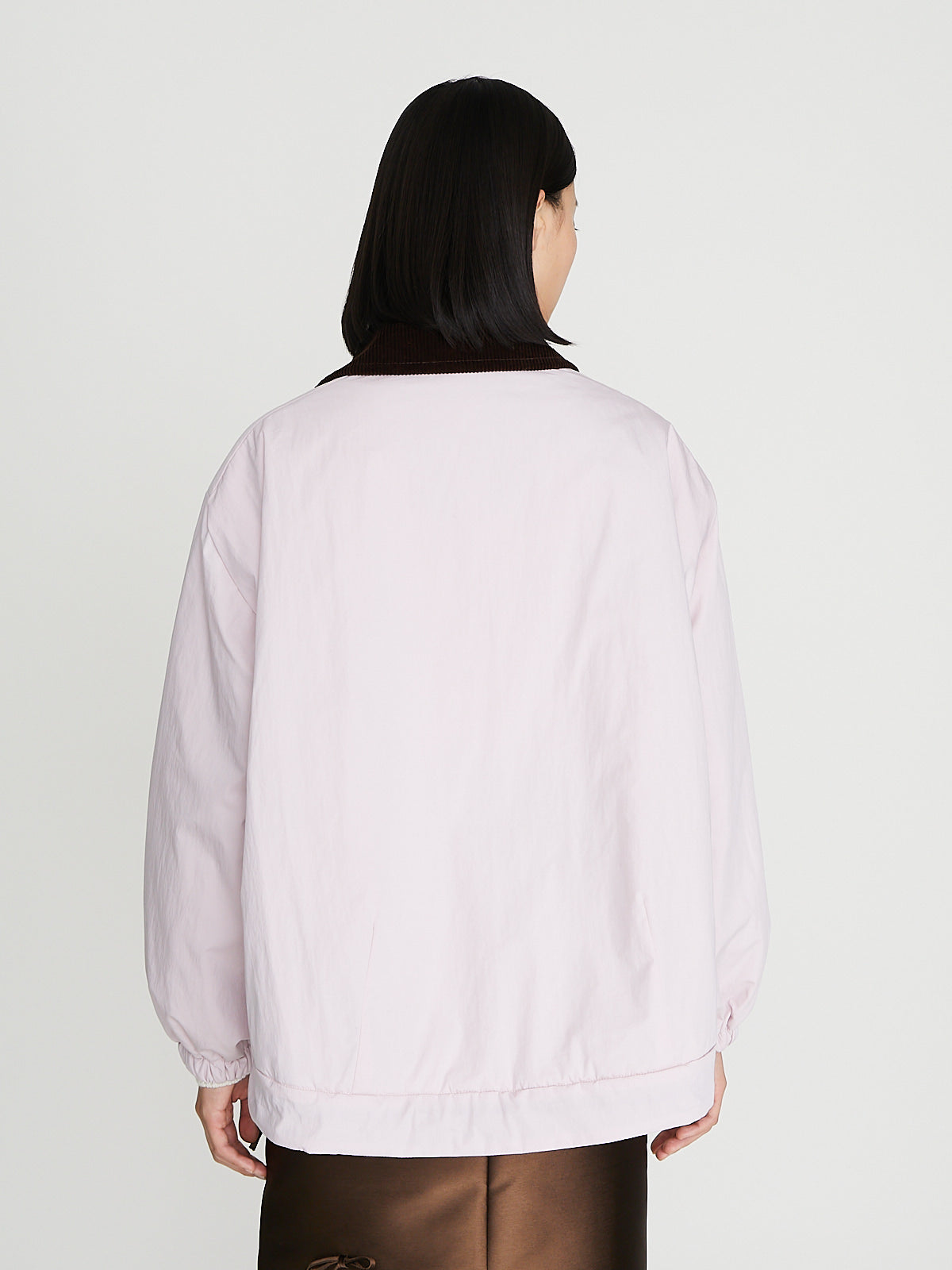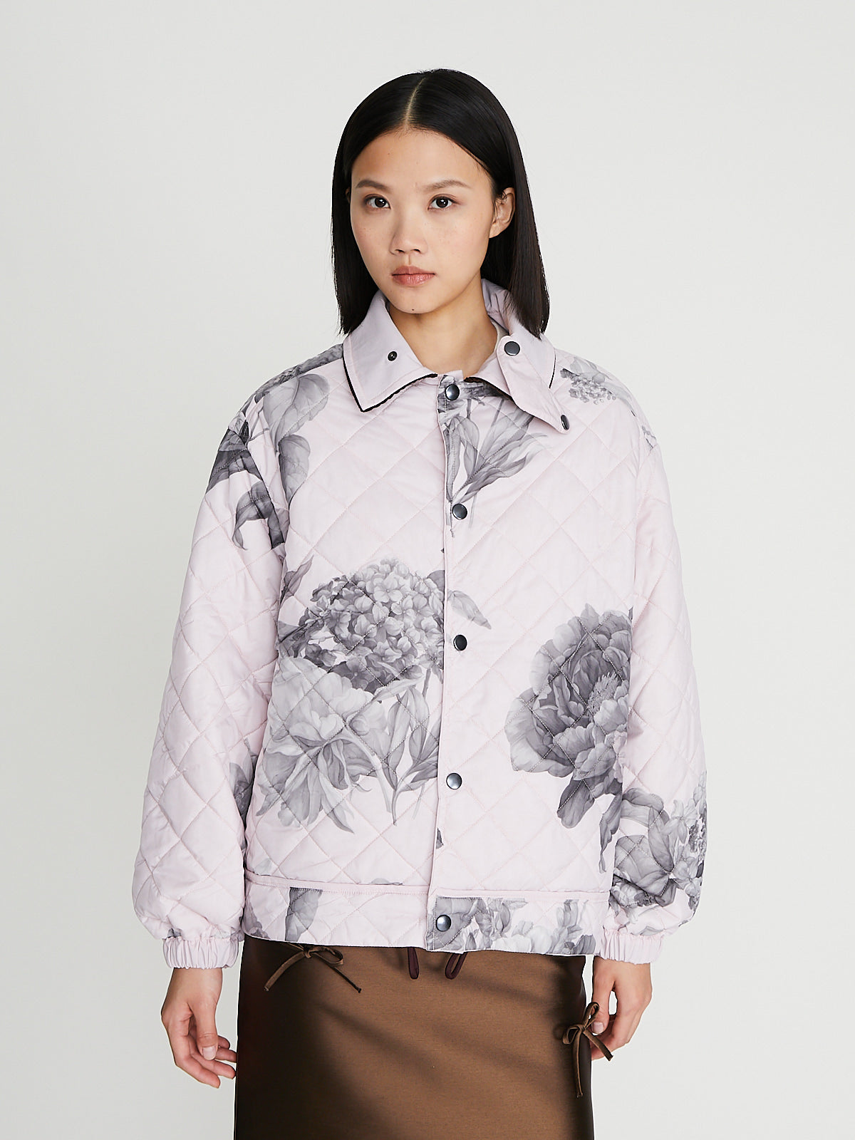 Oversized reversible bomber-style jacket. The jacket is blush pink on one side and diamond-quilted pink with a floral print on the other. Convertible collar with a throat latch, that is brown corduroy on one side and pink on the other. Front button fastening and welted slip pockets on both sides. Features elasticated cuffs and an adjustable drawstring at the bottom hem. Boxy fit.