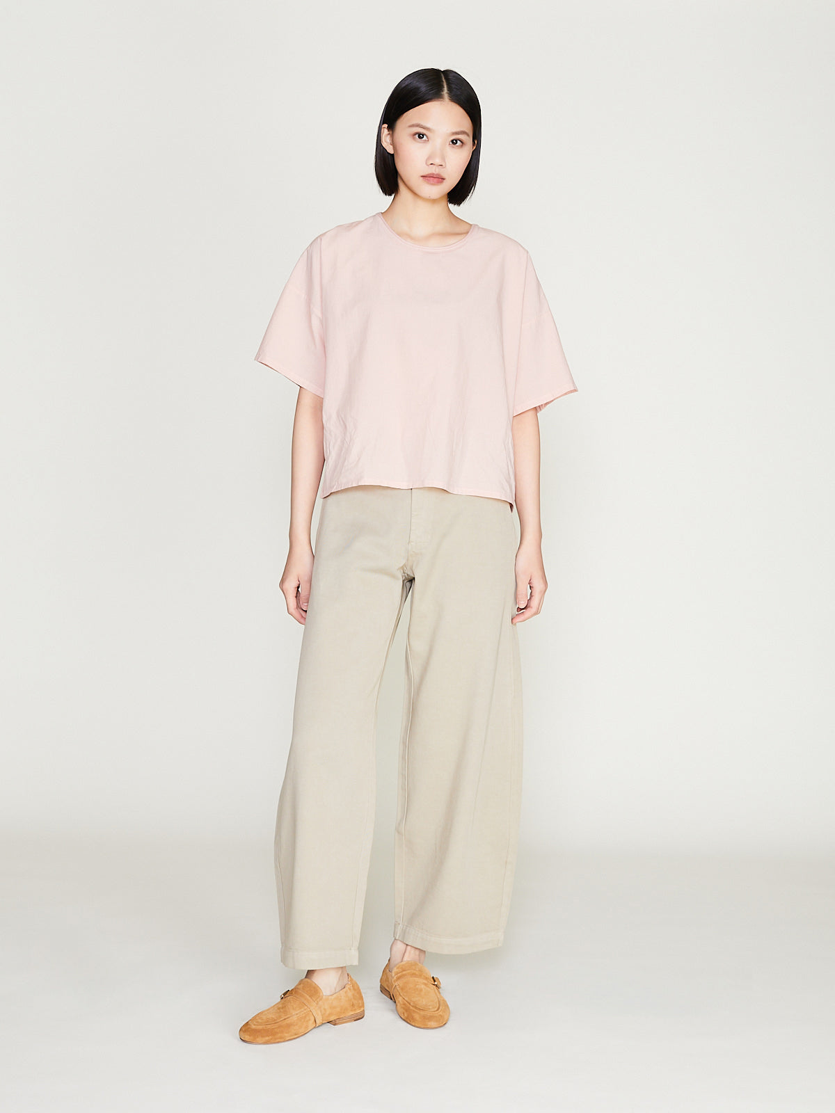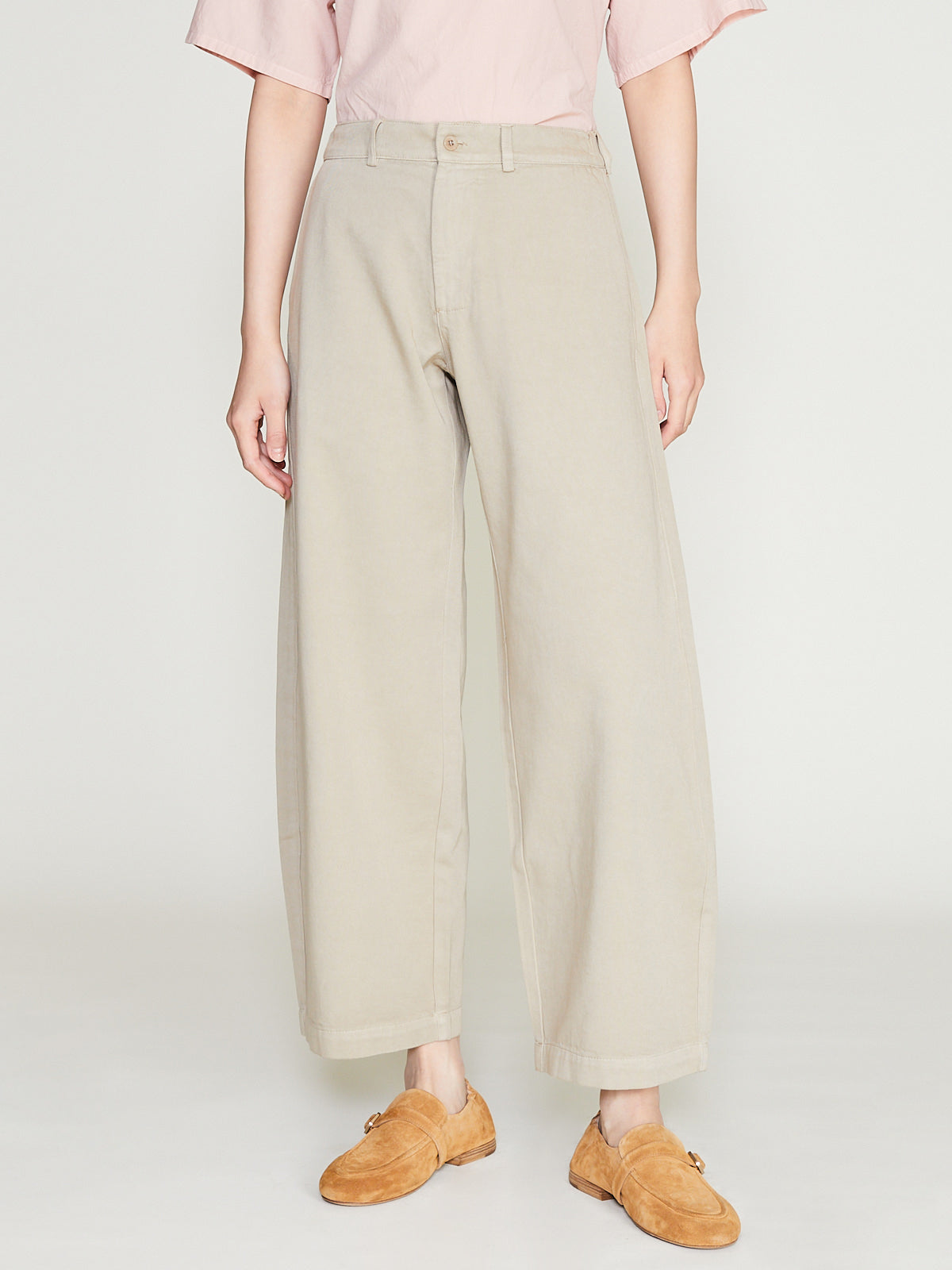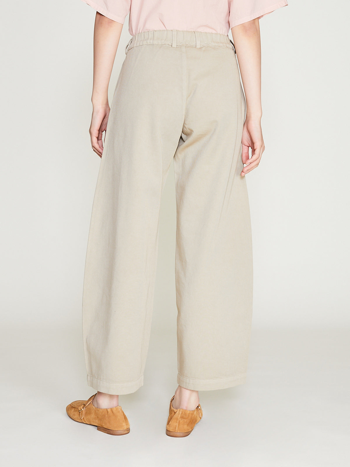 Voluminous trouser in beige twill cotton. Half elasticated waistband, belt loops, single button fastening and a zip fly. Side seam pockets. Barrel leg.