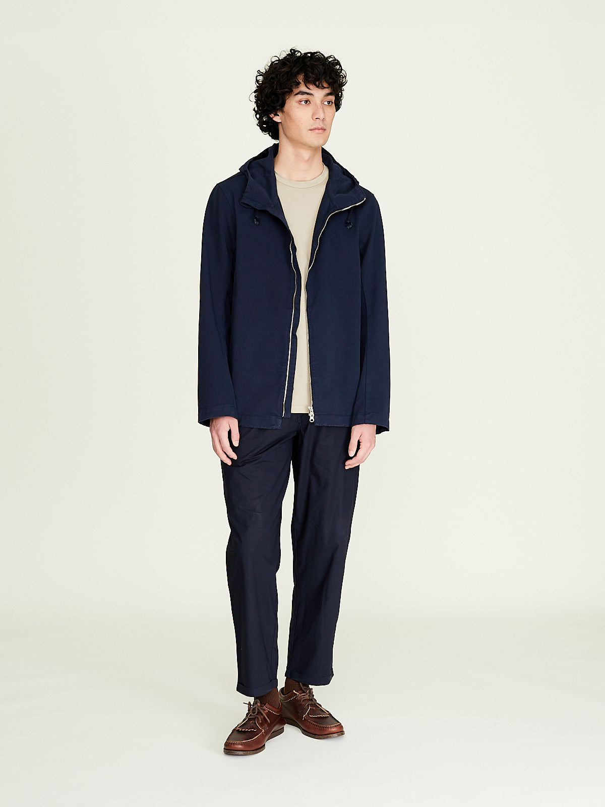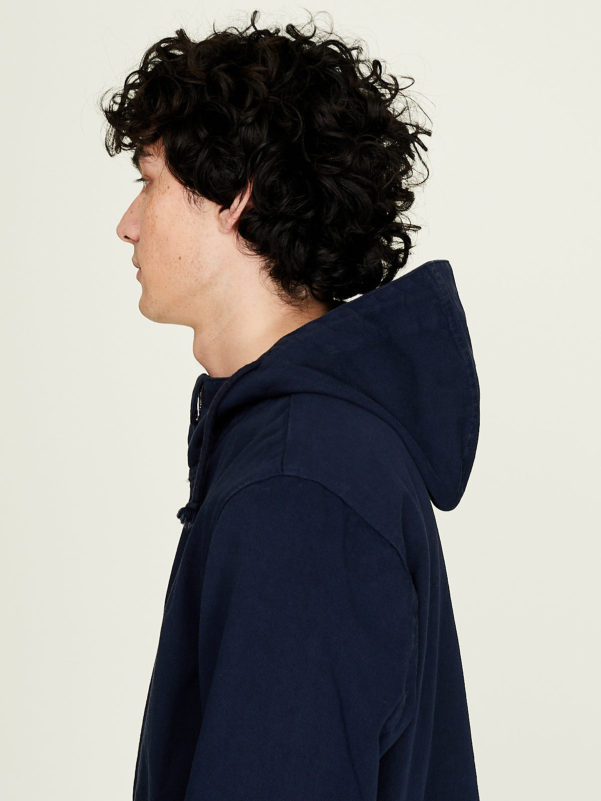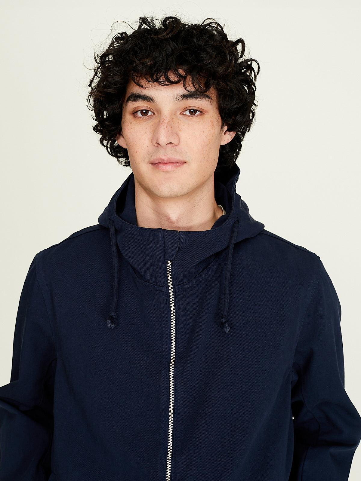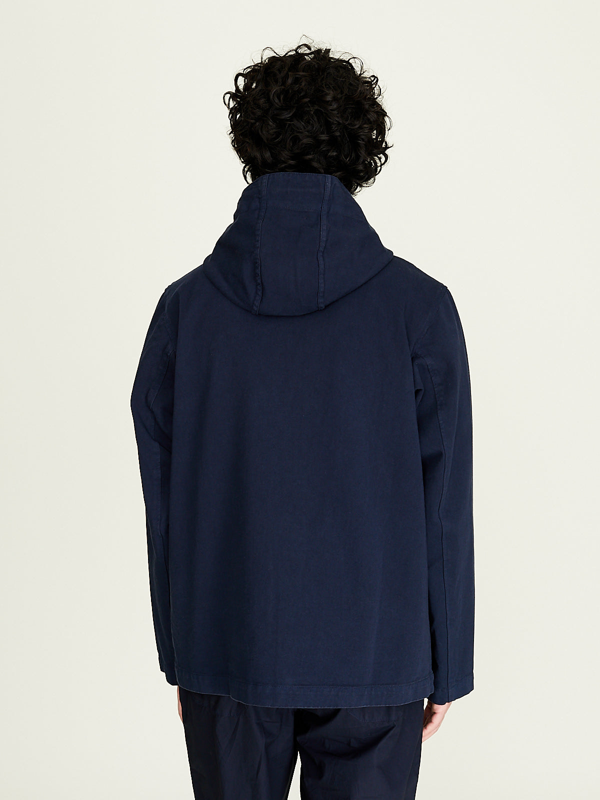 Hooded Jacket in blue cotton twill. Adjustable drawstring at the hood, front two-way zip fastening and long sleeves with a dropped shoulder. Slip pockets on the sides.
