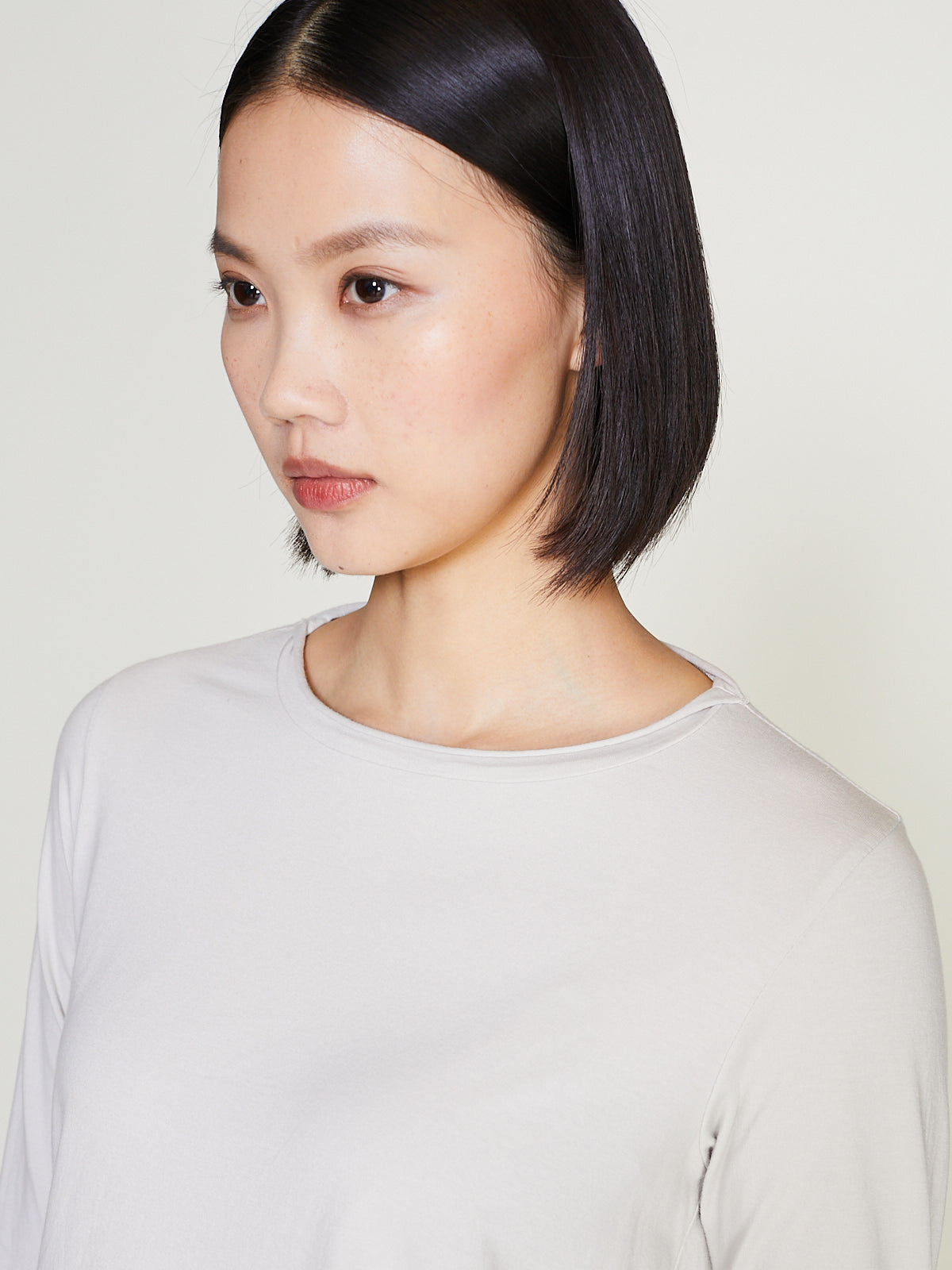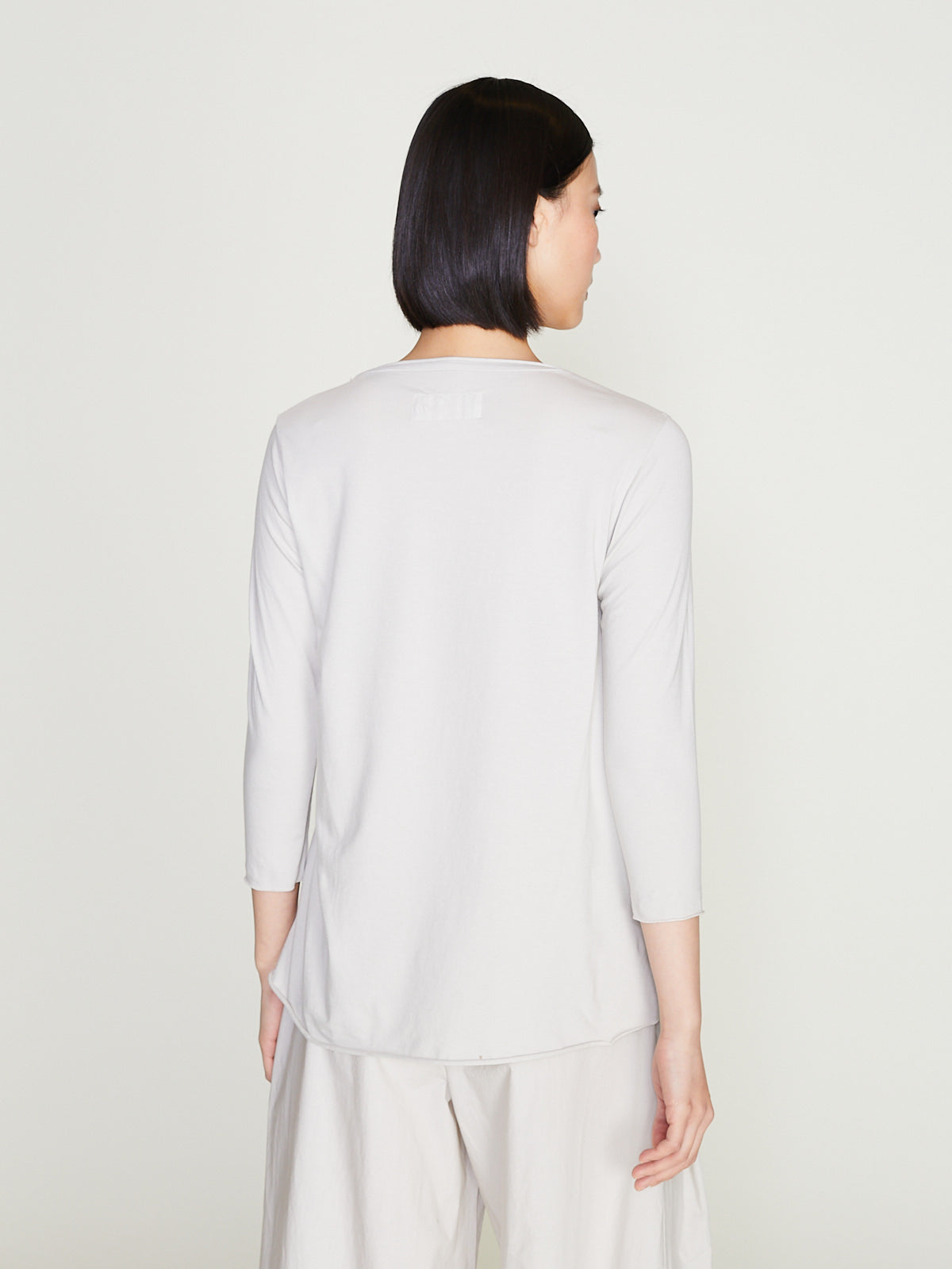 T-shirt in off white cotton jersey. Round neckline and 3/4 sleeves. Raw cuffs and bottom hem. Relaxed fit.