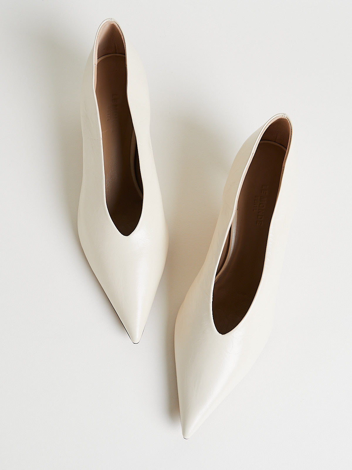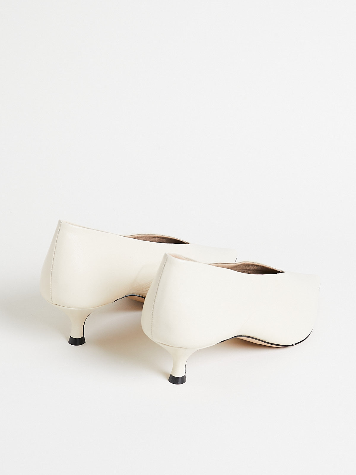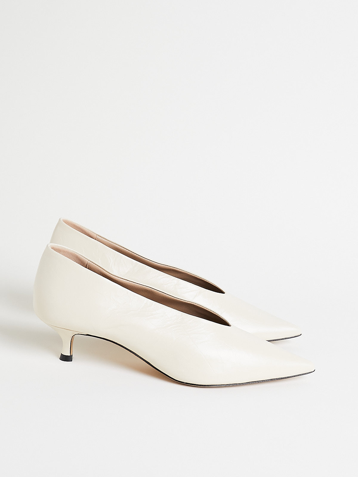 Pump in ecru naplack calf leather. Pointy toe, cushioned calf leather insole and a 40mm kitten heel.
