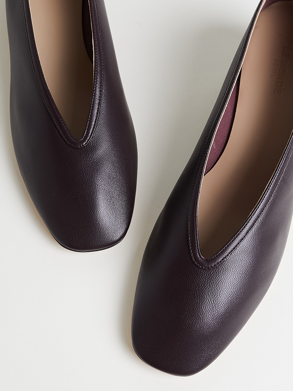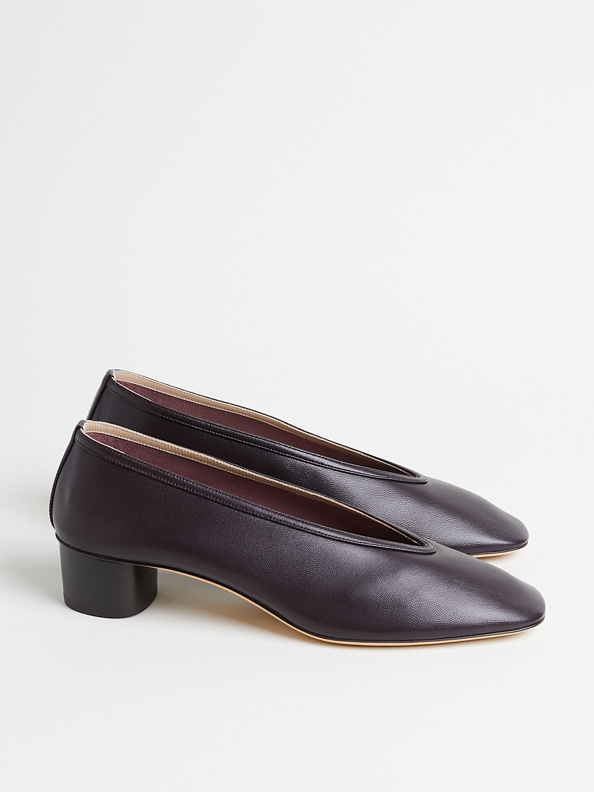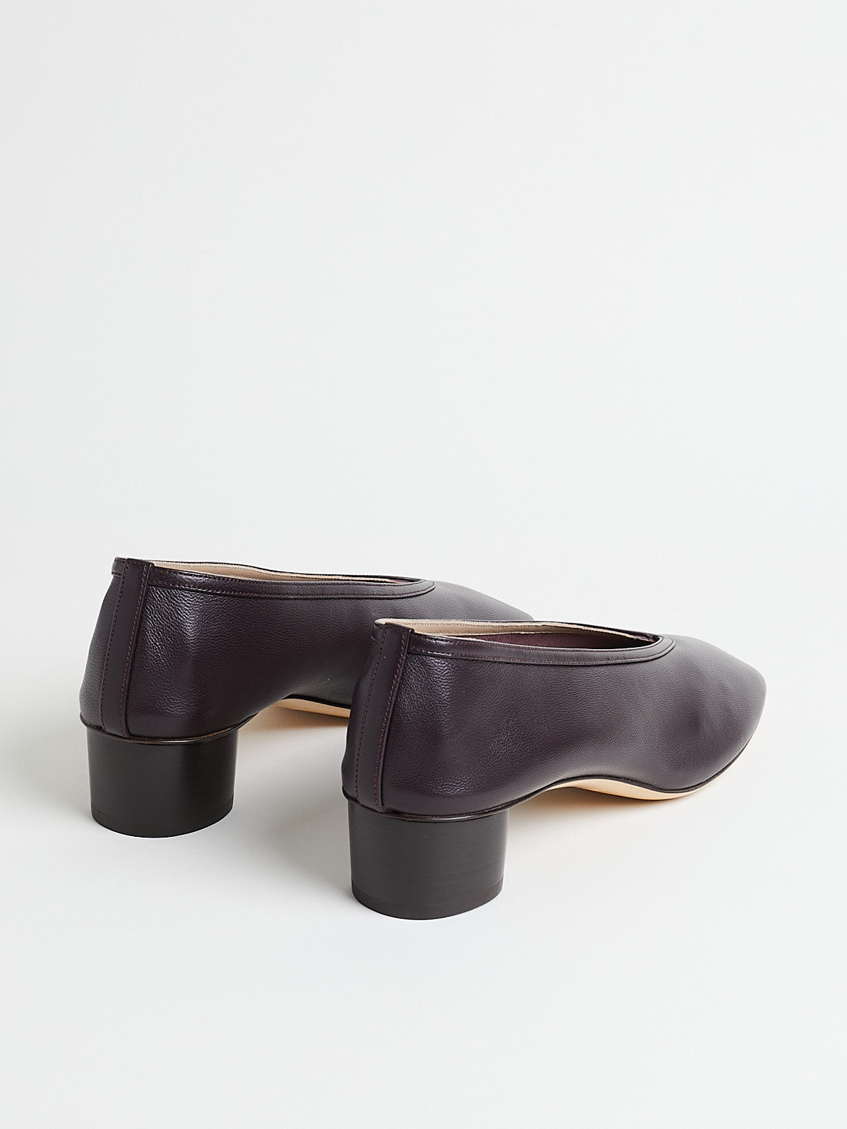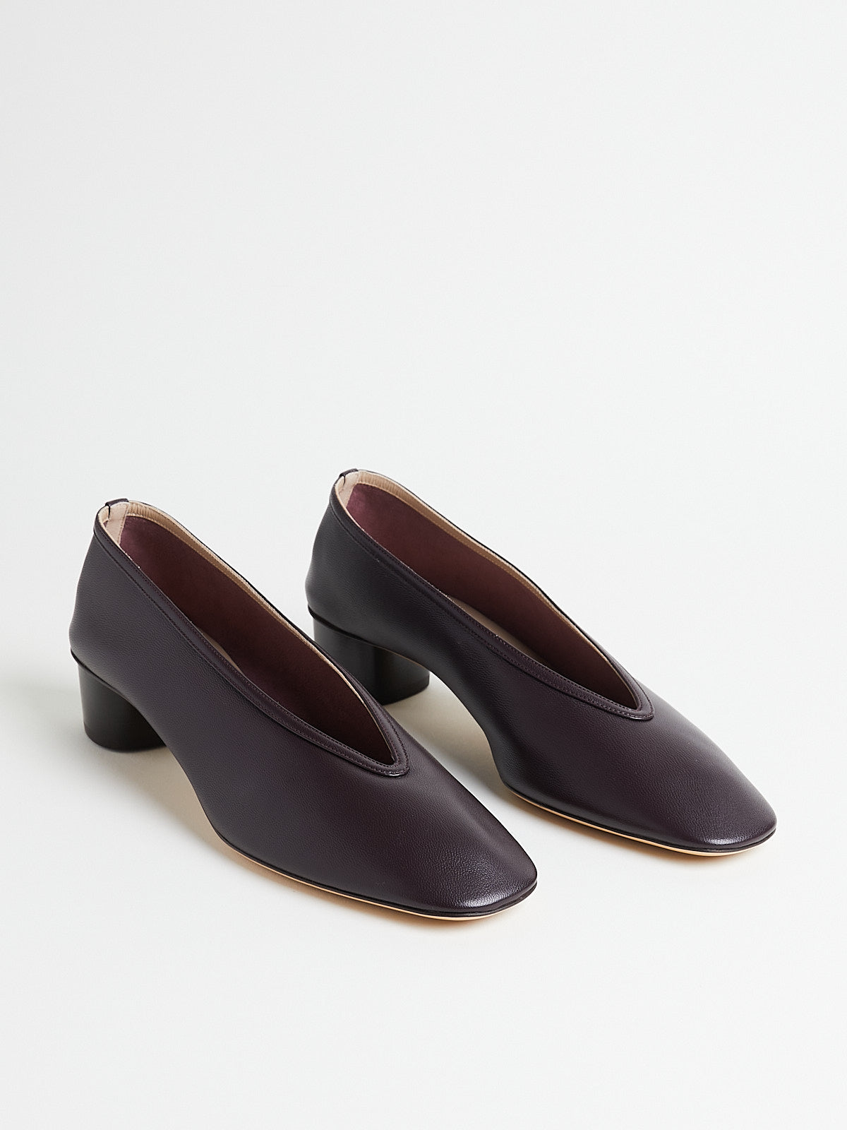 Pump in supple burgundy lamb leather. Cap toe and a cushioned calf leather insole. Features a 40mm heel. Unlined and piped edges.