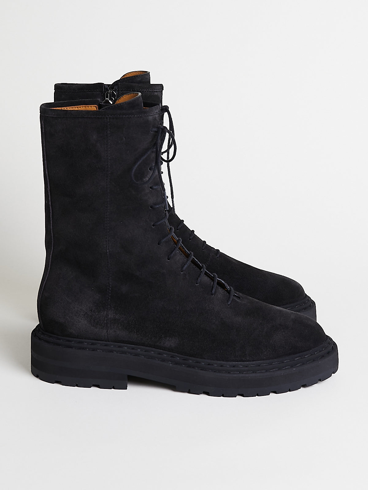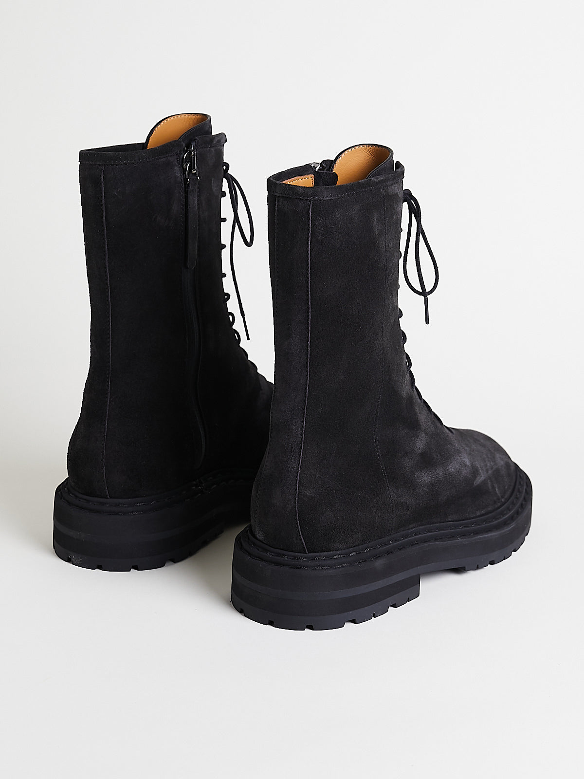 Combat boot with a black suede upper. Lace-up detail through the front and toggled zips to fasten on the inside. Round toe and a chunky black rubber tread sole. Tonal stitching detailing around the sole. Lined in nude leather.