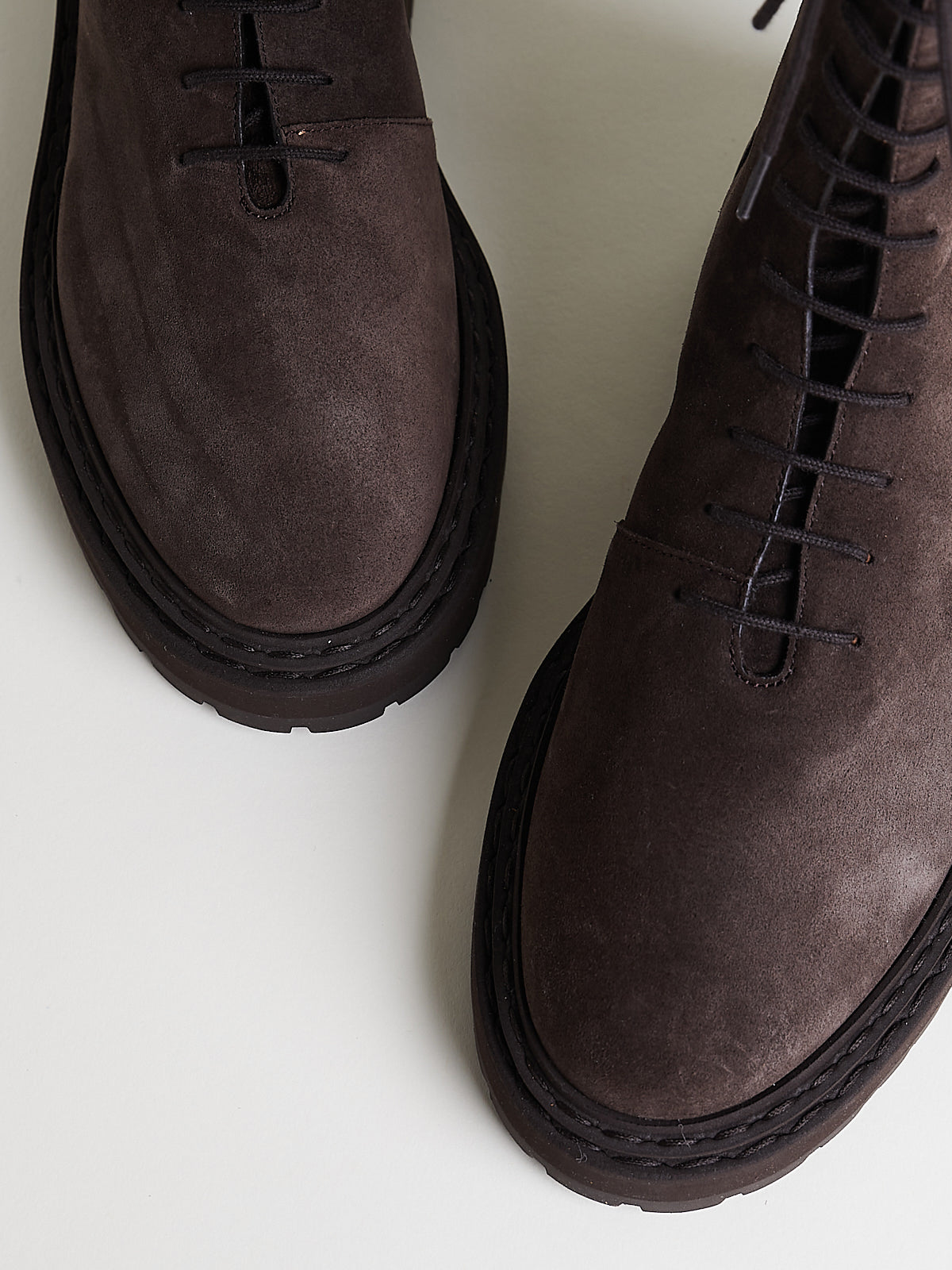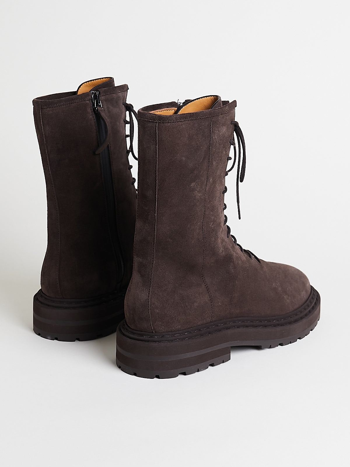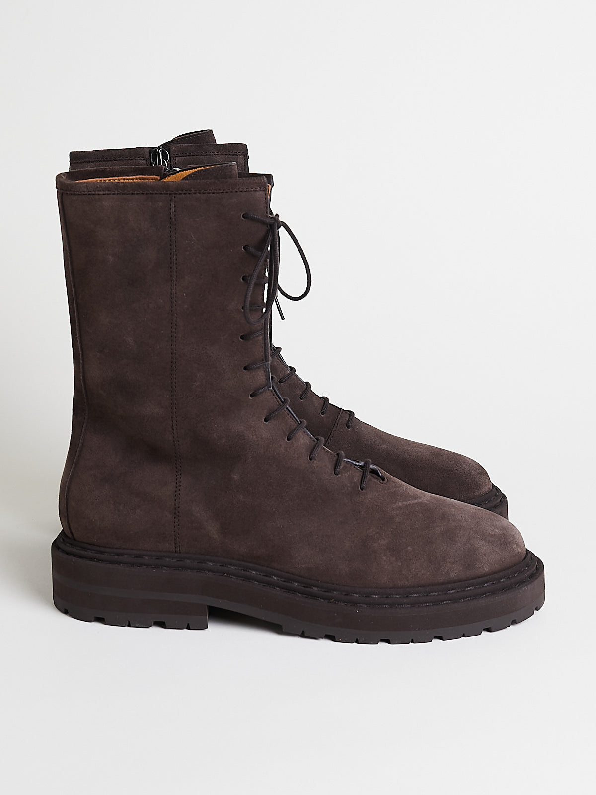 Combat boot with a dark brown suede upper. Lace-up detail through the front and toggled zips to fasten on the inside. Round toe and a chunky brown rubber tread sole. Tonal stitching detailing around the sole. Lined in nude leather.