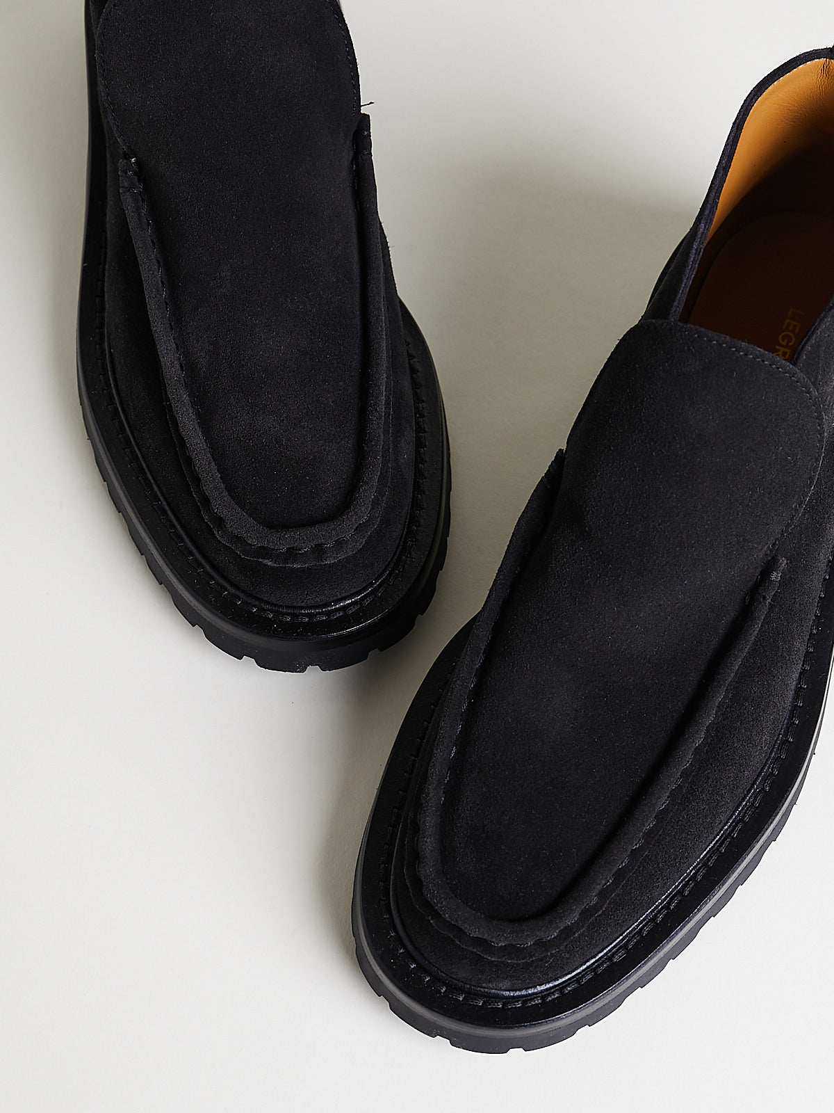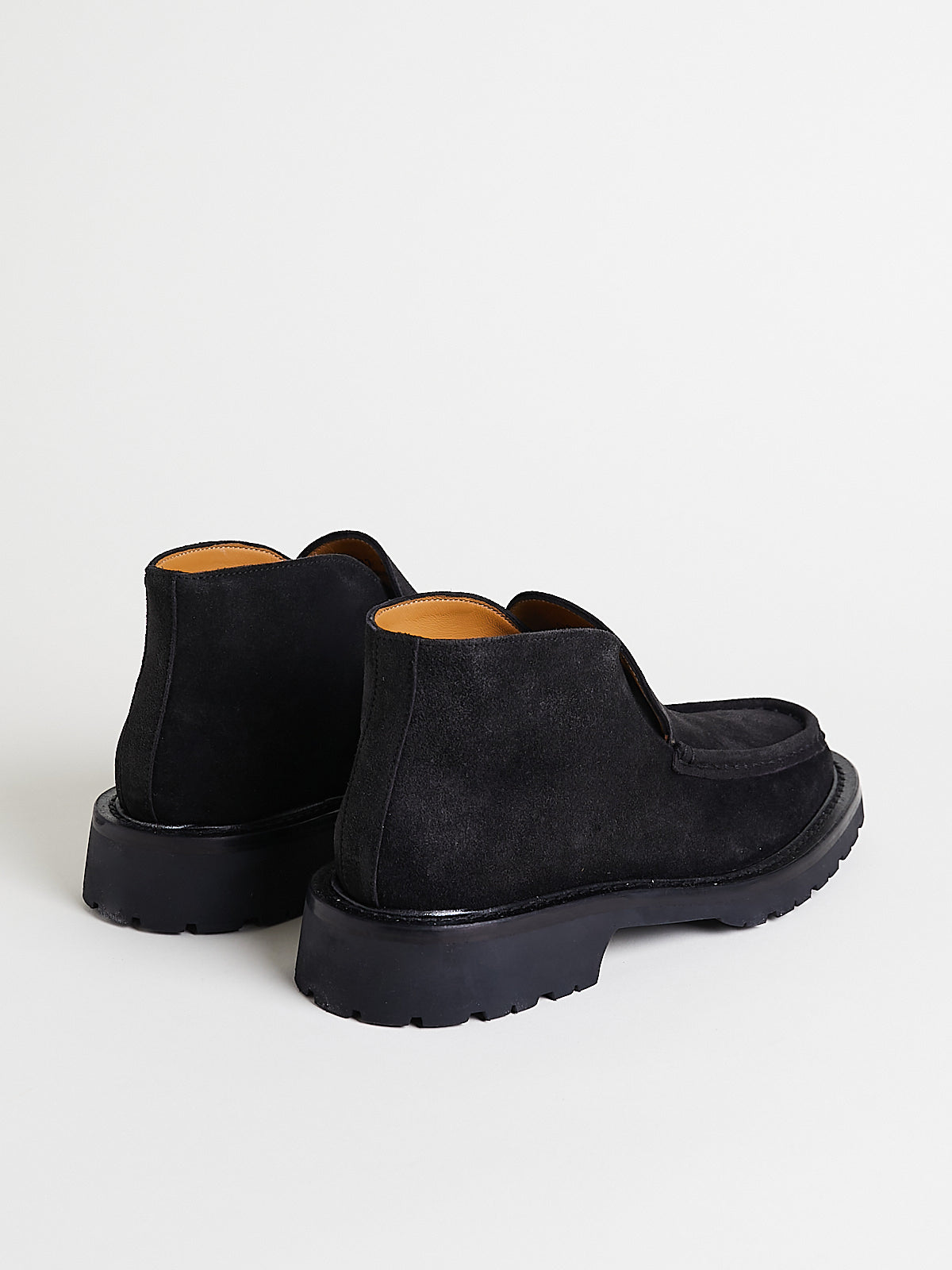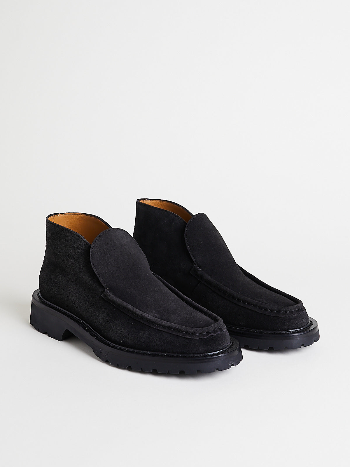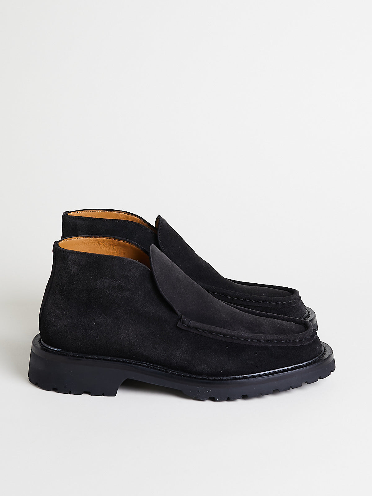 Mid-top loafer in black suede. Cap toe, piping detail with contrasting stitching around the vamp. Features a chunky black rubber tread outsole with tonal stitching. Lined in nude leather.