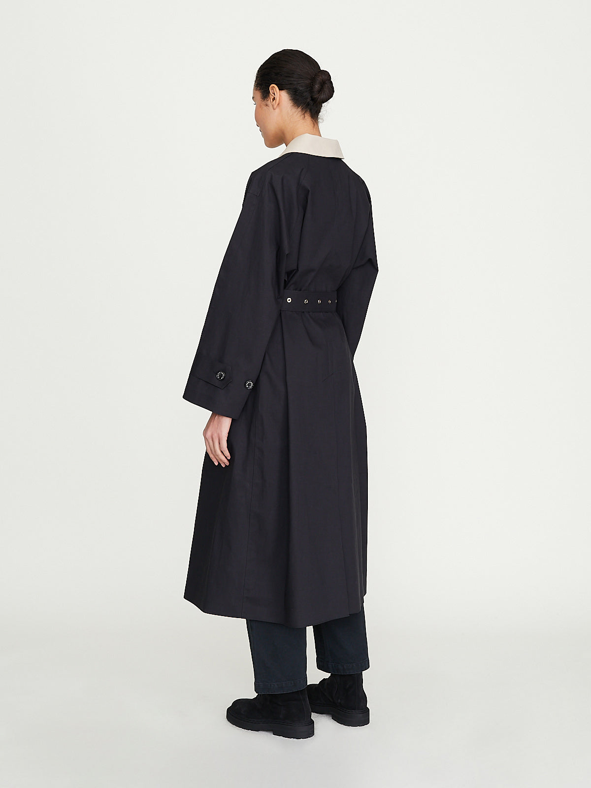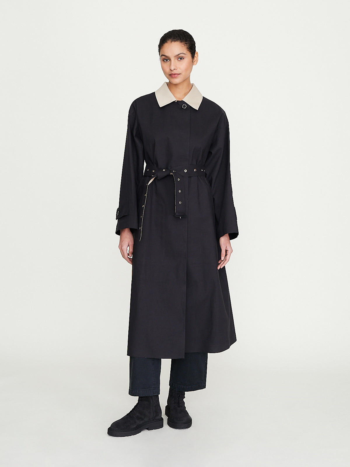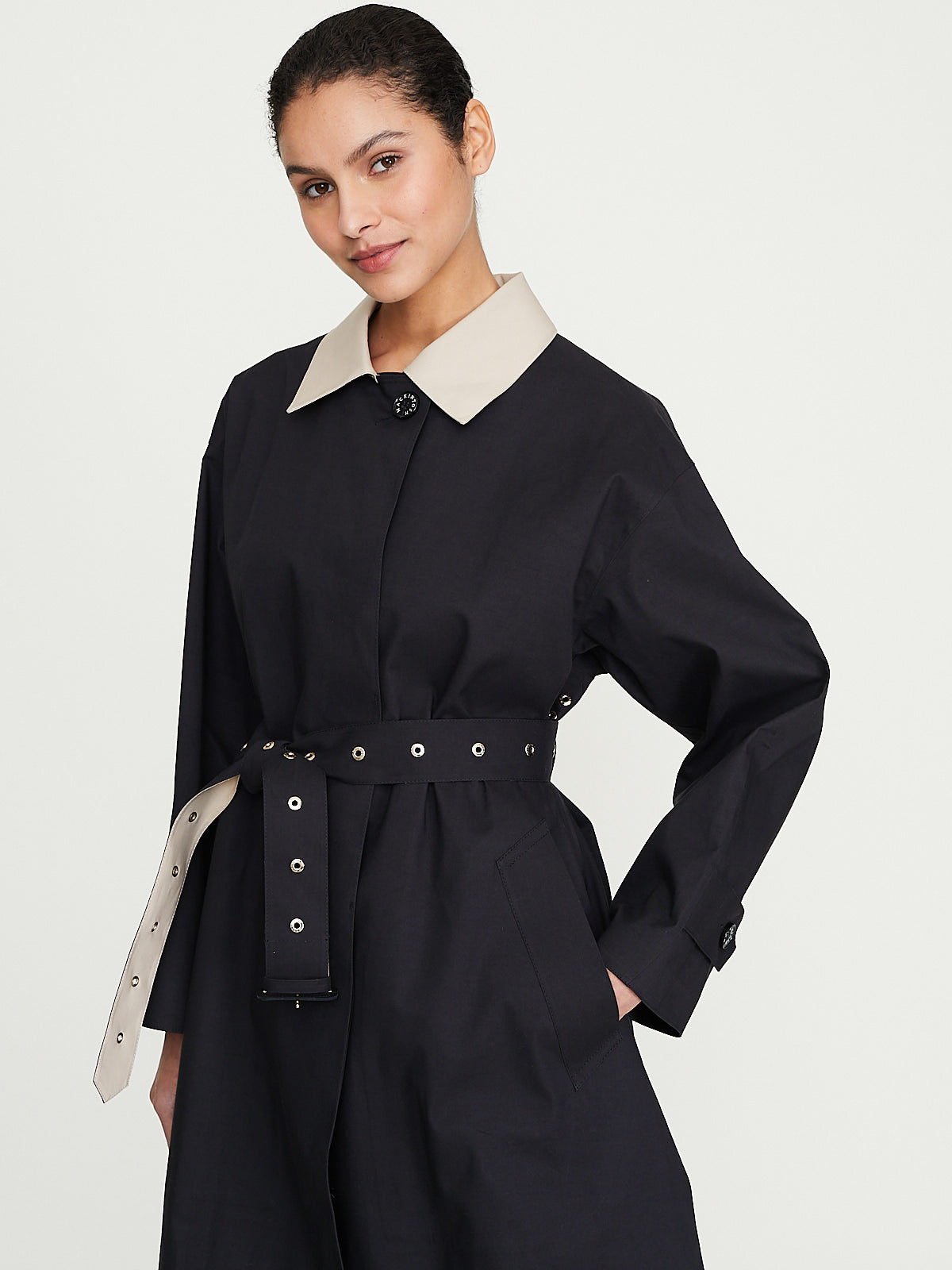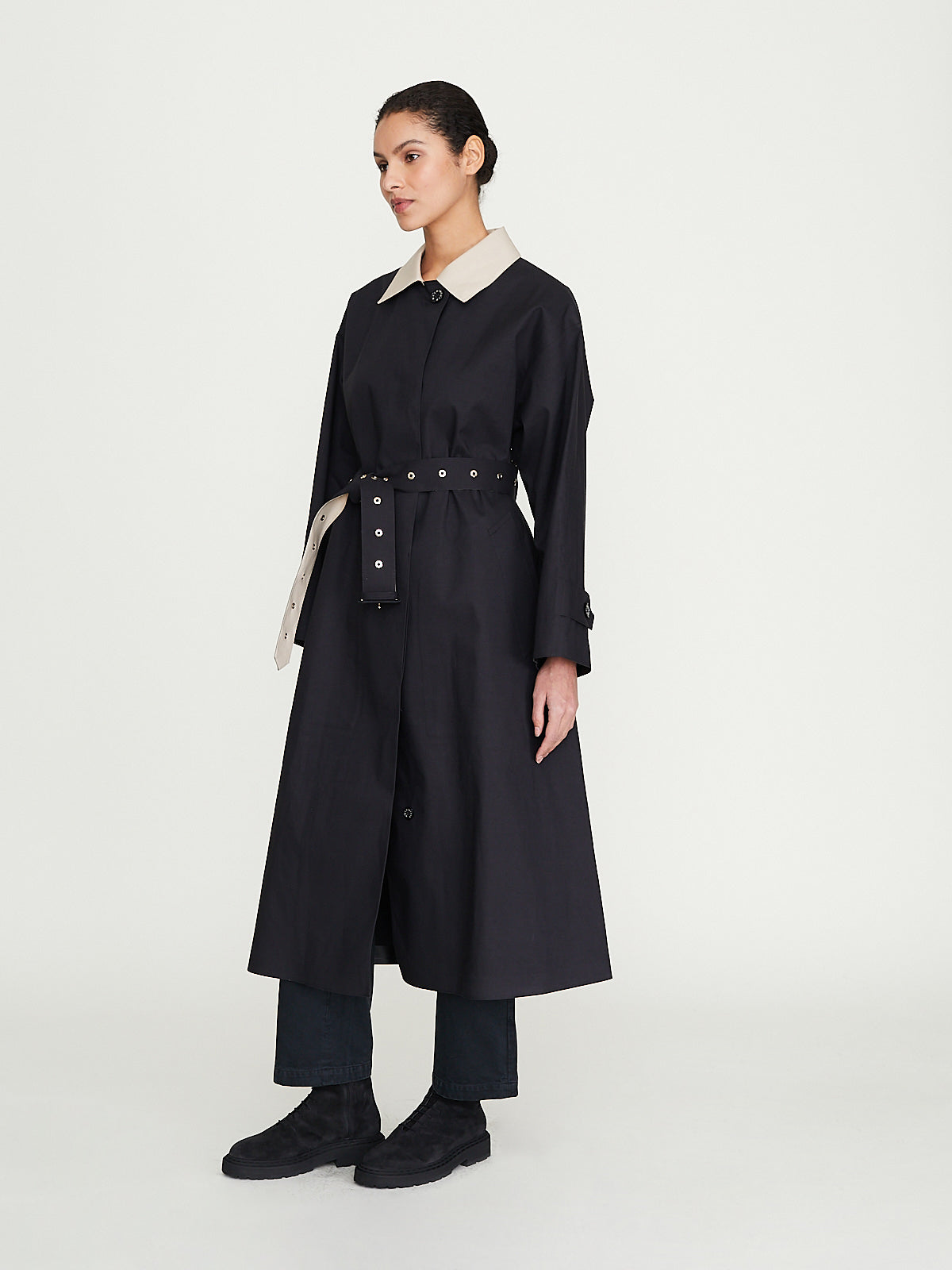 Handmade oversized long belted coat in black waterproof bonded cotton with hand-taped seams. Contrasting beige spread collar, concealed front button fastening and long sleeves with belted cuffs. Welted pockets on the front. The belt is reversible with contrasting beige on the other side. A-line silhouette and maxi length. Back vent.