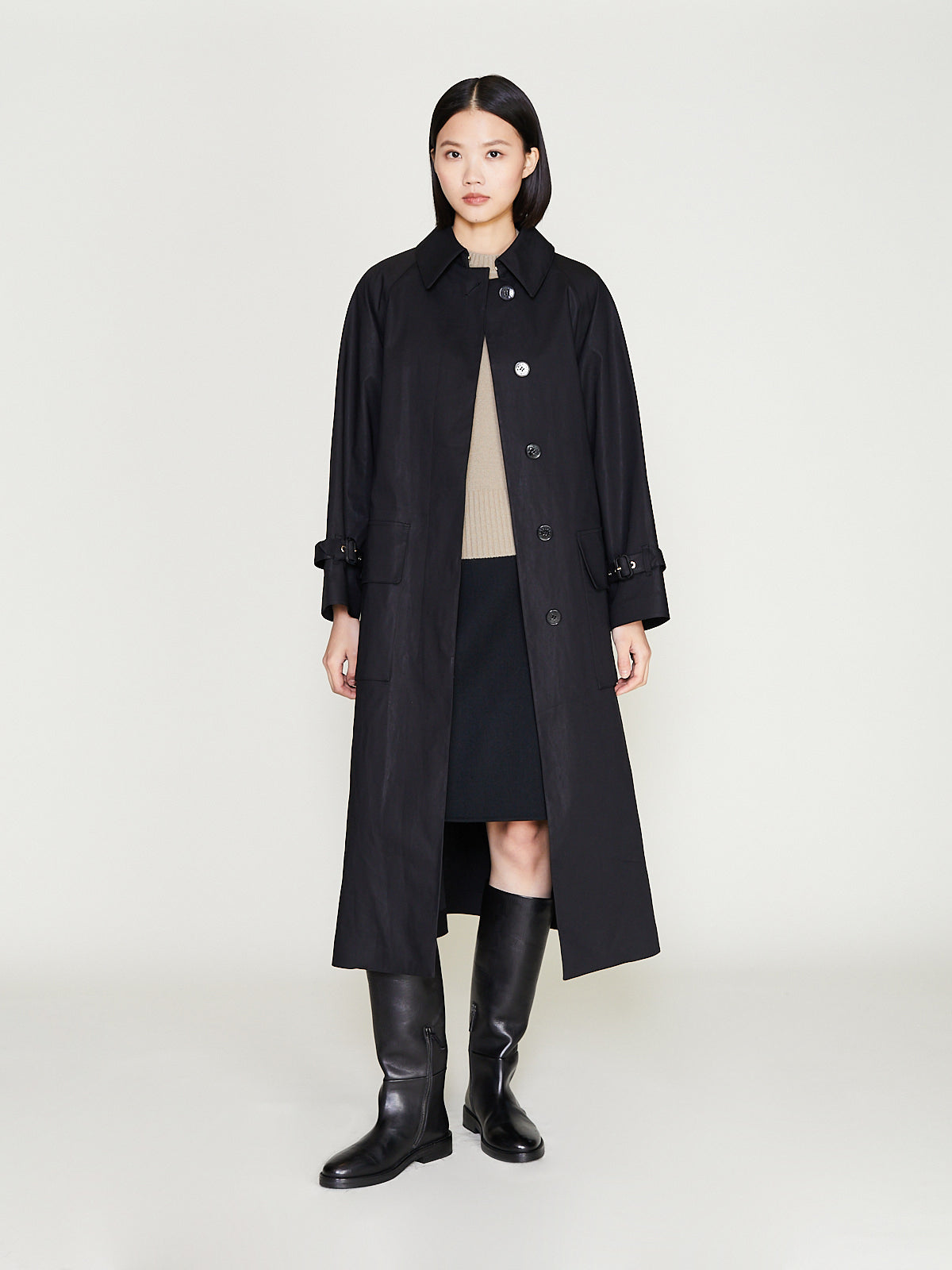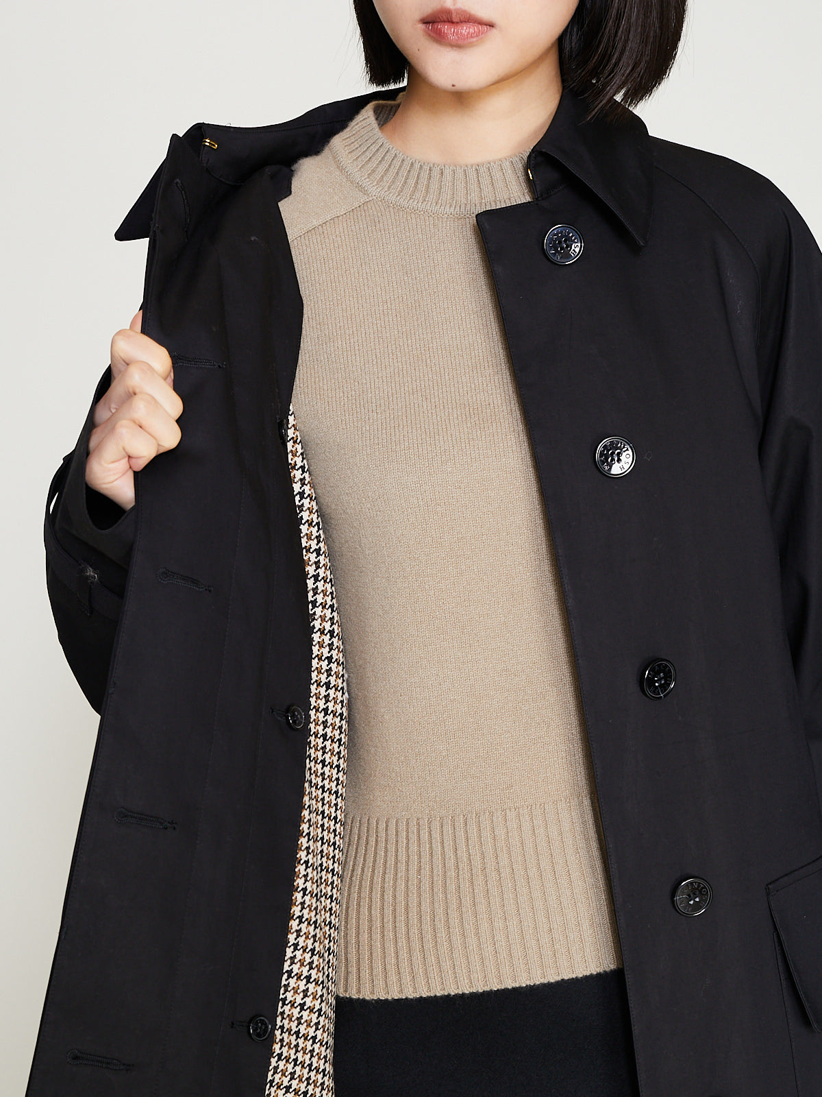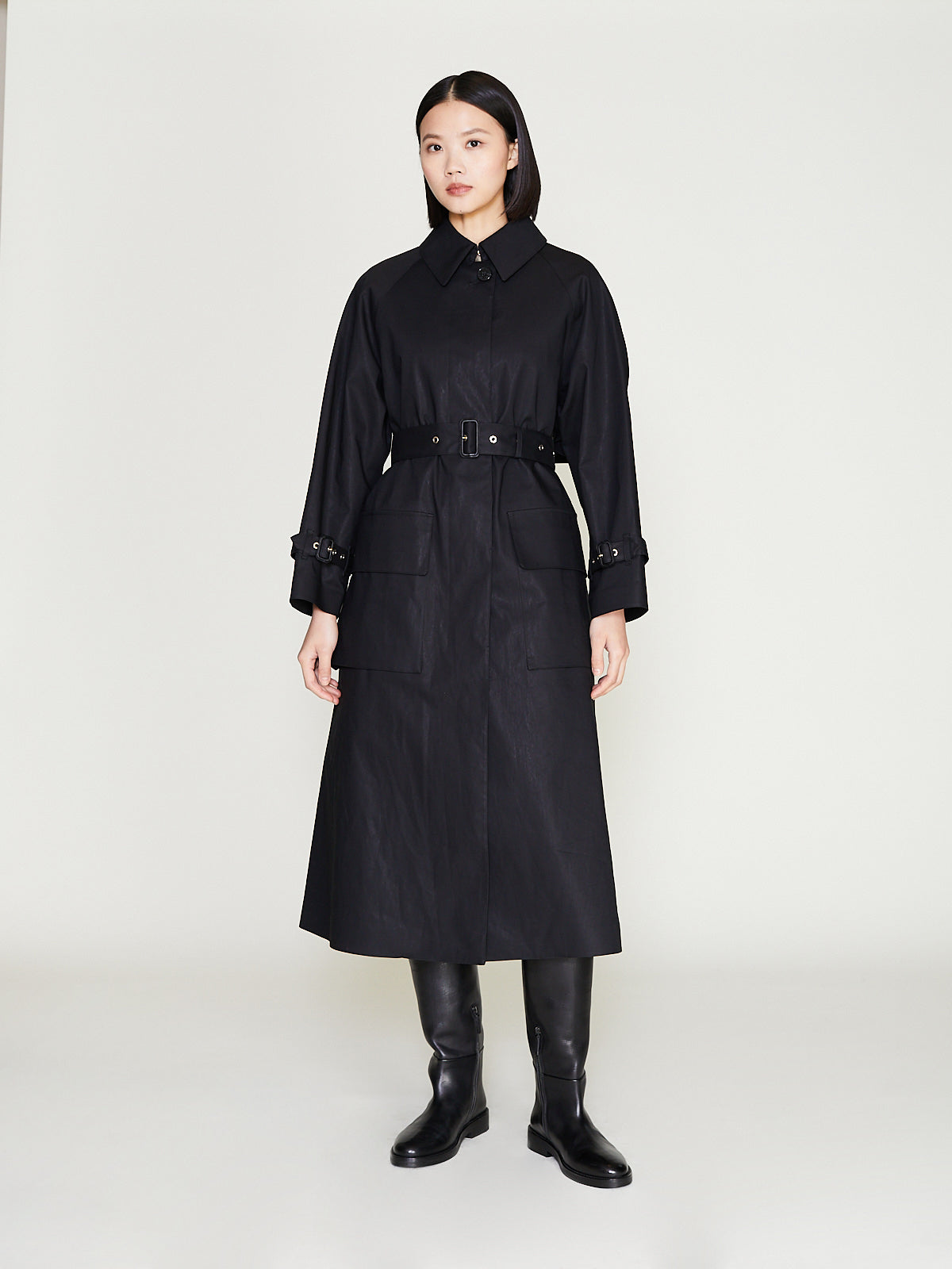 Classic trench coat crafted from black Raintec® fabric that is bonded between two layers of premium cotton that is both waterproof yet breathable. Large spread collar, concealed front button fastening and long raglan sleeves with belted cuffs. Large patch pockets on the front with a flap closure. Features an umbrella yoke at the back and a back vent. Cinch the silhouette with the removable belt. Comes with a detachable liner made of soft tweed with an English houndstooth pattern, making it suitable for all seasons. Fully taped seams. Relaxed fit.