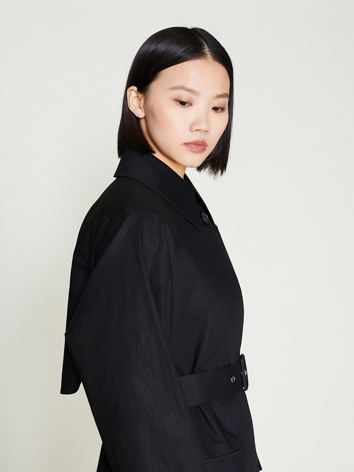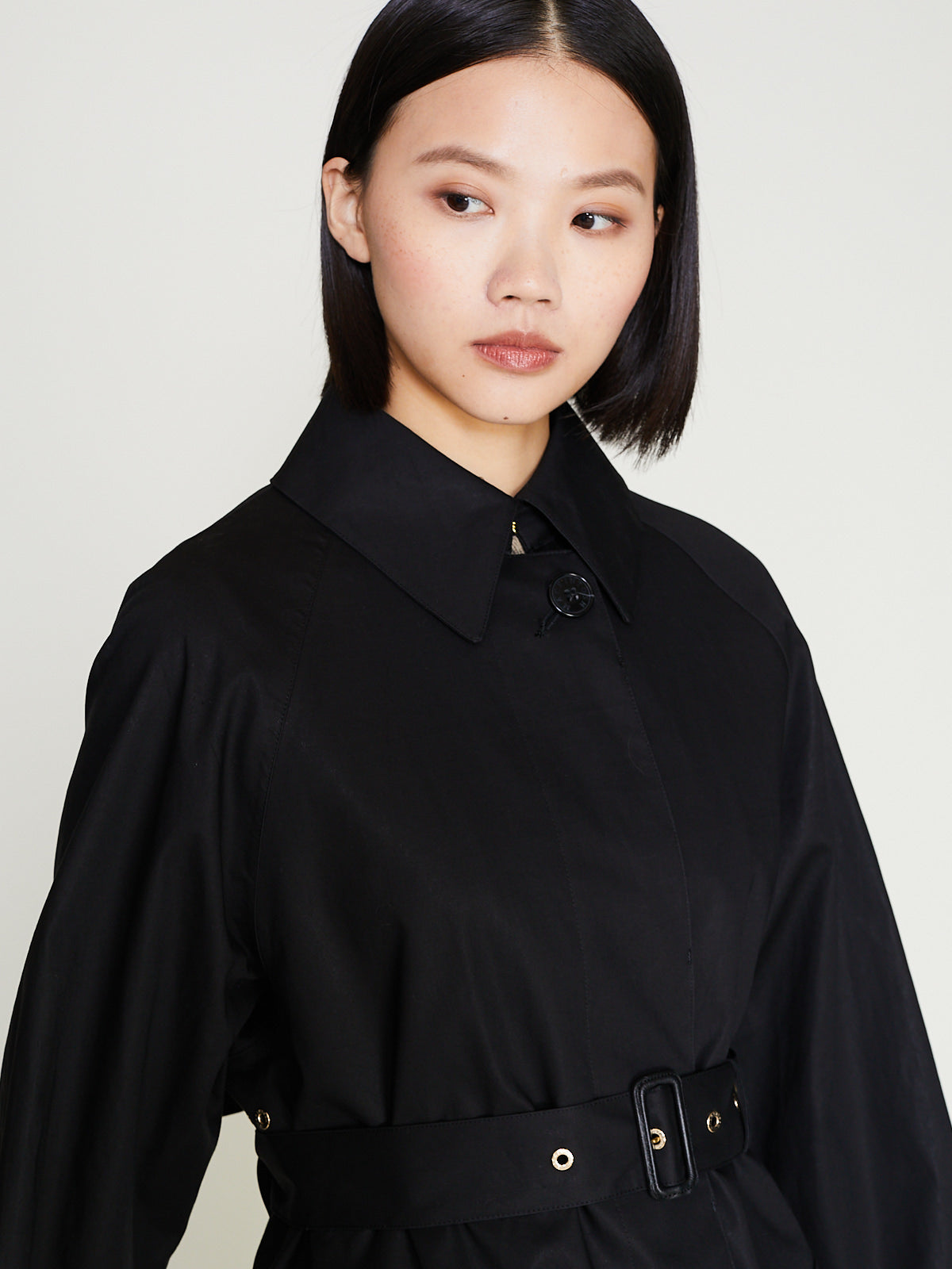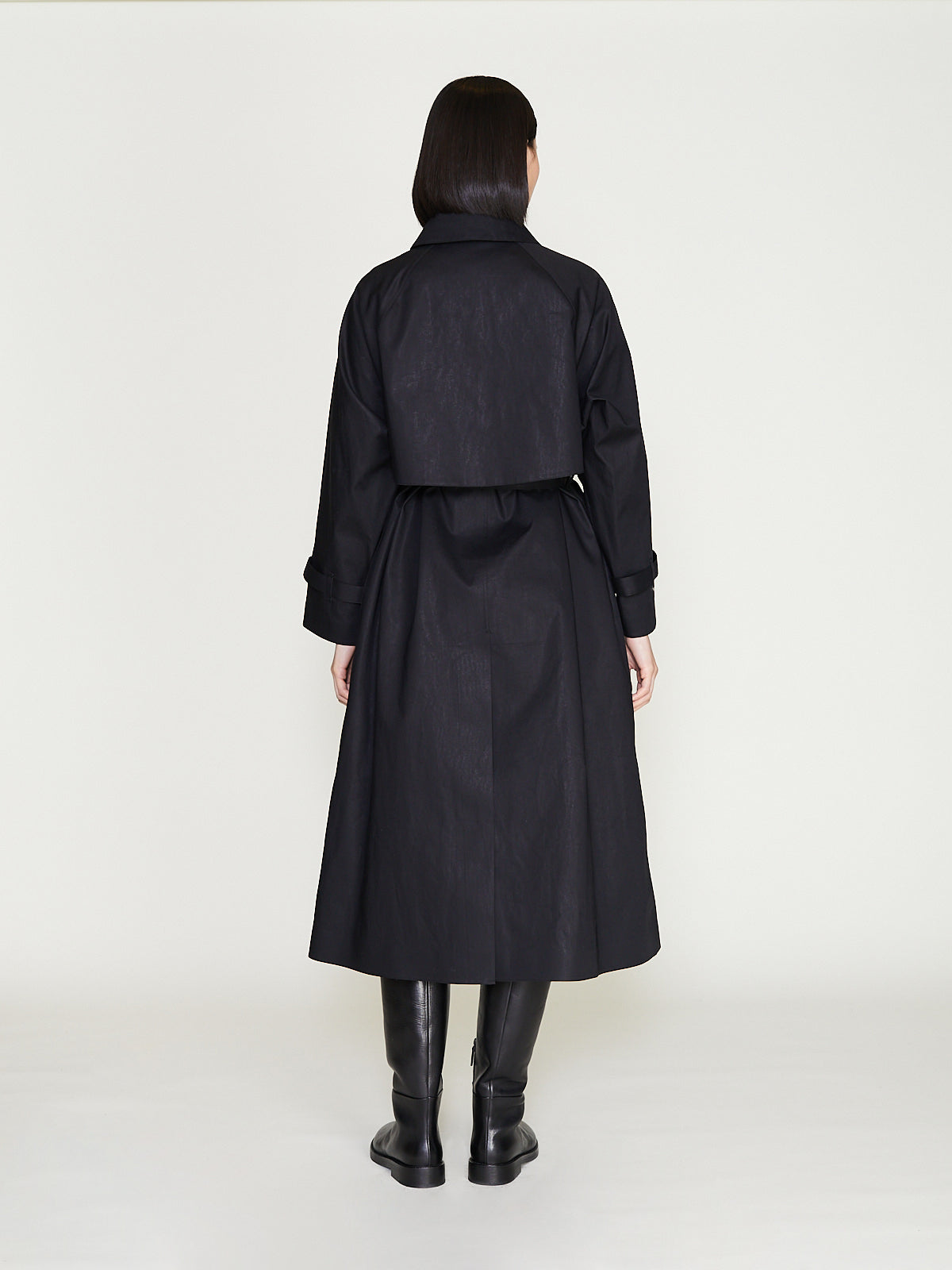 Classic trench coat crafted from black Raintec® fabric that is bonded between two layers of premium cotton that is both waterproof yet breathable. Large spread collar, concealed front button fastening and long raglan sleeves with belted cuffs. Large patch pockets on the front with a flap closure. Features an umbrella yoke at the back and a back vent. Cinch the silhouette with the removable belt. Comes with a detachable liner made of soft tweed with an English houndstooth pattern, making it suitable for all seasons. Fully taped seams. Relaxed fit.