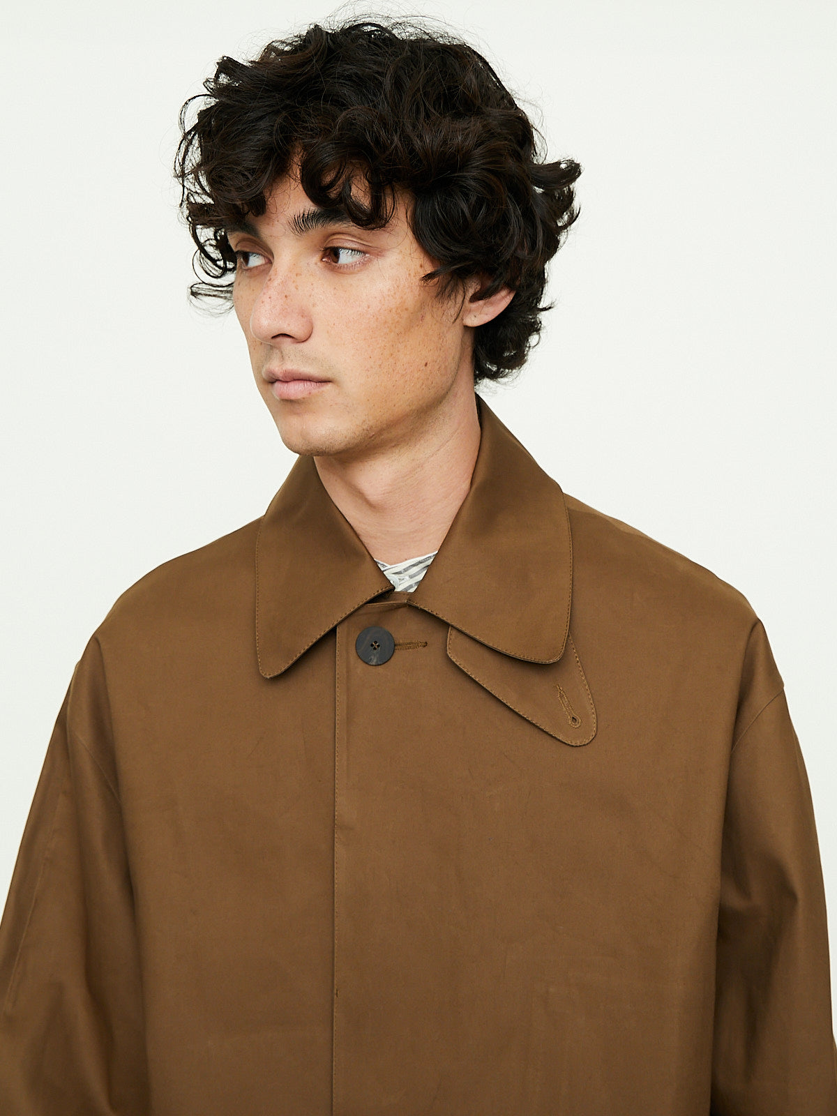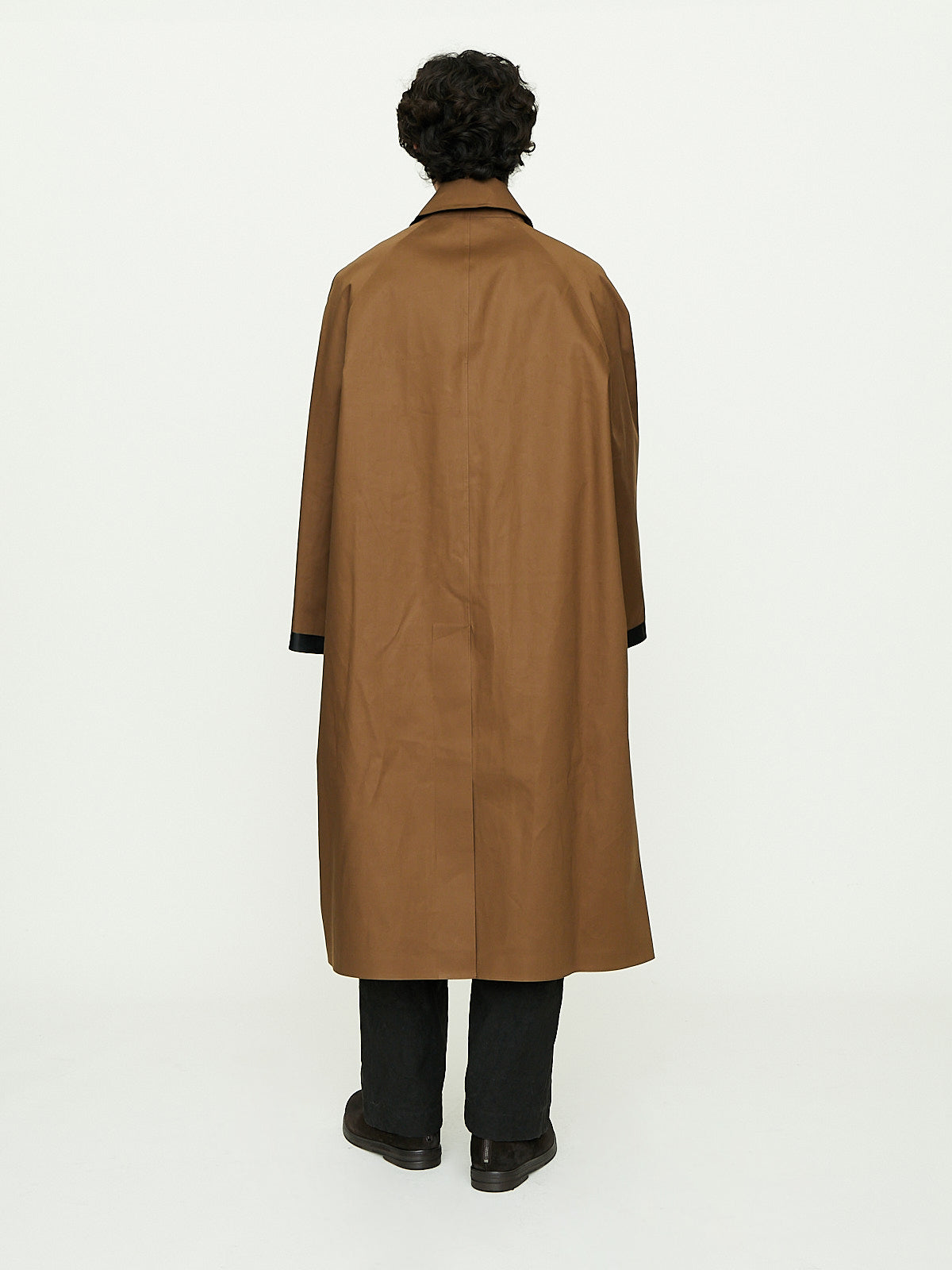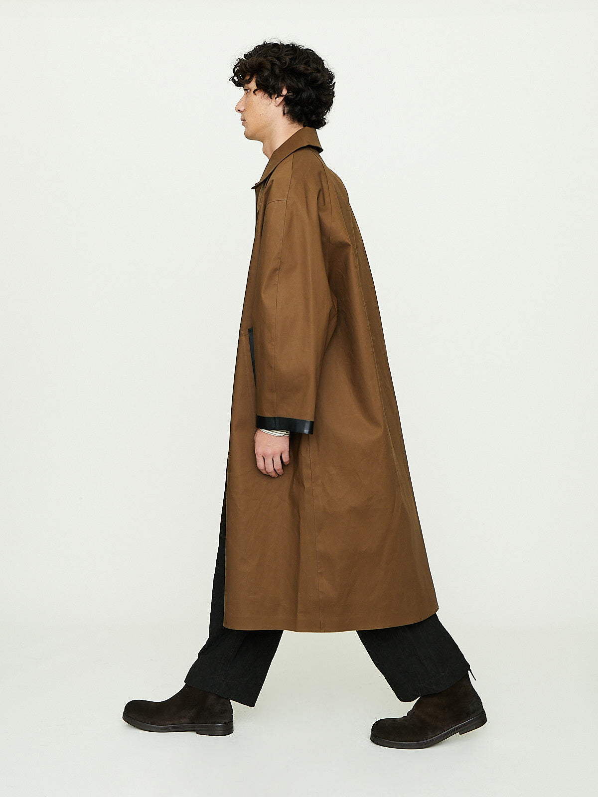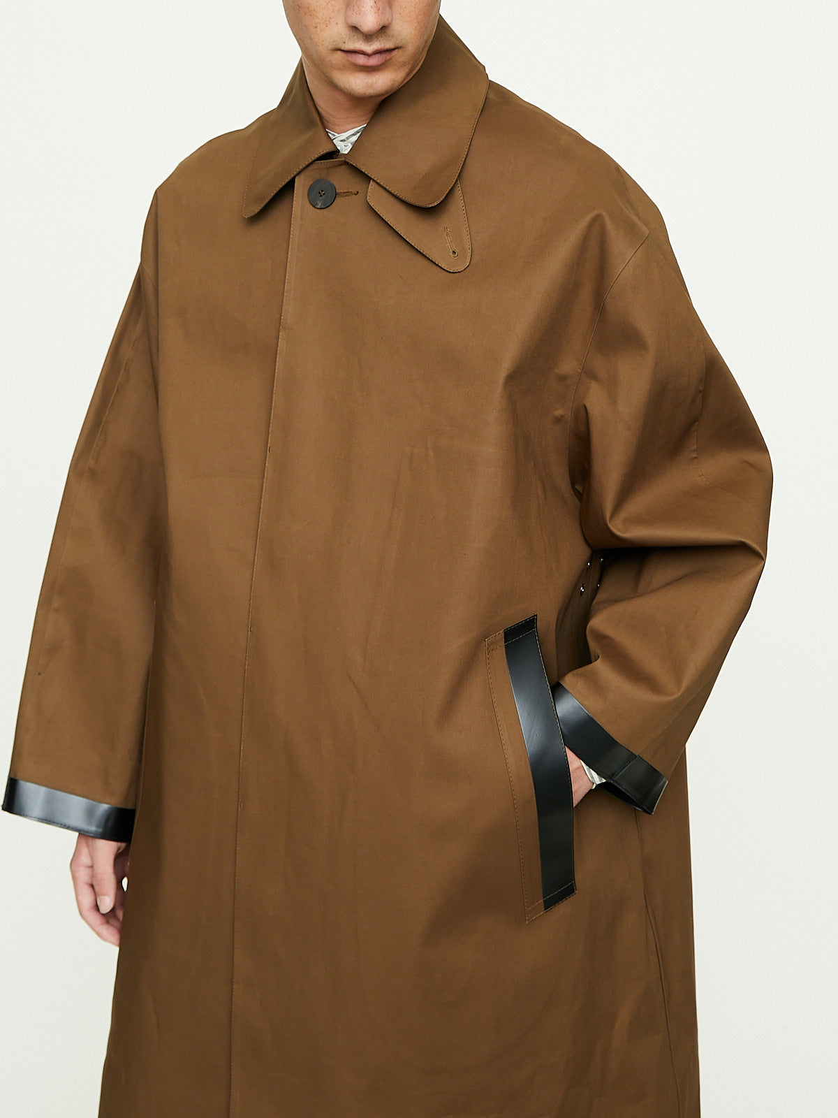 Oversized long coat in brown rubberised bonded cotton: a hard-wearing fabric comprised of two layers of high-quality cotton bonded together to create a fully waterproof finish. Spread collar with a throat guard and a concealed front button fastening. Welted slip pockets on the front and a back vent. Features black hand-taped seams throughout. Unisex.