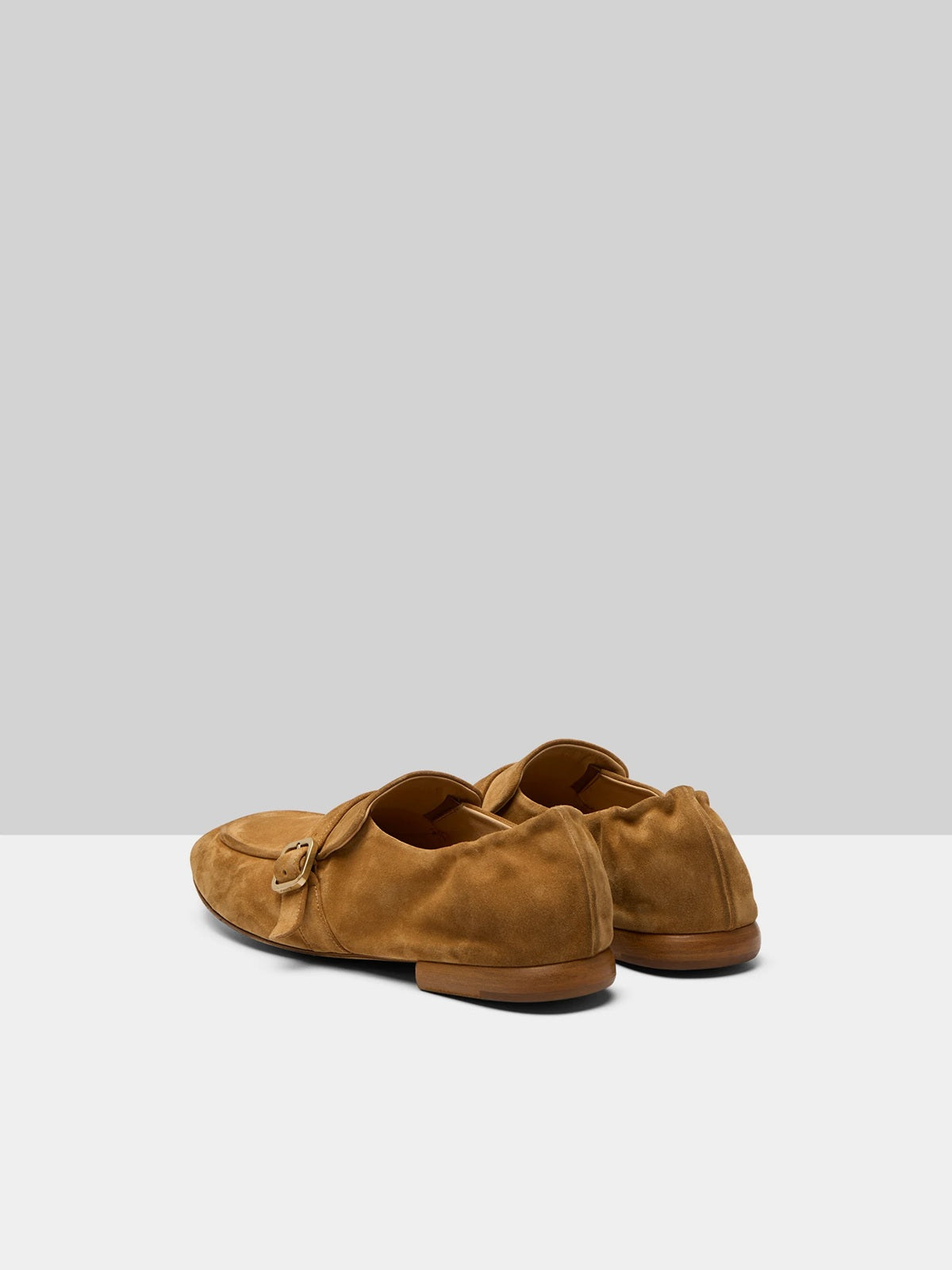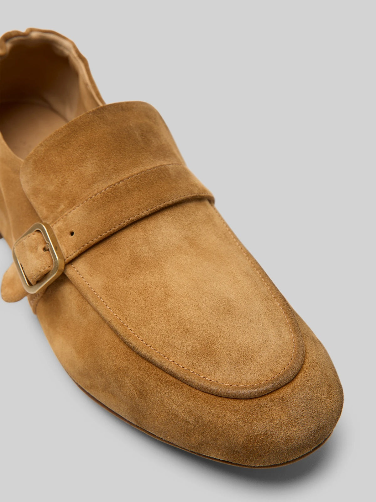 Elegant loafer in tan brown super soft calf suede. Rounded toe with a belt and buckle detail on the vamp. Curls up on the heel for maximum comfort and grip and features a thin leather sole.
